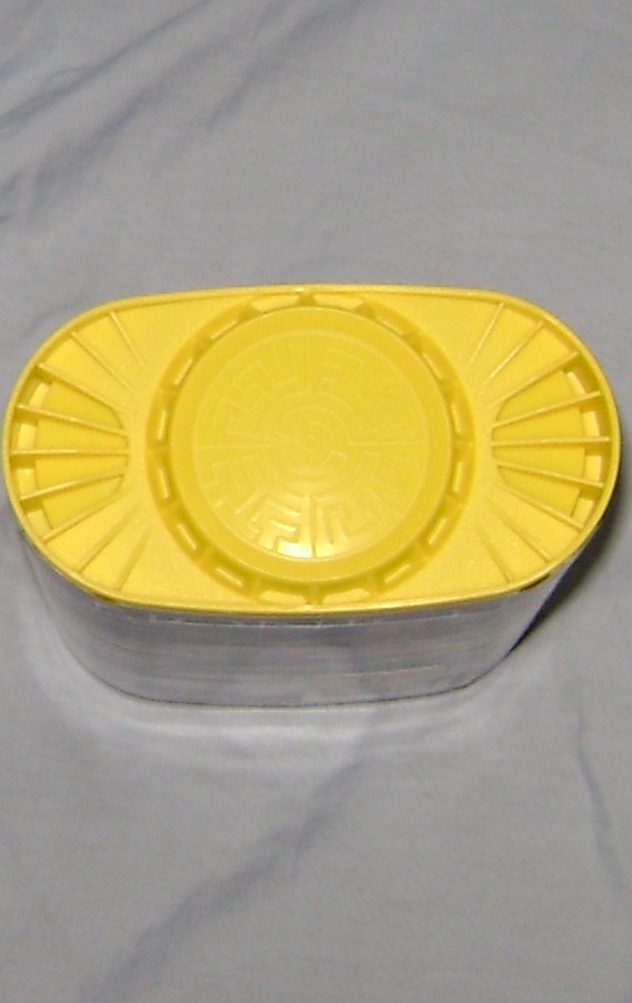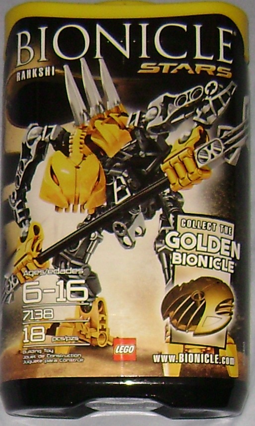 The front of this cannister shows our little rakish in a menacing pose, and the specific gold part contained inside to complete the golden BIONICLE®. The sticker on the back of each Star cannister depicts the same thing, the Tahu Star set armored up with the gold parts, making him the Golden BIONICLE. Unfortunately, the gold parts are the only spare parts from each set, meaning you do not get a part of Tahu from each set along with the gold colored part, you have to buy Tahu and then replace each piece of his armor with the single gold part from each of the other cannisters, and slap on the little golden shield in his empty hand. Rakish actually has the one gold part that does not replace an existing part on the Tahu Star set, but pops into Tahu’s empty hand as a shield.