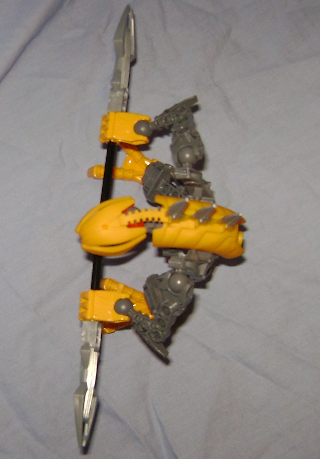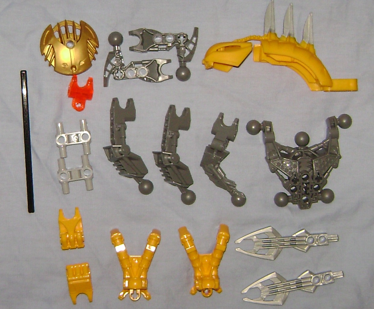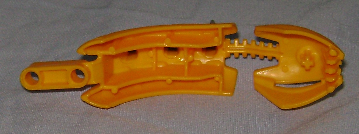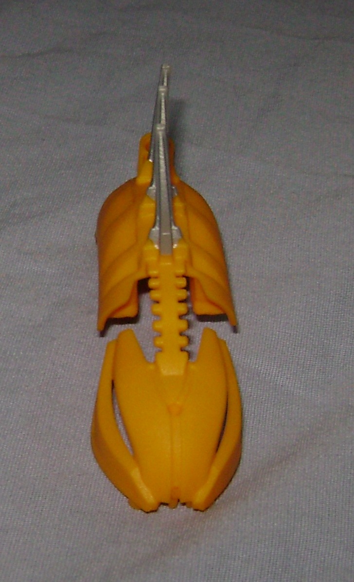 Theres only one new part in this model, unless you count recolors. The yellow rahkshi head/spine is a single rubbery mixed color part. I like the tethered head, but I think I would have preferred that they gave us a separate head and found another way to bolt the spine to the body, or for that matter used the older parts from the original rakish in the new colors. The shell seems to have been born of a shortcut, making a prefabricated part to replace using a slew of smaller parts that would not be very compatible with these newer less complex pieces.