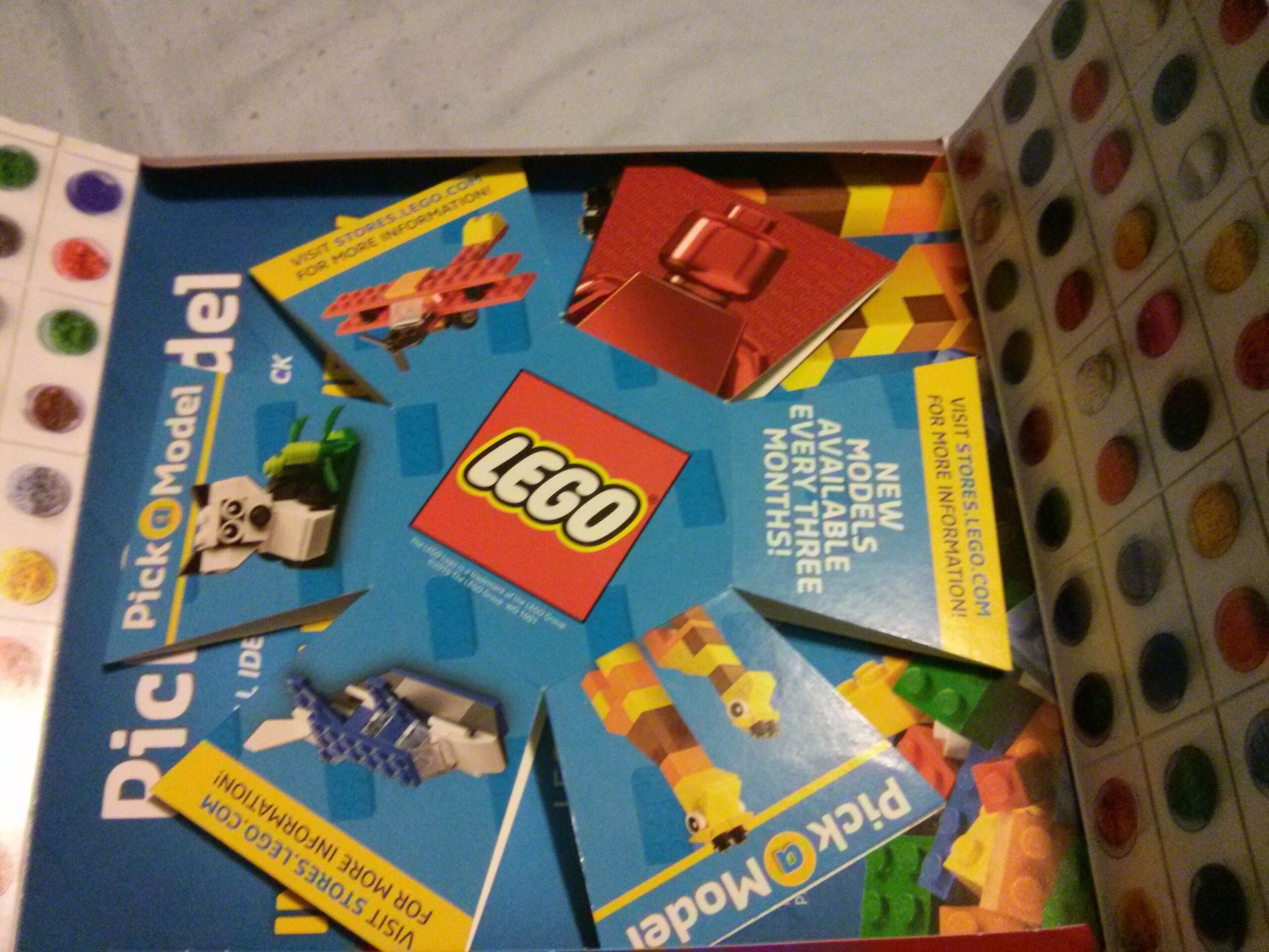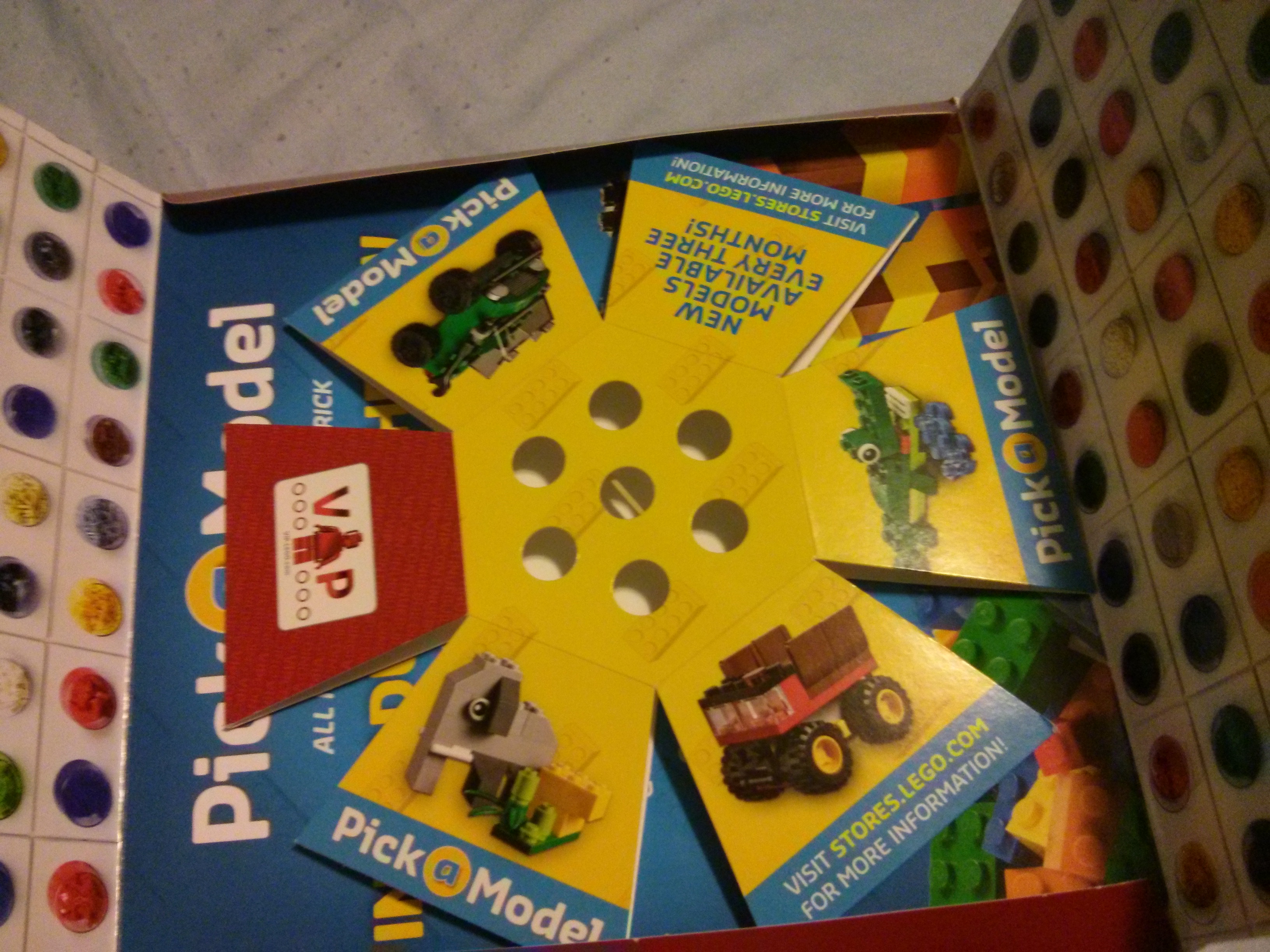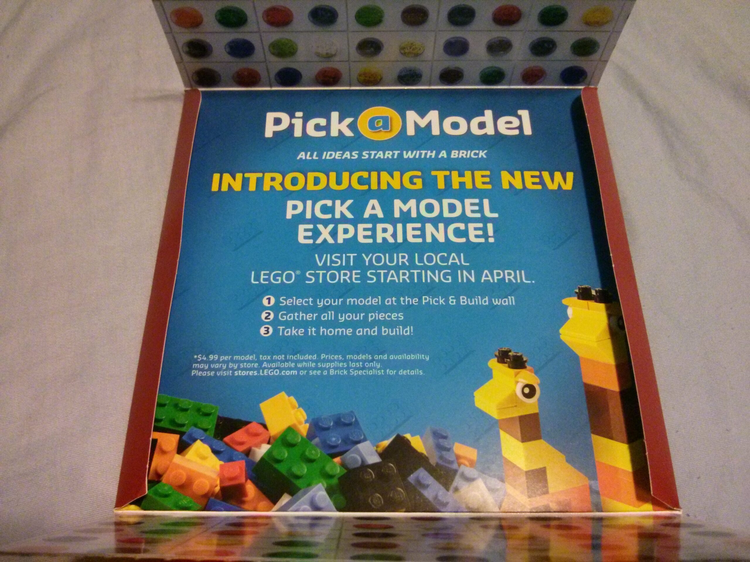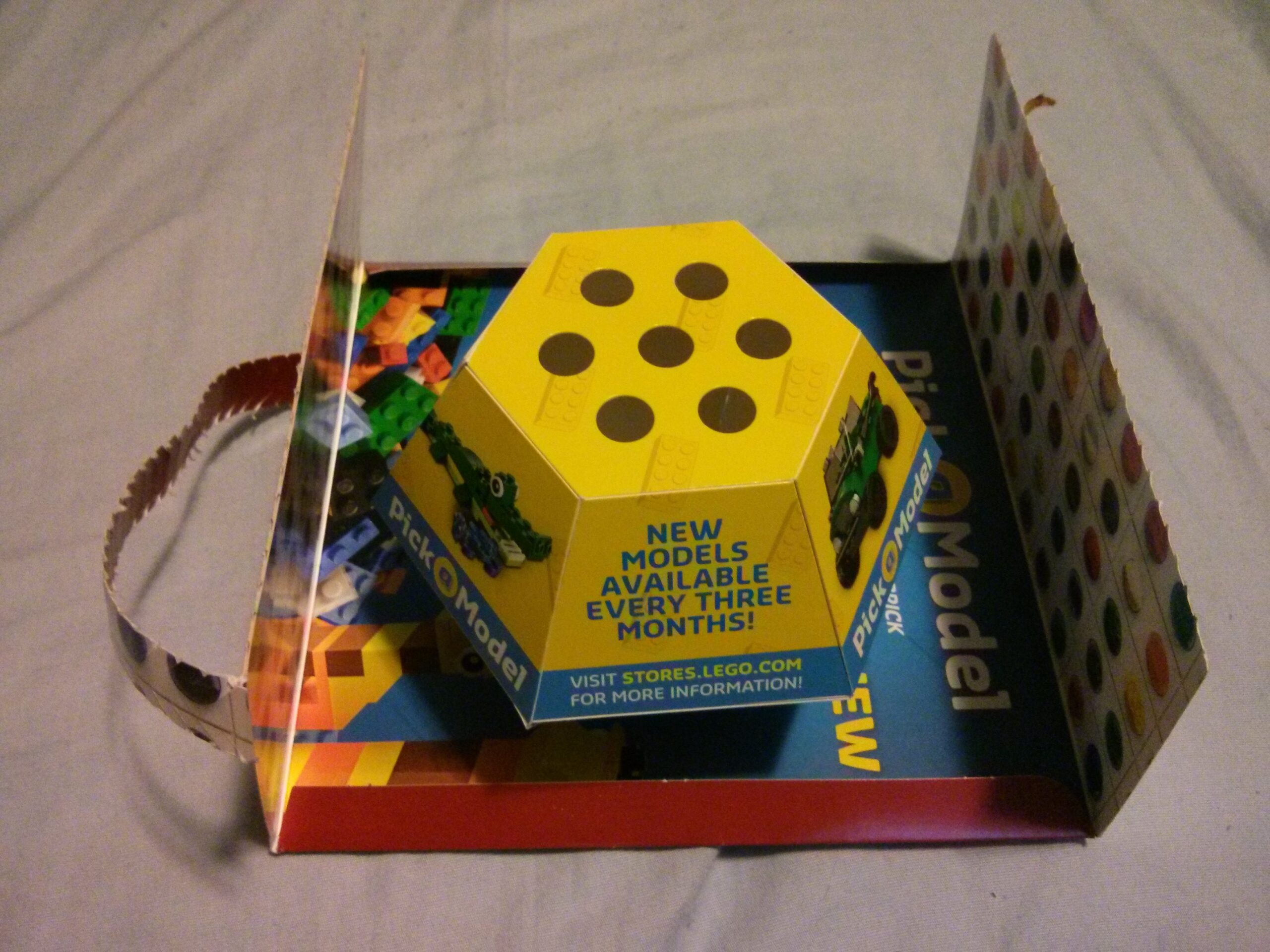 With some papercraft sorcery and a rubber band, the marketing department at the LEGO® Company has created a 14 sided spherical polygon that self assembles from a flat-pack form inside the envelope. It snapped into it’s intended form with such force that it launched out of the envelope, giving me a good scare. If you carefully examine the envelope and the polyhedral cardboard, they each have been engineered for the sake of catching you by surprise, one side of the shape even has air holes to allow it to take shape more quickly, or so I think. Maybe I was surprised a little more than was intended, but clearly The LEGO Company wanted to make sure you didn’t forget about this new pick-a-brick feature.
