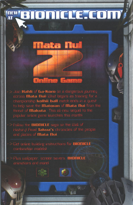 The comic has returned to its smaller dimensions, no doubt the result of some evil gravity-enhancing scheme of NUHVOK-KAL. The center-spread touts the BOHROK-KAL MINI-CDs. The final pages are devoted to BIONICLE.COM , the “Search for the 7th TOA” contest, and a new summer van tour!