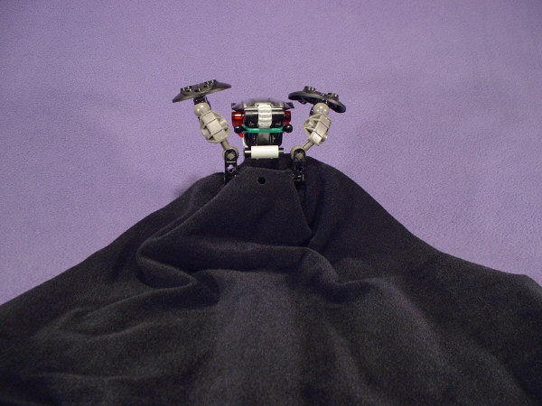 I debated using a solid black faceplate, but while that worked nicely for the NOAOKE BOHROK, I felt it would look too sinister for this MOC. I also thought about using a red VU to match the eyes, but it didn’t really fit the look. The biggest problem was figuring out how to attach the cape. Once I came up with that idea, I wasn’t willing to abandon it, but my original thought was to hook it to the black towballs that hold the green elastic band, and I discovered that they’re too far apart to fit into the holes on the cape.