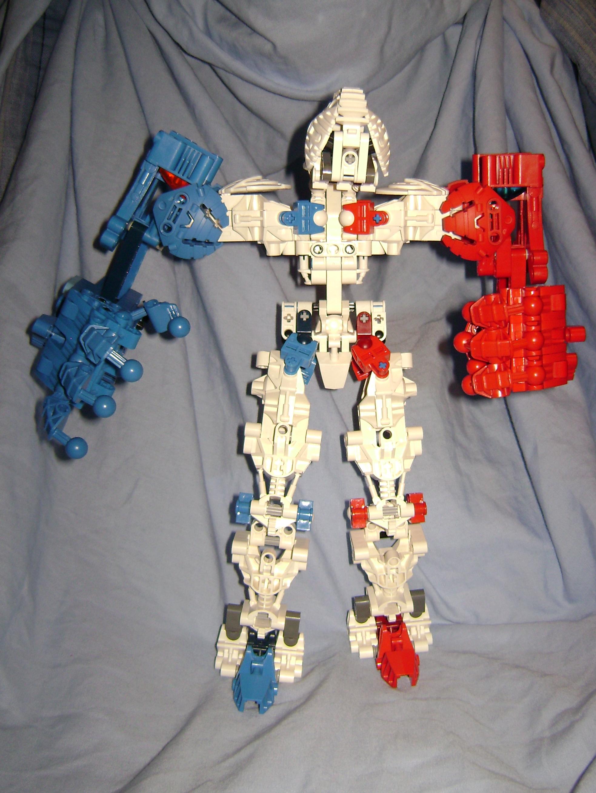 Each arm has a tab on the back that you can push to make it punch. The red arm punches higher for an uppercut, while the blue arm is more of a foward punch. You might want to take a look at how the pair of toa metru torsos were used to build the shoulders, its pretty sturdy once it’s reinforced.