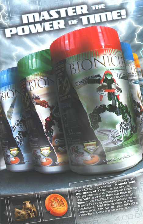 The inside back cover features the Target-exclusive VAHKI sets coming in December. They include a newly-manufactured VAHI (the mask of time) in a new color and also a KANOKA Disk of Time that features a VAHI picture on the disk and a new KANOKA code.