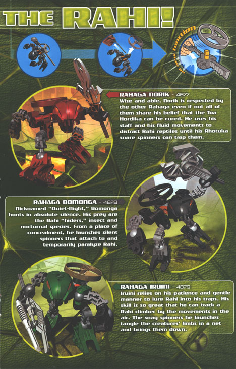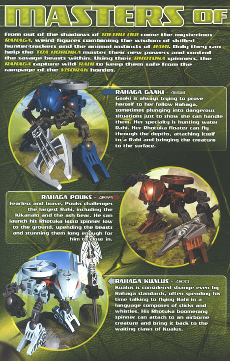 From out of the shadows of Metru Nui come the mysterious RAHAGA, weird figures combining the wisdom of skilled hunter/trackers and the animal instincts of Rahi. Only they can help the TOA HORDIKA master their new powers and control the savage beasts within. Using their RHOTUKA spinners, the RAHAGA capture wild Rahi to keep them safe from the rampage of the VISORAK hordes.