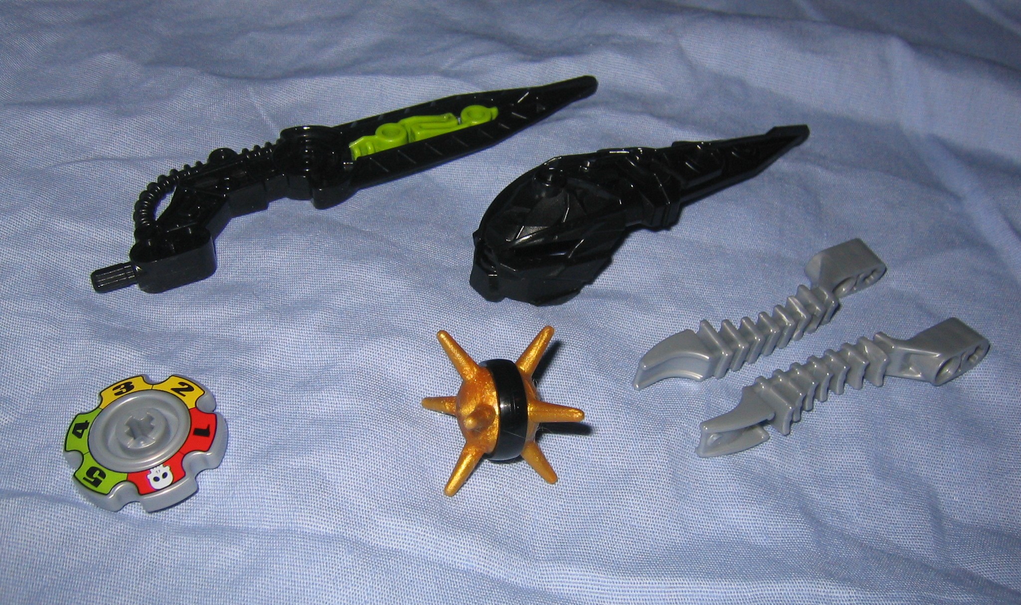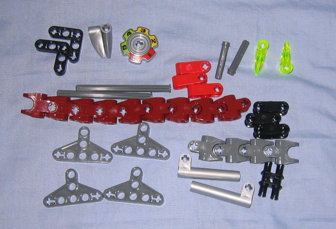Skirmix doesn’t have a whole lot in the way of new parts, but he does give us a pretty good set of parts to work with. As for new parts, we get the thornax launcher and ammo, as well as a skrall tribe helmet and another color variant of the skrall sword, this one being black with green (The other two are black with red and black with glow-in-the-dark material). Of course we also have the “bioniclix” health wheel. Thats it, everything else is an older part, but we do get some older parts in new colors.