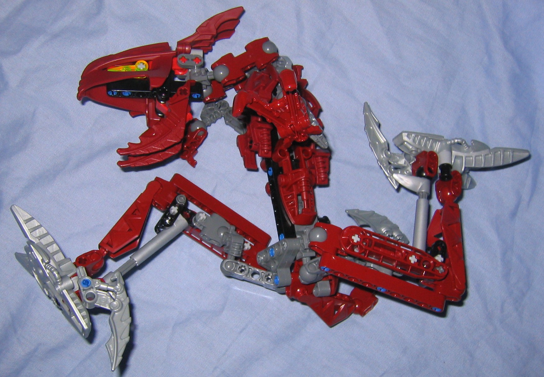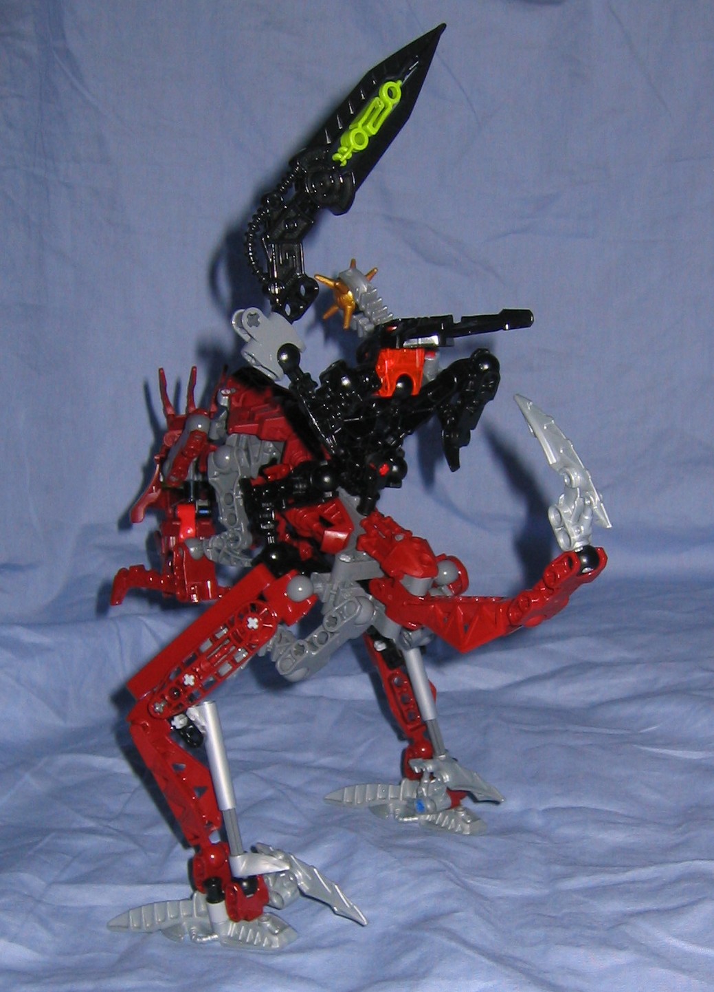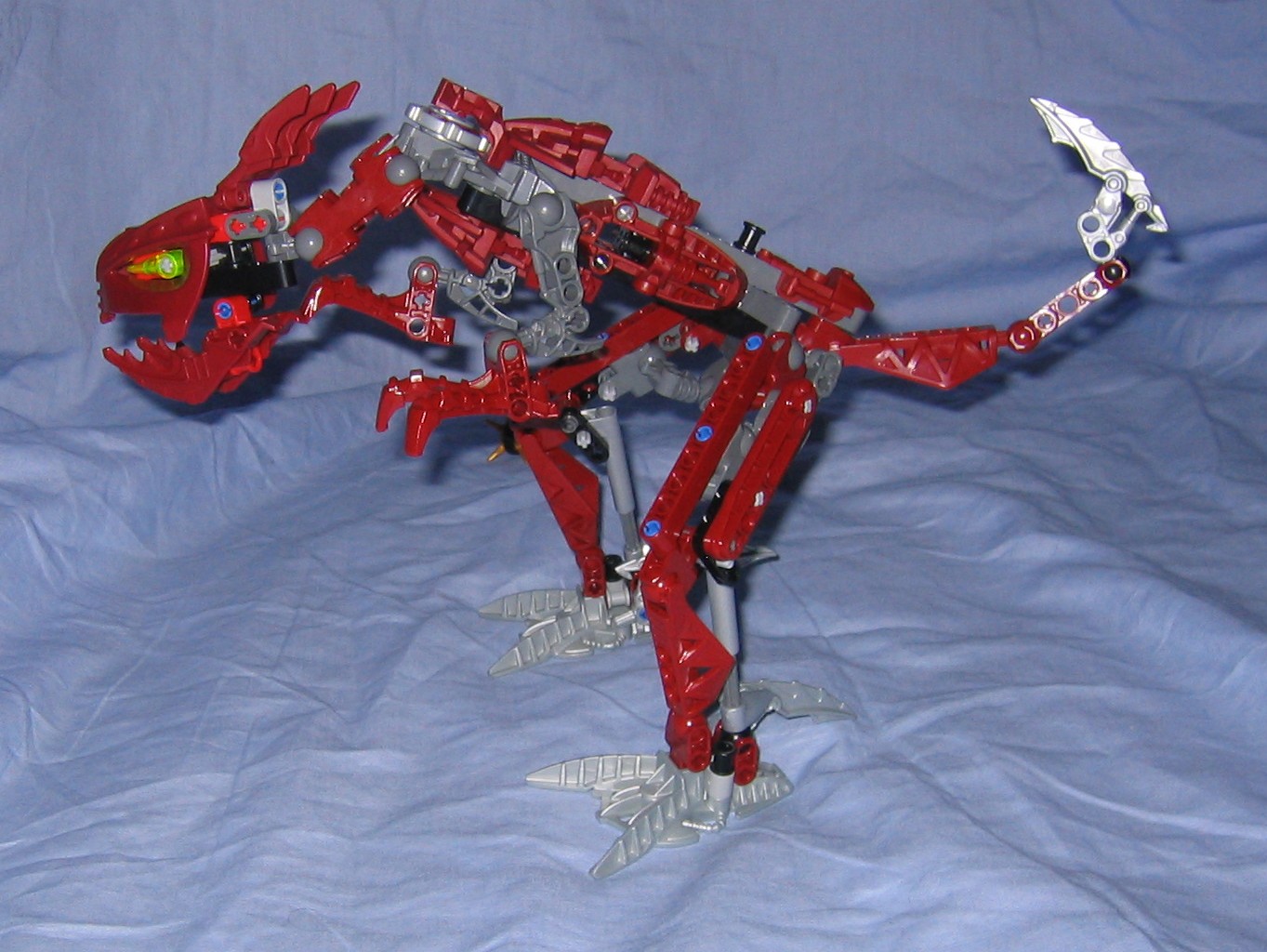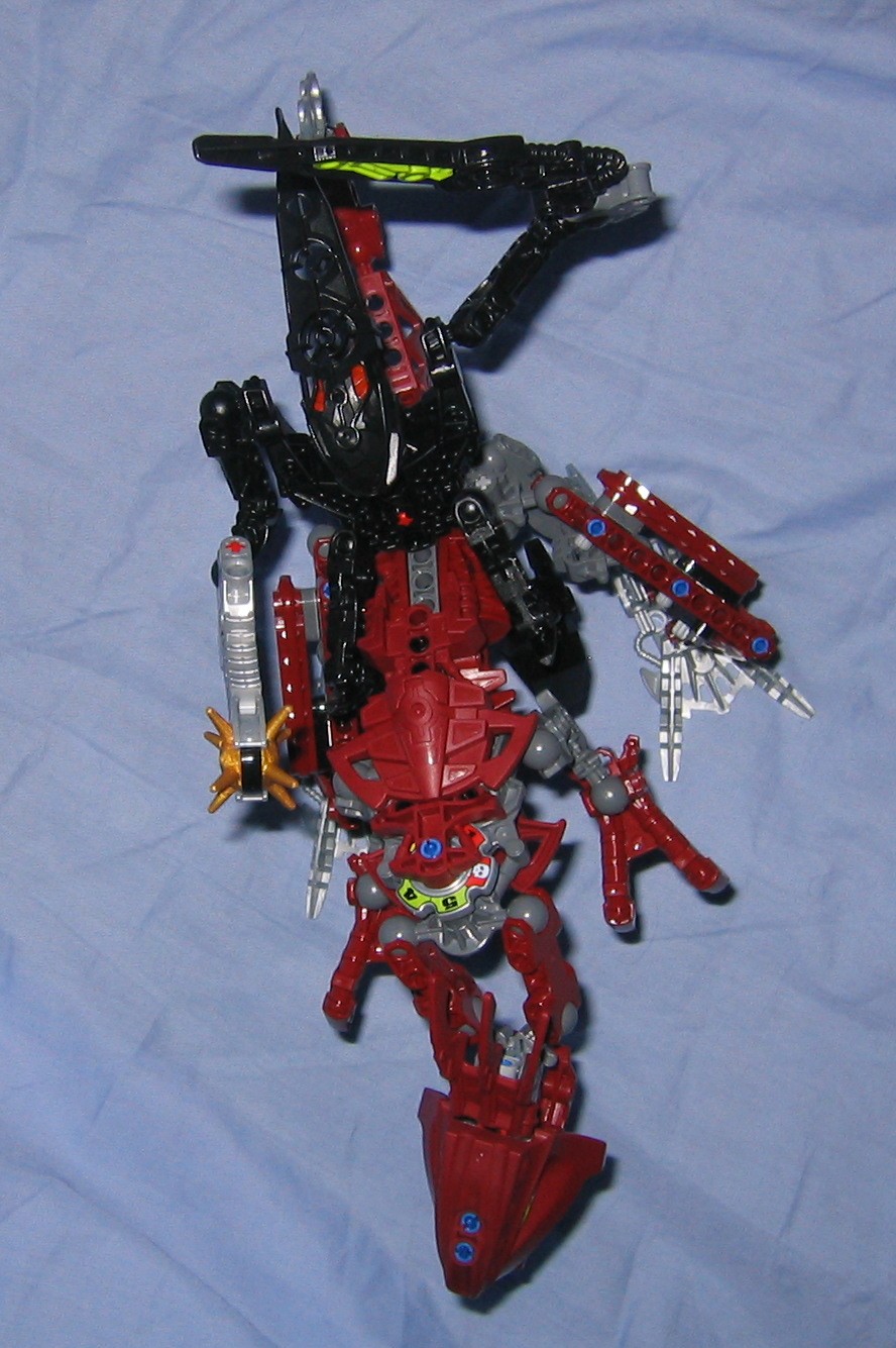 Skirmix seems to be just the right combination of metru red, gray, and silver. It would be nice if they used a silver fenrahk skull to balance the color of the tail and feet into the body, or perhaps even just the two toed feet that make up his hands, but at least the silver looks good where it was placed. Another advantage of a silver fenrahk skull would be that we could use it more easily with custom creations but this limits it to a red colored MoC, but the red skull is necessary for the colorsheme anyway and gives us an alternate color to use when we need it. Putting my interests aside, the gray and red that make up the majority of the model fit together very well, unlike some models where the gray is just this sort of ugly color they threw in to give the model some depth so it doesn’t look like some mass of one particular color. Maybe they could have switched out the silver in the feet and tail for a matching color but at least it seems to fit.