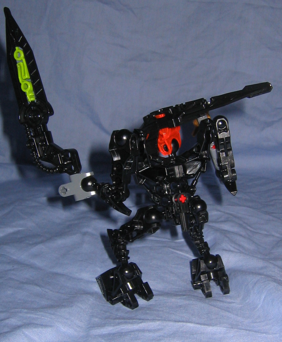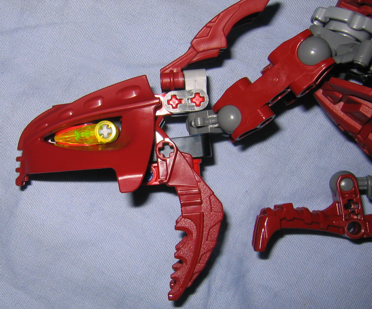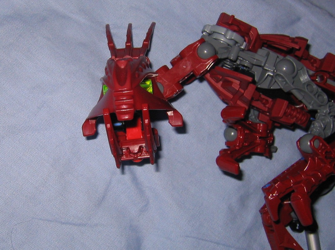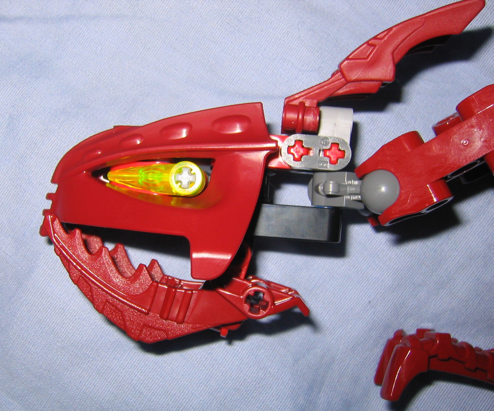 The head itself is interesting, and works perfectly with it’s neck, where it attaches to the body from two short double sockets that hook together with a right angle matoran-arm from the metru nui series. From this matoran arm, the base of the head plugs into the arm via a blue friction peg. This does make the neck slightly asymmetrical which bothers me a little, and I hate the idea of the head sitting on a blue fiction peg, however it is locked into place where it wont pop off accidentally during play, and the pull of gravity wont be able to make the head teeter or wobble out of it’s current position unless your holding him sideways rather than letting him stand properly on a table where the force of gravity cant disturb it much. The jaw also is built a little bit asymmetrical, and sits on a blue friction peg. As a result it wont support much weight before popping open by leverage and gravity, so only a few small and light objects could be held in it’s mouth (So no poses with a matoran sized victim held in his mouth would work out, unless maybe you used a McDonald’s marotan?) .