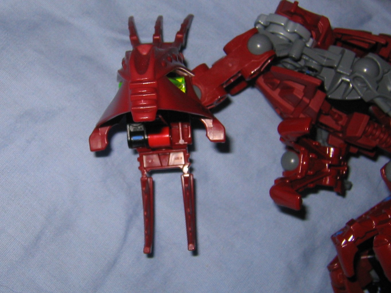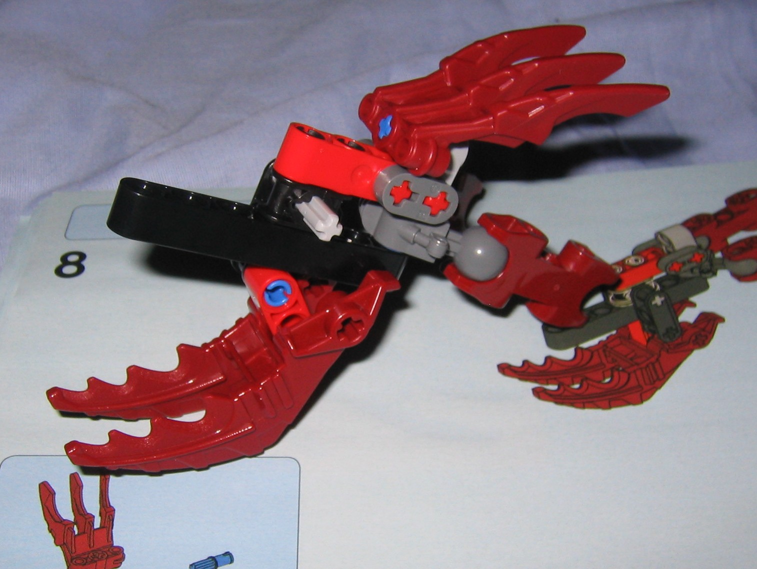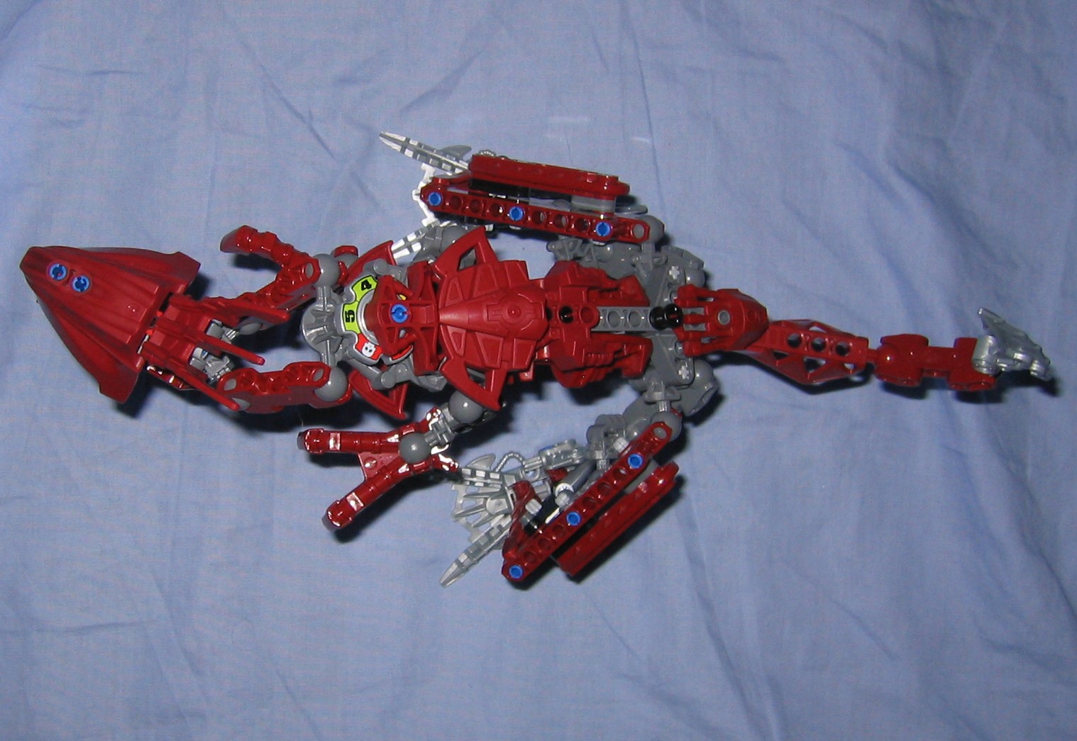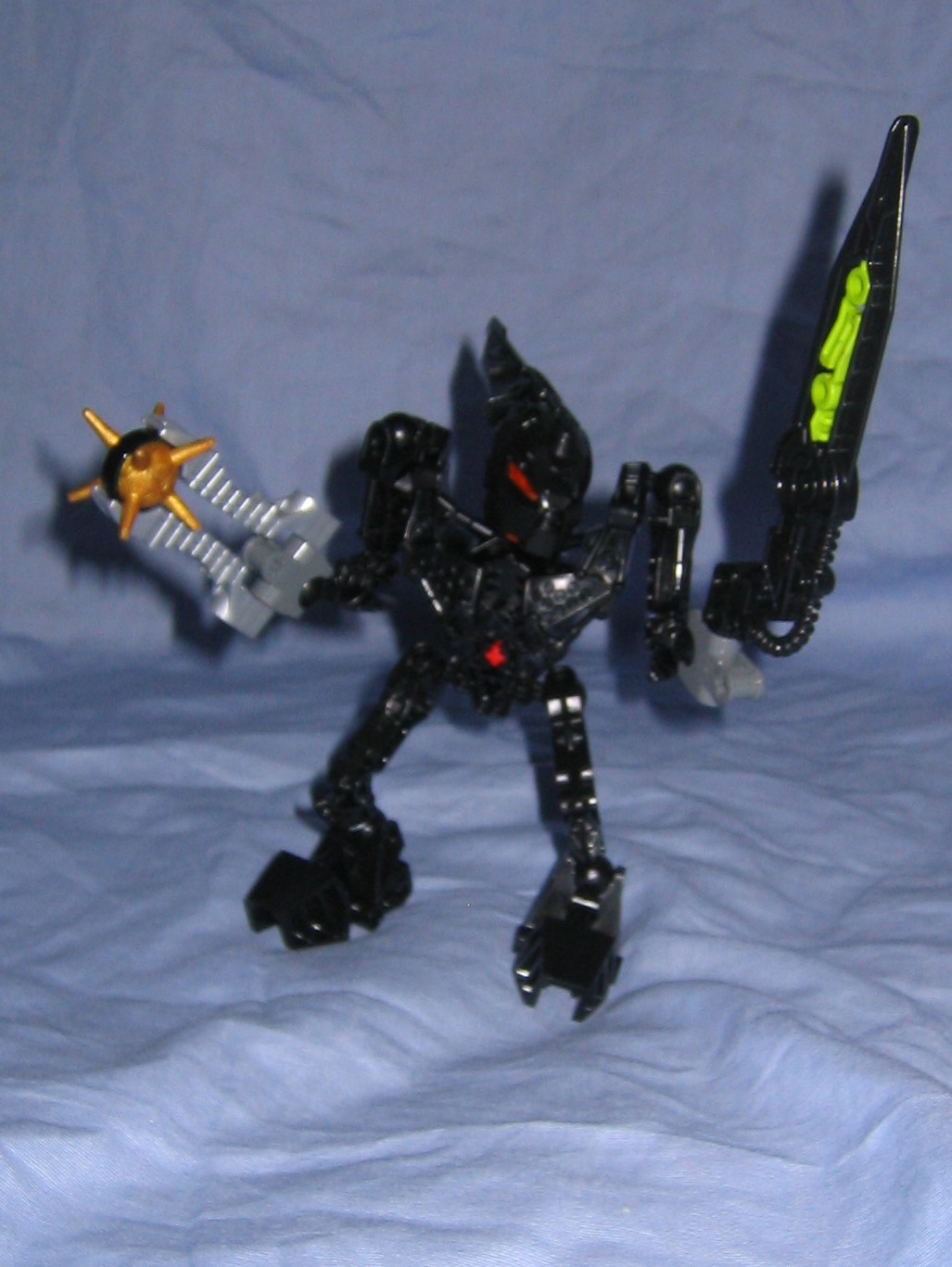 The head itself is interesting, and works perfectly with it’s neck, where it attaches to the body from two short double sockets that hook together with a right angle matoran-arm from the metru nui series. From this matoran arm, the base of the head plugs into the arm via a blue friction peg. This does make the neck slightly asymmetrical which bothers me a little, and I hate the idea of the head sitting on a blue fiction peg, however it is locked into place where it wont pop off accidentally during play, and the pull of gravity wont be able to make the head teeter or wobble out of it’s current position unless your holding him sideways rather than letting him stand properly on a table where the force of gravity cant disturb it much. The jaw also is built a little bit asymmetrical, and sits on a blue friction peg. As a result it wont support much weight before popping open by leverage and gravity, so only a few small and light objects could be held in it’s mouth (So no poses with a matoran sized victim held in his mouth would work out, unless maybe you used a McDonald’s marotan?) .