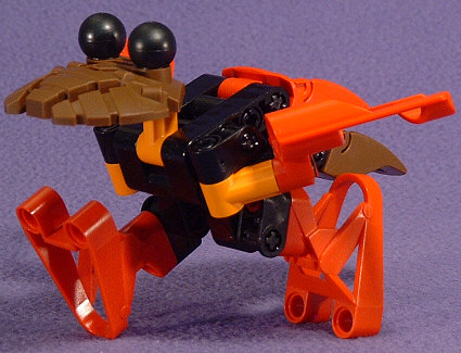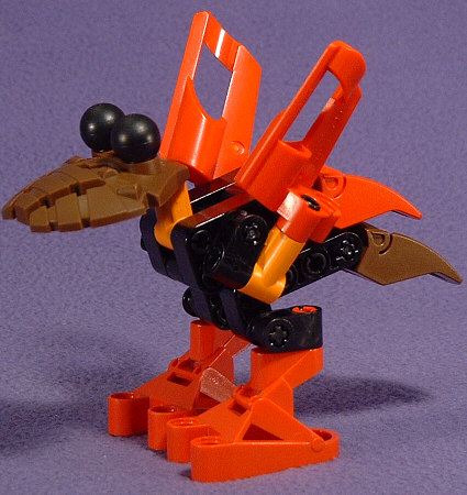 I’m not entirely thrilled with the complication of the shoulder design that I came up with, but it’s the only solution I could figure out that would allow the wings to fold up against the side of the body and stretch out for flying without having to rebuild it each time you wanted to switch. To build it, remove the little stubby green wings, and attach a pair of red #5 and #6 fairings to a pair of TAHNOK VA necks using the black pin/plus-rod combo pieces that held the original wings on. Take a pair of the black pieces used to mount the INFERNAVIKA legs and attach them together with a #5 plus-rod running through the holes that the original wings were attached to. Now connect the two wing assemblies to the wing rack using a pair of #2-length black friction pins.