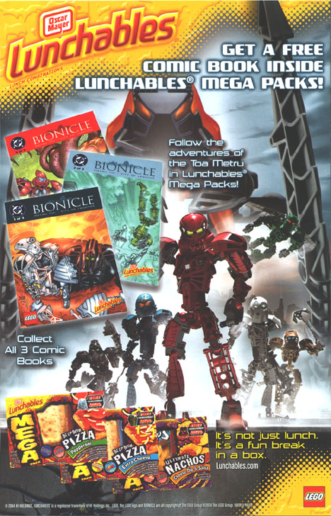 The centerfold reveals the names and bios of the combiners for the TOA METRU and the Metru Nui MATORAN. Three are RAHI and the fourth (the Kralhi), made with TOA VAKAMA, TOA ONEWA, and TOA MATAU) is a robotic prototype of the VAHKI. Toward the back of the comic, there is a page of advertisements for the BIONICLE®: Adventures series books and the Mask Of Light movie. The MoL ad reveals the current name of the upcoming movie, BIONICLE® 2: Legends of Metru Nui , and includes a coupon for $3 off MoL on DVD or video.