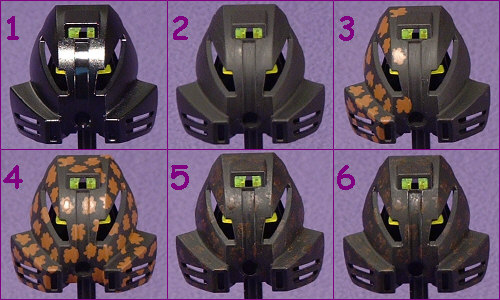 I had the base coat applied for days while I tried to figure out what design I wanted to use on this MASK. PAKARI KINO started out as a bad attempt to emulate the style of the INFECTED HAU with a different color for the corrosion, and eventually resulted in a somewhat tarantula-esque look. Since POHATU KINO is just covered in rocky growths, I felt that it should have some tie to that feature. The picture above shows the result, though it looks a bit more subdued in the photos than it does in real life. The photos I took of POHATU KINO give a better idea of the true look.