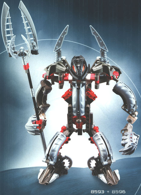 RAHKSHI KAITA ZA combines KURAHK, LERAHK, and TURAHK into a three-headed beast “able to transform itself into a living cyclone!” TAKUTANUVA combines MAKUTA and TAKANUVA into “the most powerful being ever to walk Mata Nui.” According to the accompanying text, TAKUTANUVA is from the BIONICLE™: The Mask of Light video.