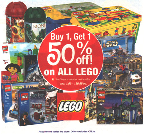 Toys “R” Us is having a “Buy 1, Get 1 50% Off” sale on all LEGO® sets (except Clikits™) through tomorrow (Saturday). My TRU even has TARAKAVA and the original TOA sets pulled out onto the floor for this sale.