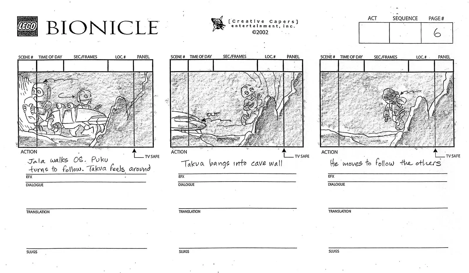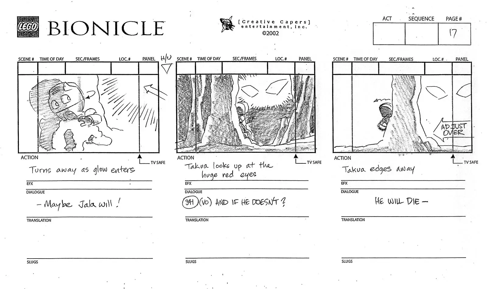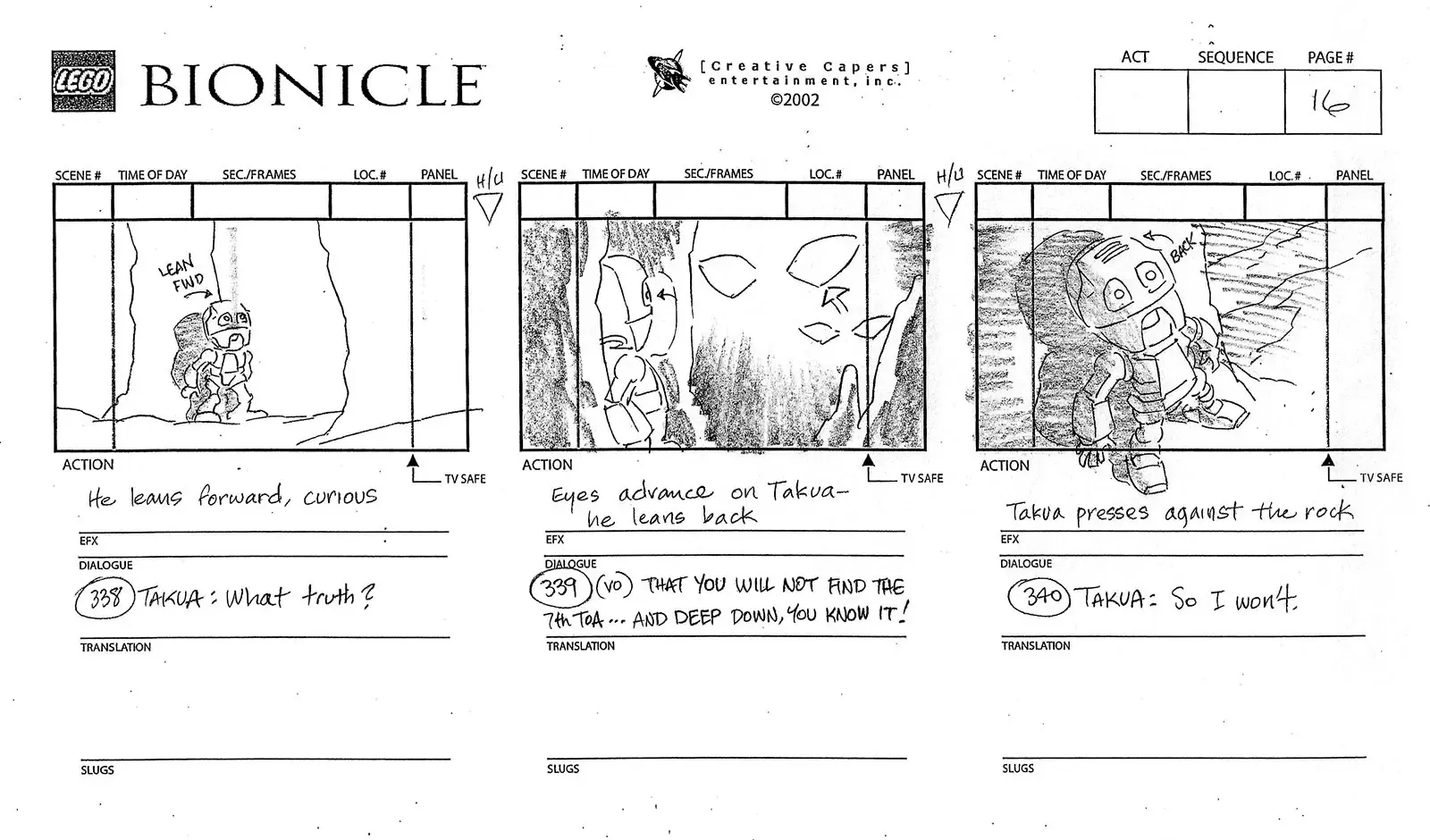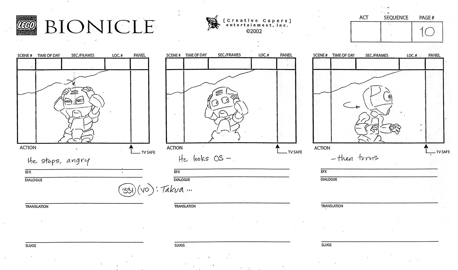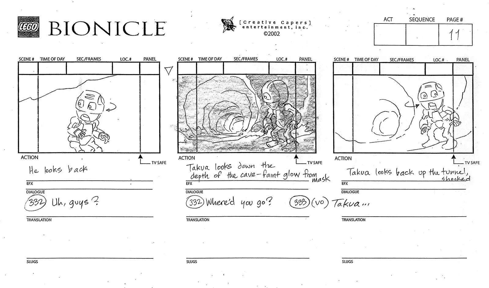 Last up for today, another Mask of Light production item sent in by TuragaHordika. Tim Eldred has shared a full sequence that he boarded – specifically, Takua and Jaller’s trip along the Onu-Koro Highway, and Makuta’s bargain with Takua. There is a fair bit here that was ultimately cut from the film! How many times does Takua hit his head on a rock?!