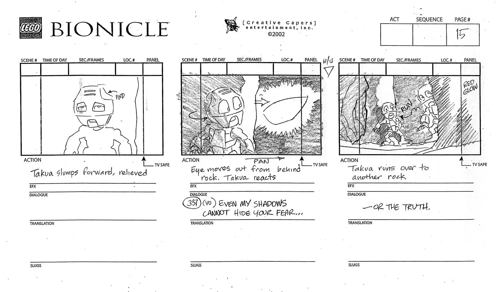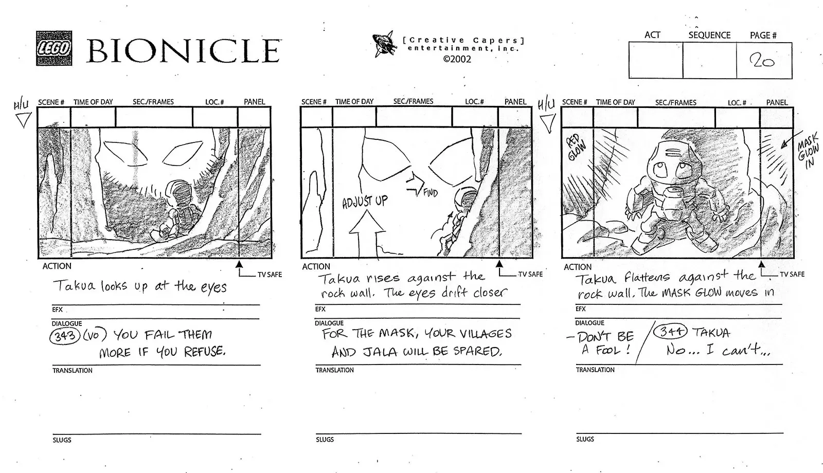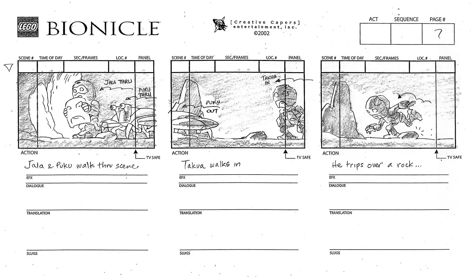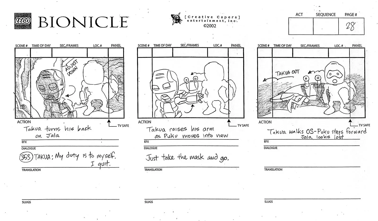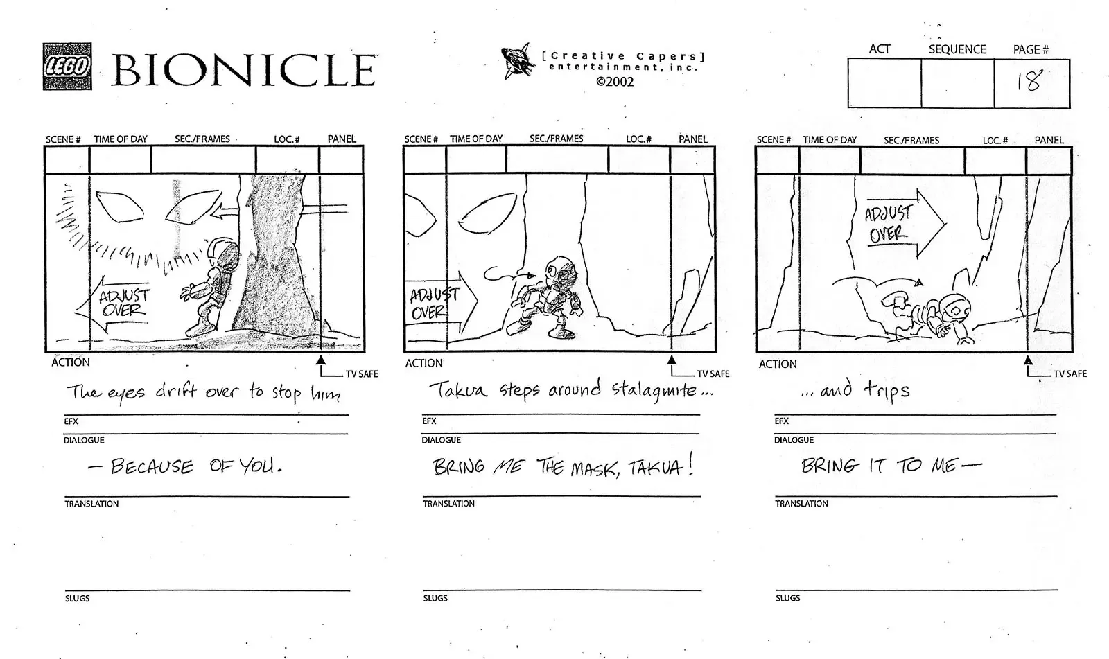 Last up for today, another Mask of Light production item sent in by TuragaHordika. Tim Eldred has shared a full sequence that he boarded – specifically, Takua and Jaller’s trip along the Onu-Koro Highway, and Makuta’s bargain with Takua. There is a fair bit here that was ultimately cut from the film! How many times does Takua hit his head on a rock?!