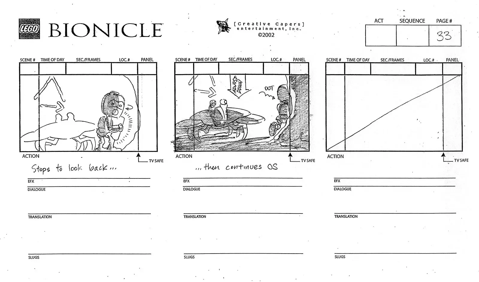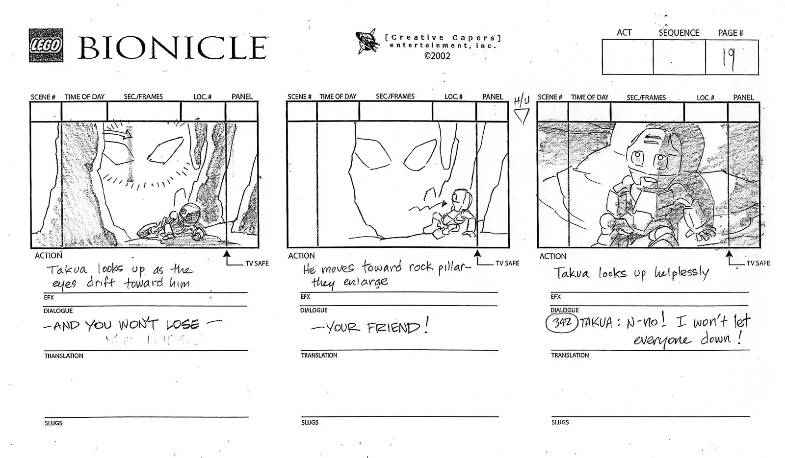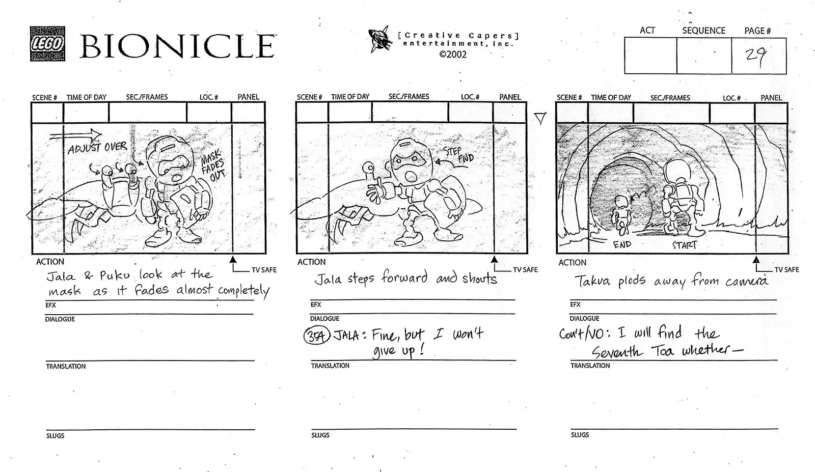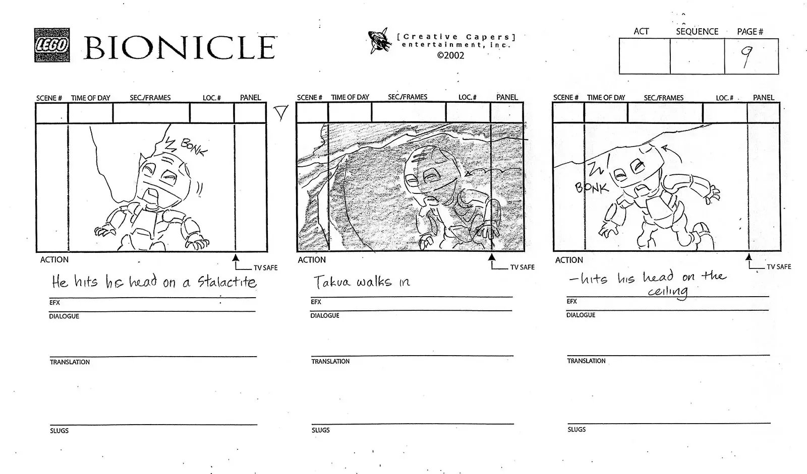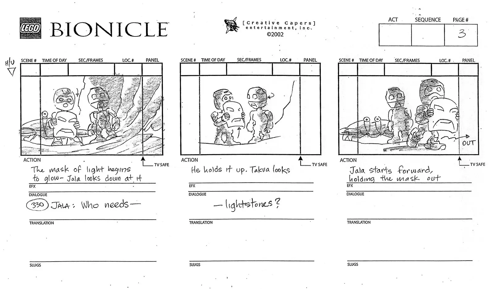 Last up for today, another Mask of Light production item sent in by TuragaHordika. Tim Eldred has shared a full sequence that he boarded – specifically, Takua and Jaller’s trip along the Onu-Koro Highway, and Makuta’s bargain with Takua. There is a fair bit here that was ultimately cut from the film! How many times does Takua hit his head on a rock?!