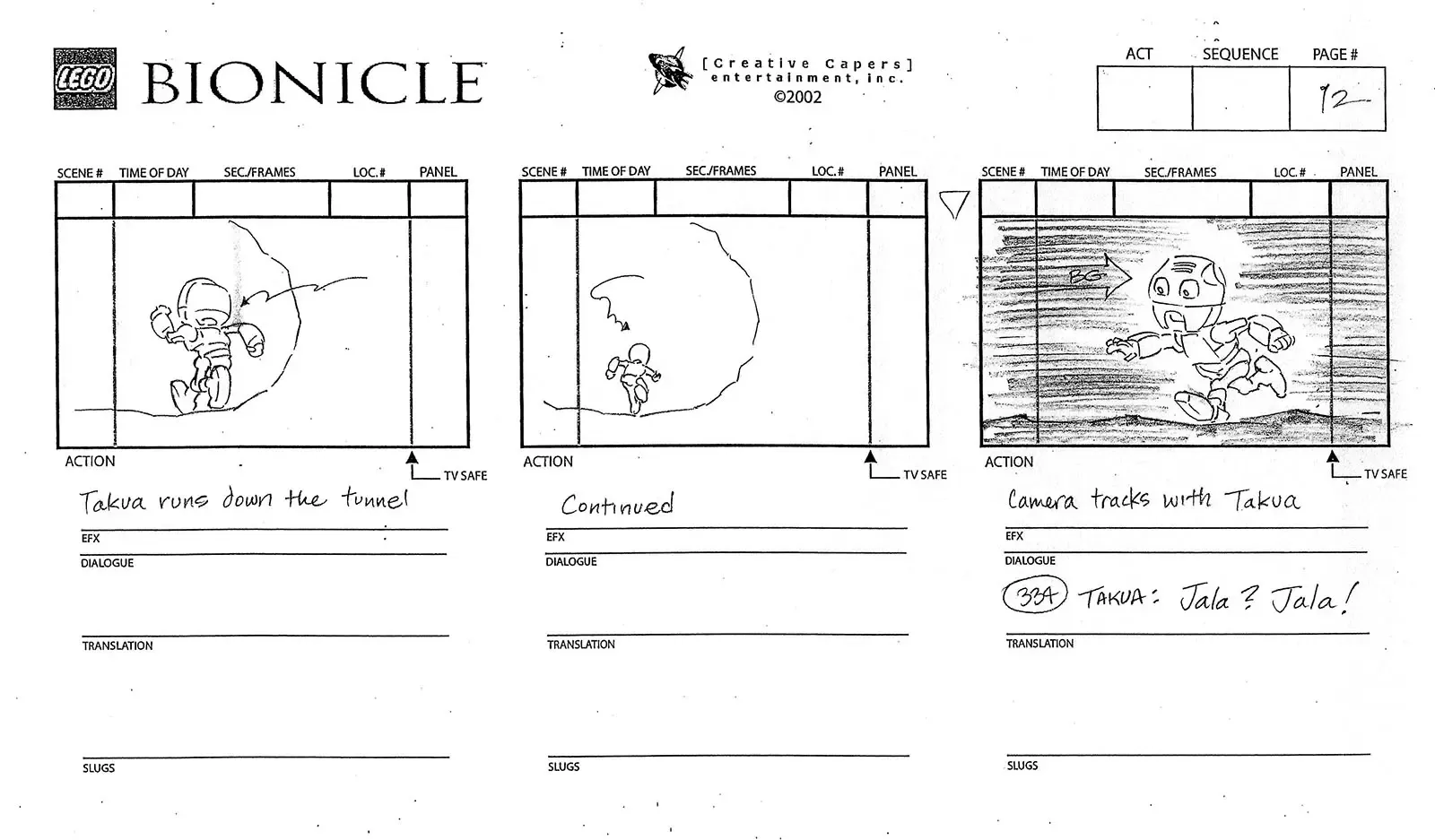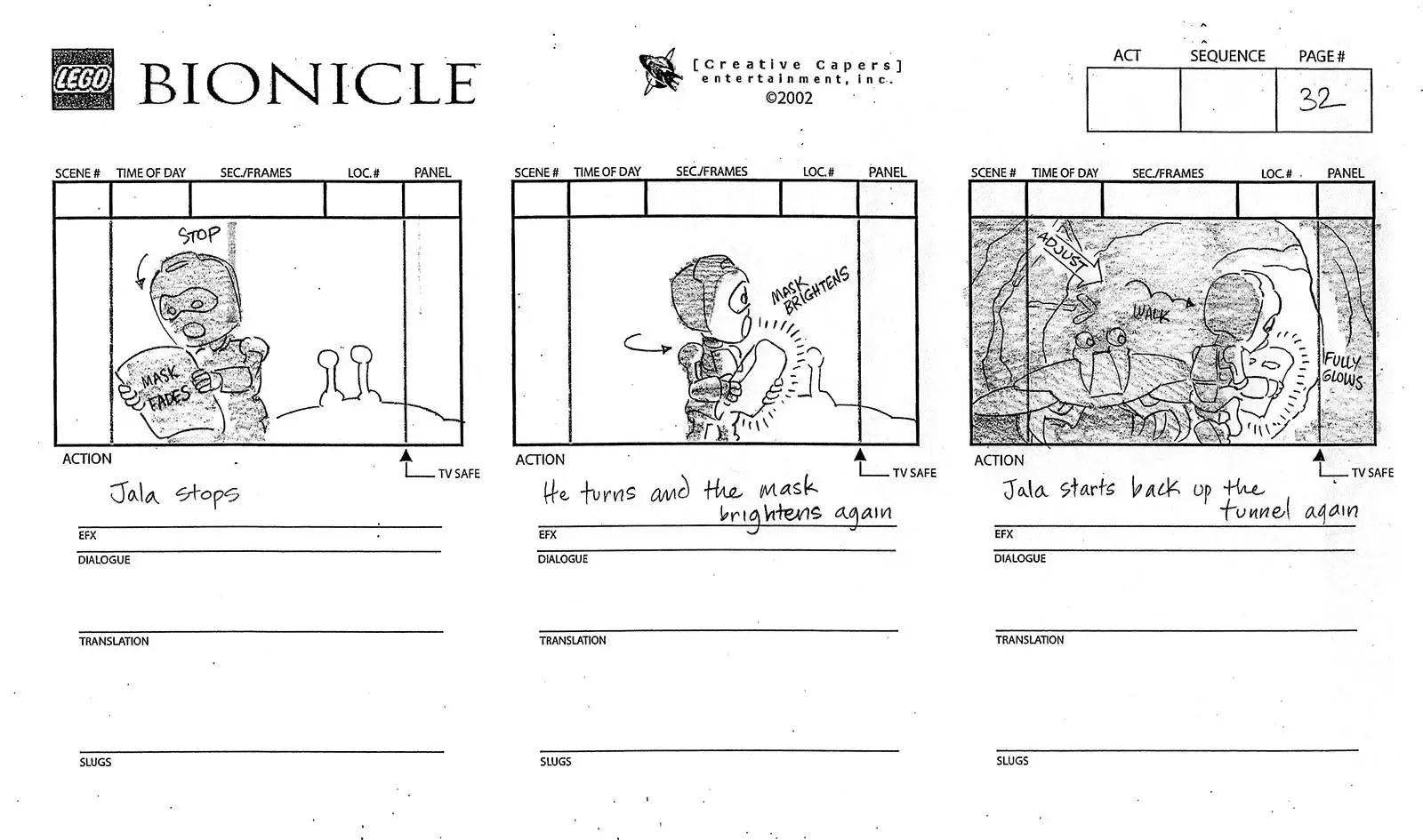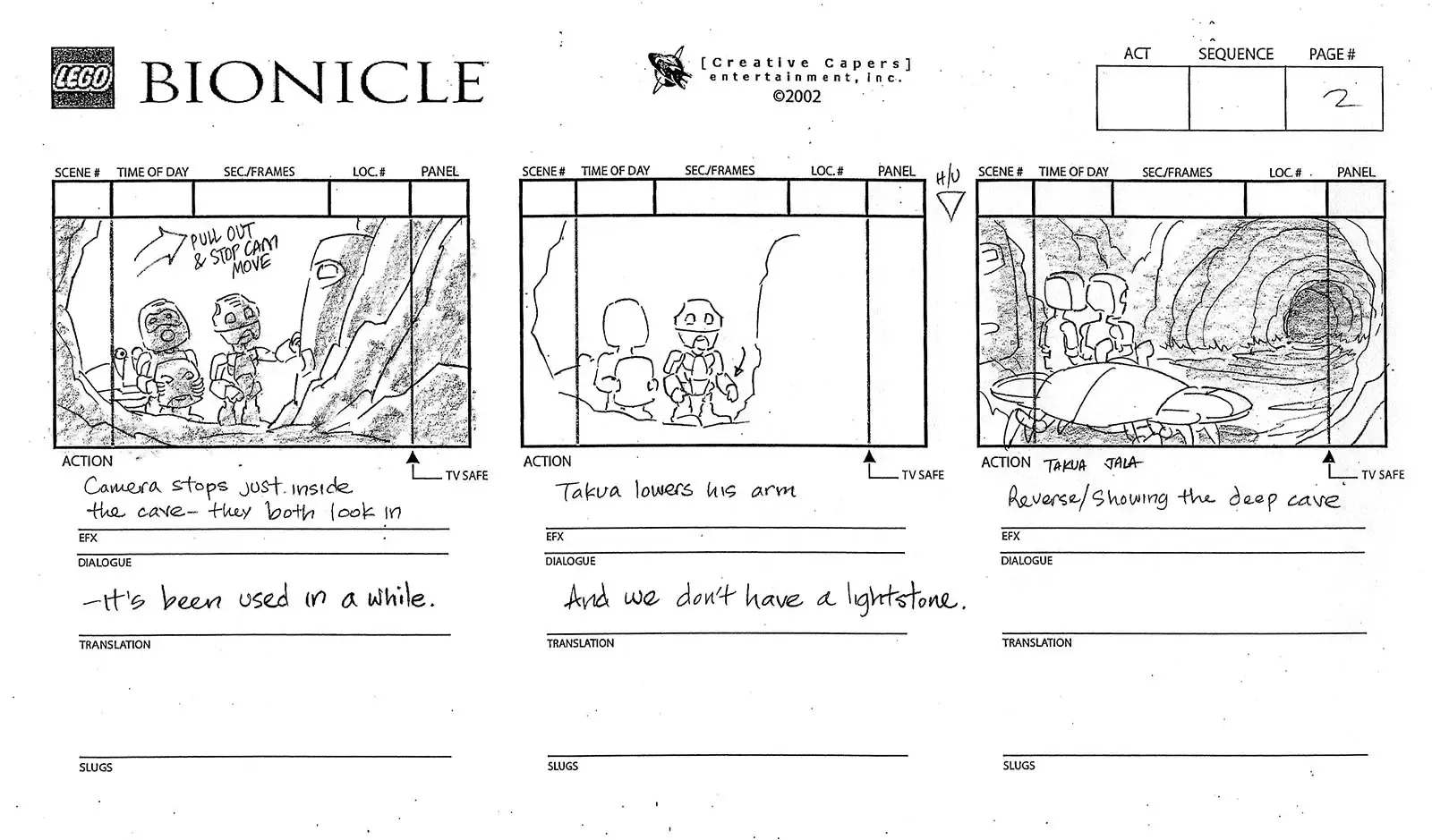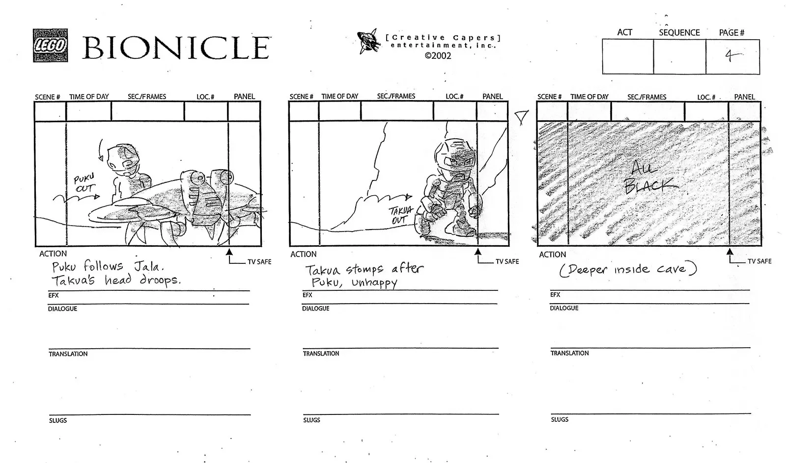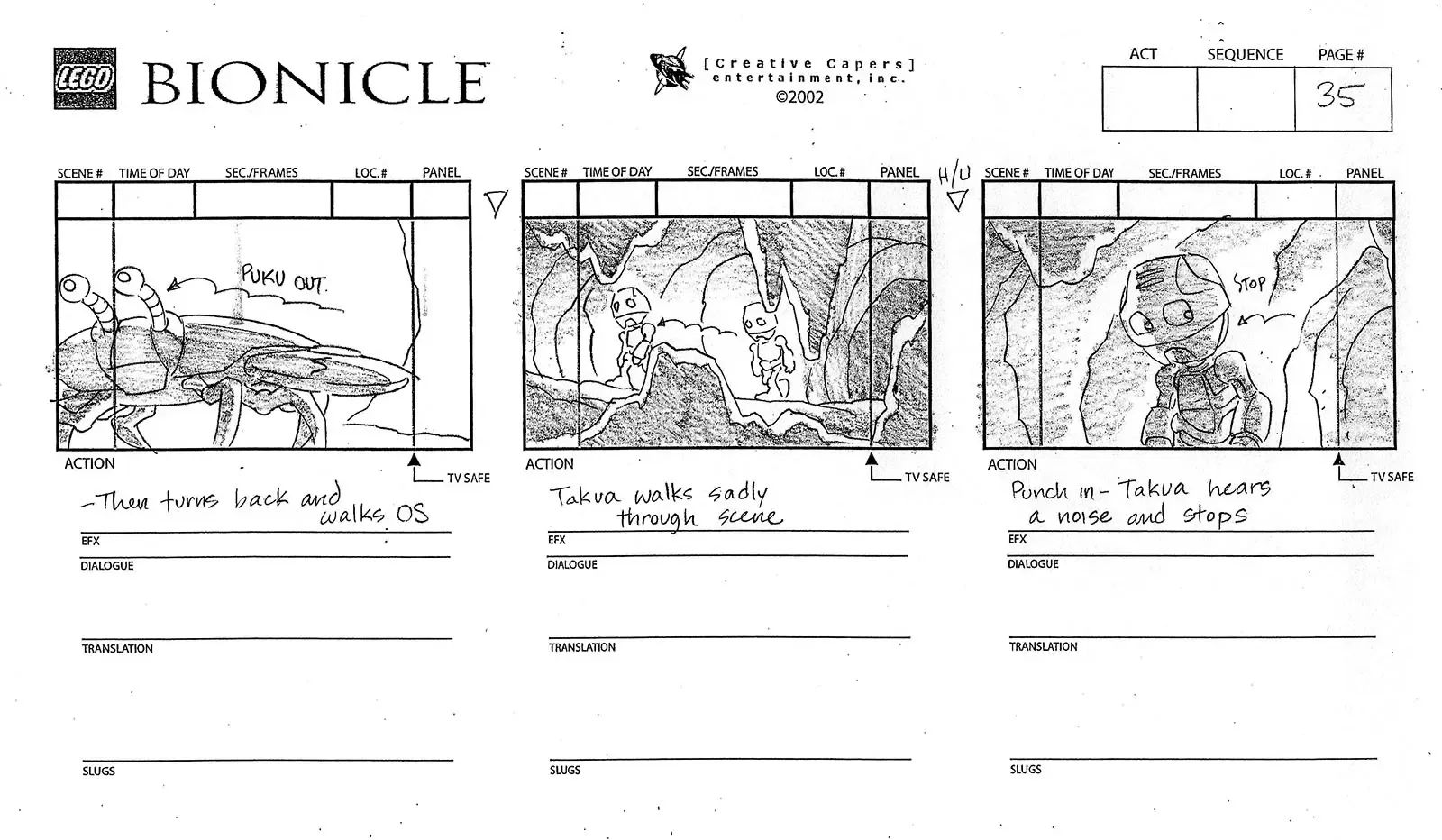 Last up for today, another Mask of Light production item sent in by TuragaHordika. Tim Eldred has shared a full sequence that he boarded – specifically, Takua and Jaller’s trip along the Onu-Koro Highway, and Makuta’s bargain with Takua. There is a fair bit here that was ultimately cut from the film! How many times does Takua hit his head on a rock?!