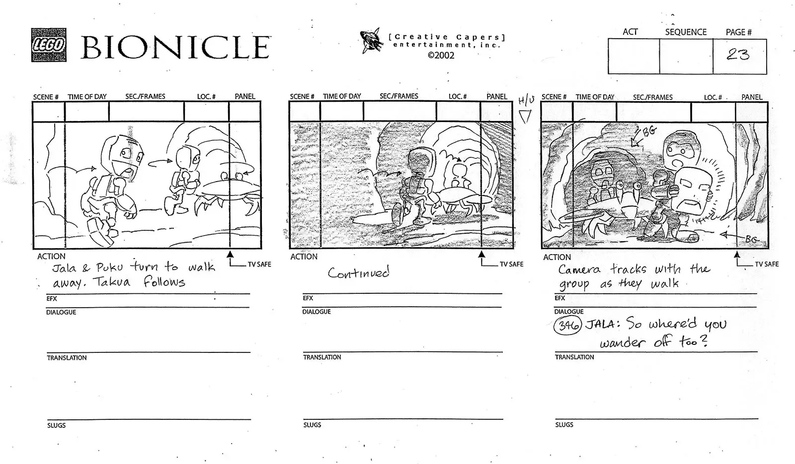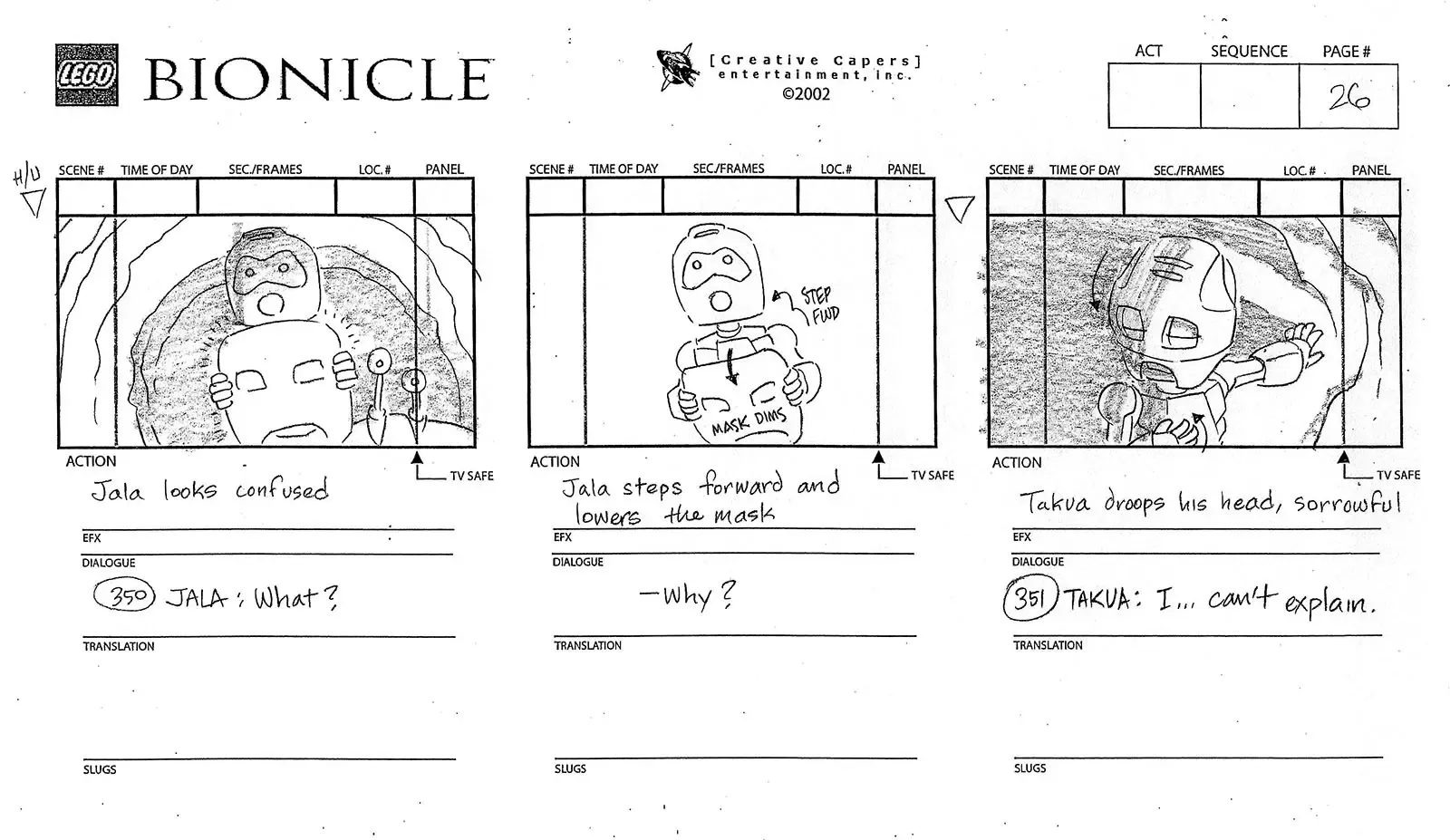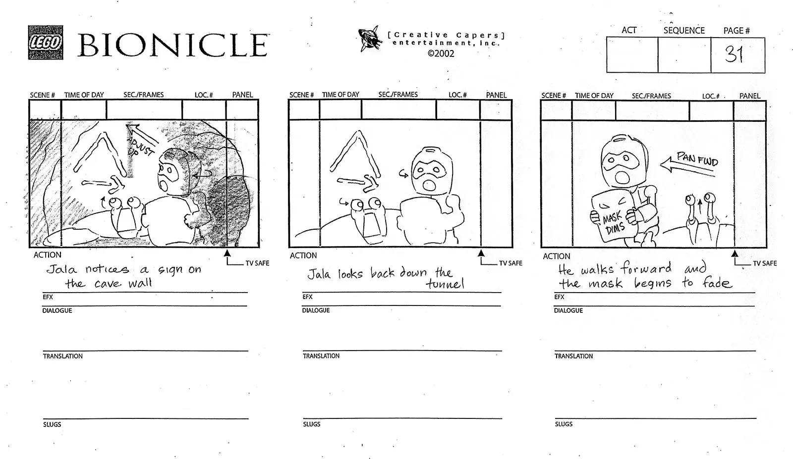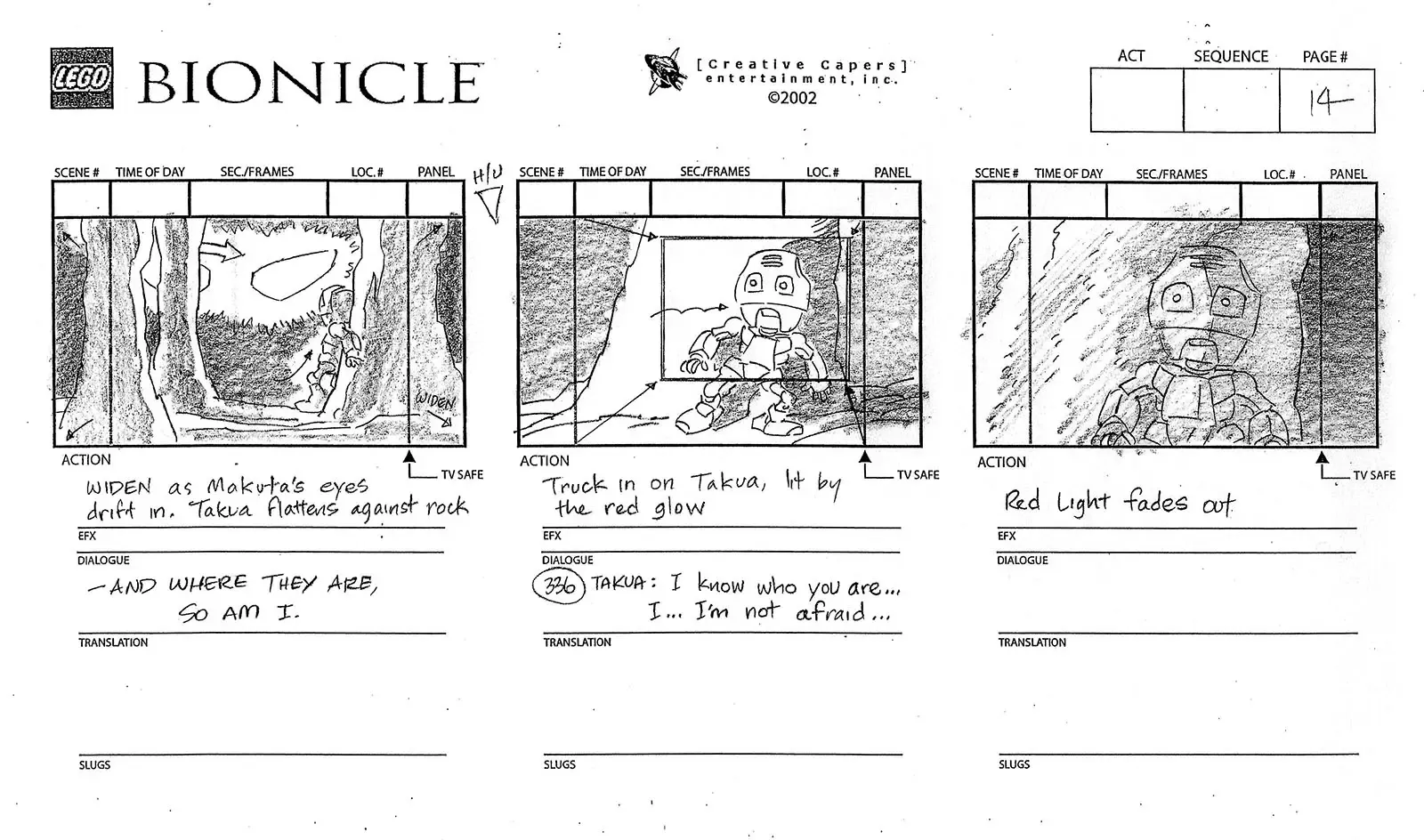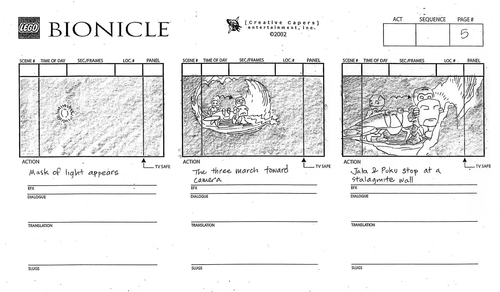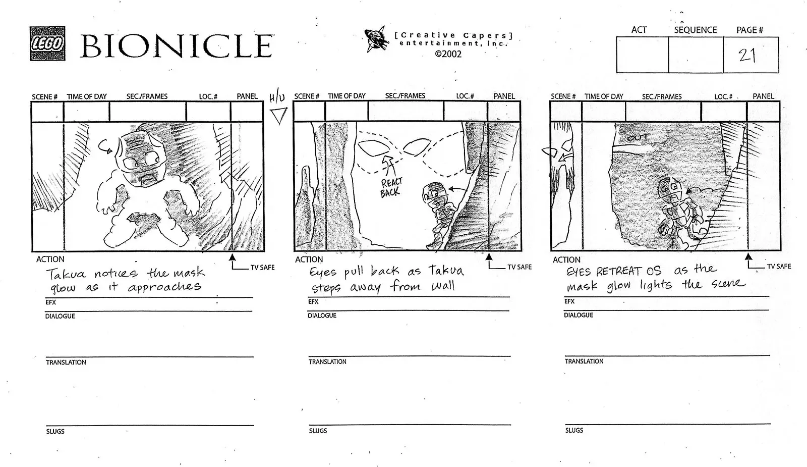 Last up for today, another Mask of Light production item sent in by TuragaHordika. Tim Eldred has shared a full sequence that he boarded – specifically, Takua and Jaller’s trip along the Onu-Koro Highway, and Makuta’s bargain with Takua. There is a fair bit here that was ultimately cut from the film! How many times does Takua hit his head on a rock?!