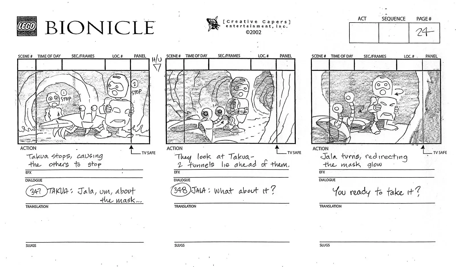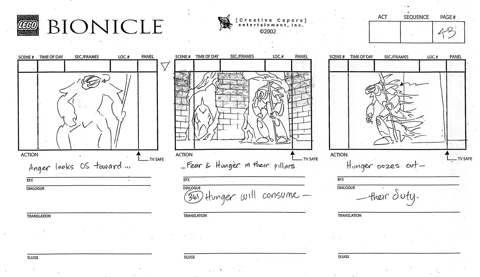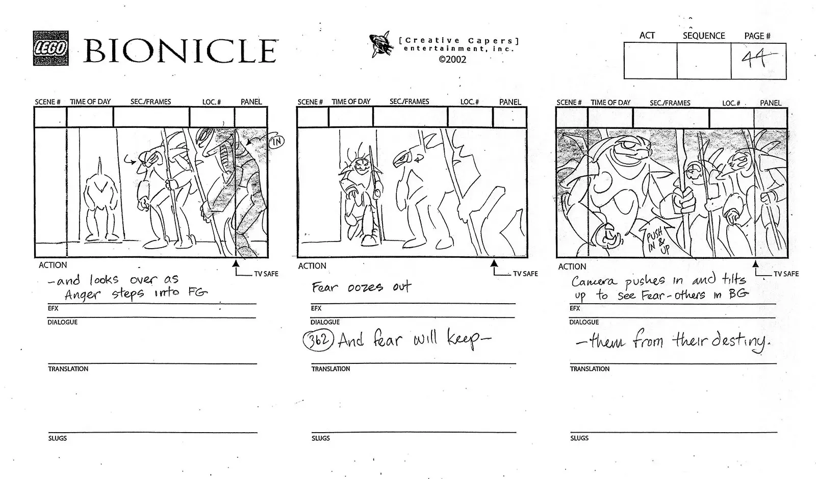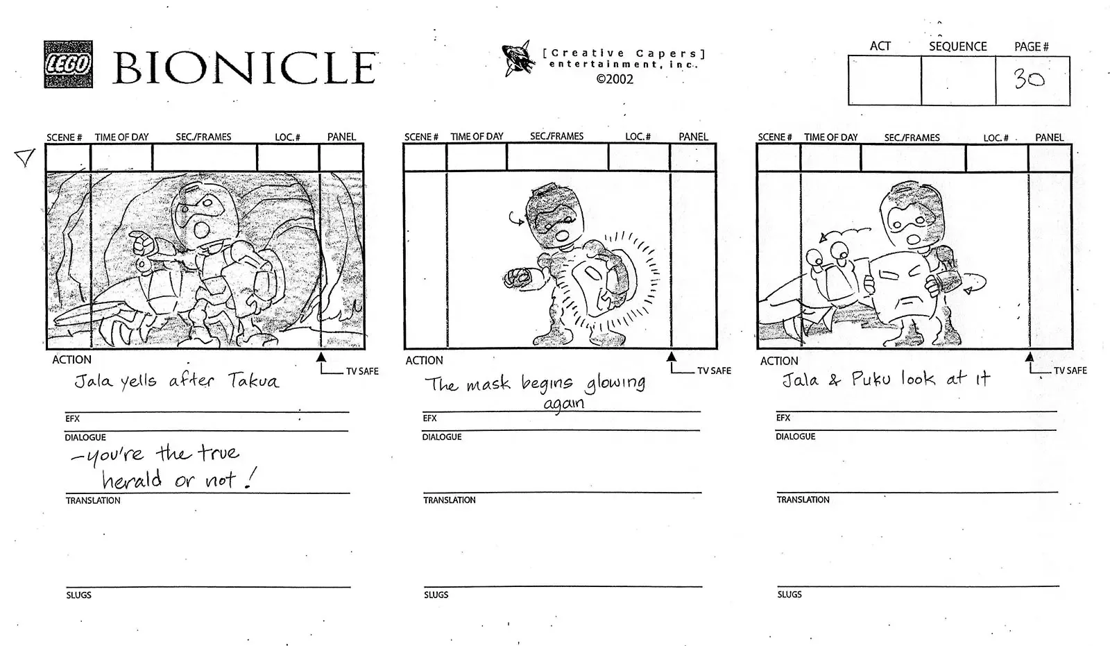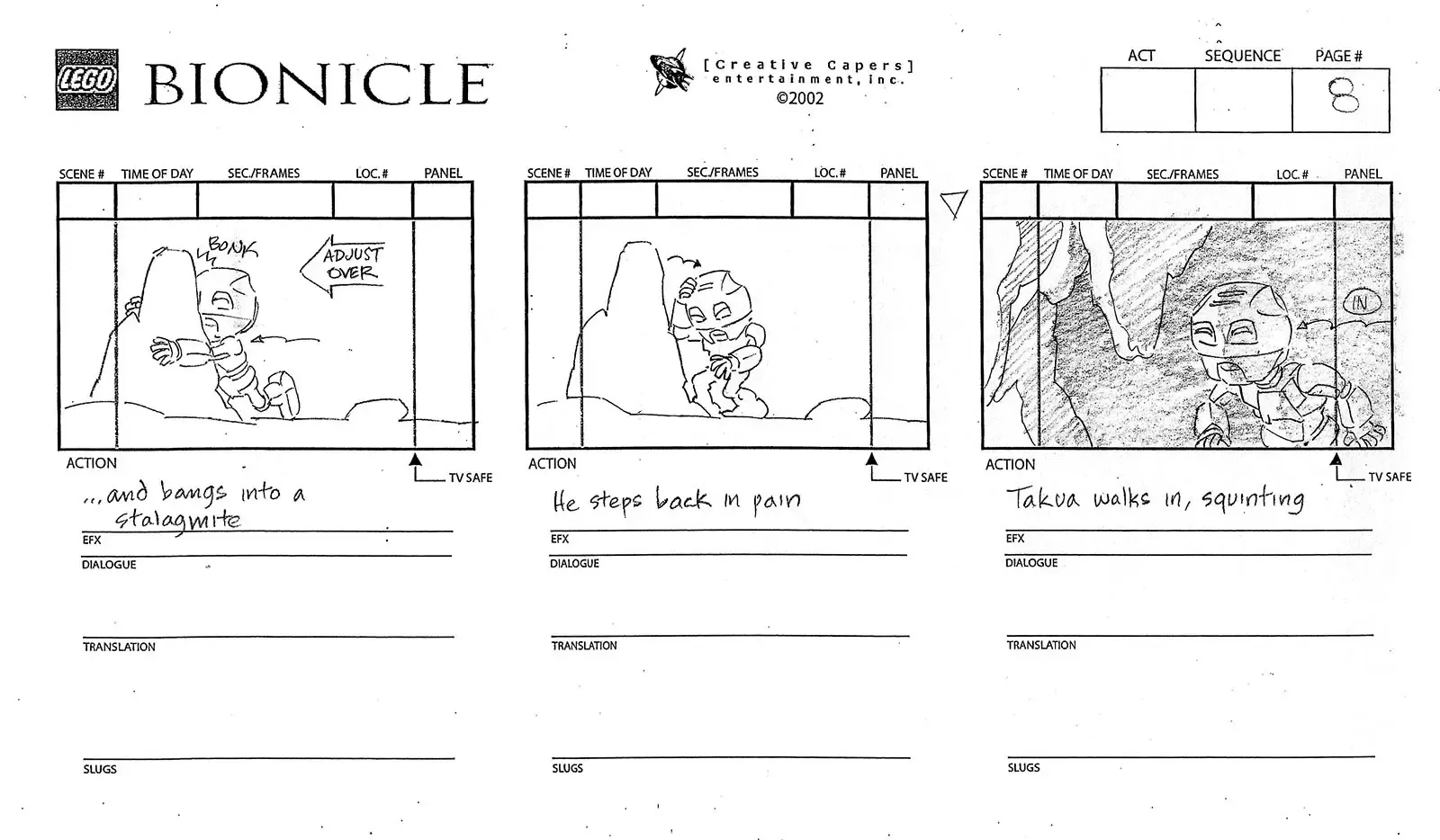 Last up for today, another Mask of Light production item sent in by TuragaHordika. Tim Eldred has shared a full sequence that he boarded – specifically, Takua and Jaller’s trip along the Onu-Koro Highway, and Makuta’s bargain with Takua. There is a fair bit here that was ultimately cut from the film! How many times does Takua hit his head on a rock?!