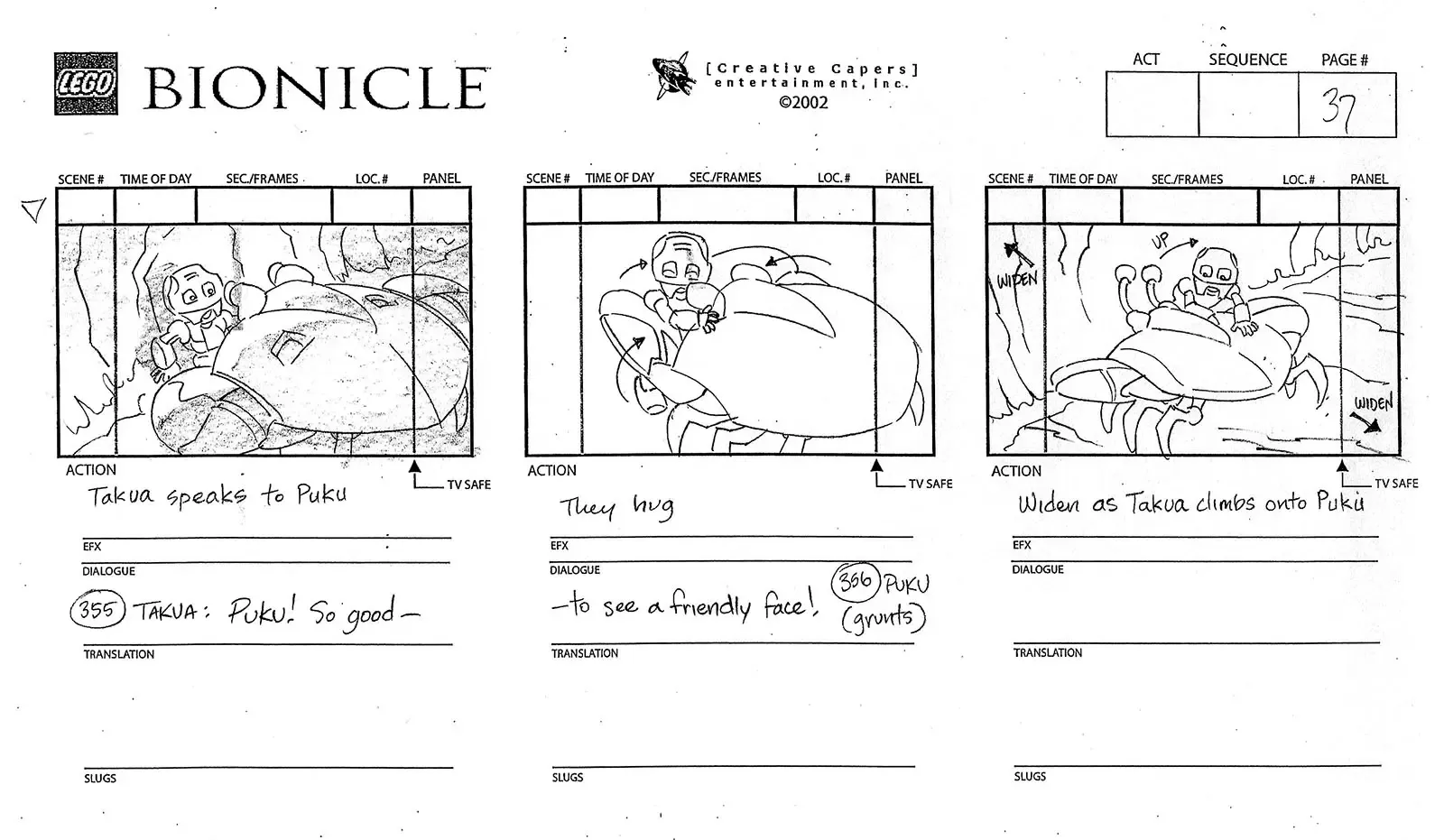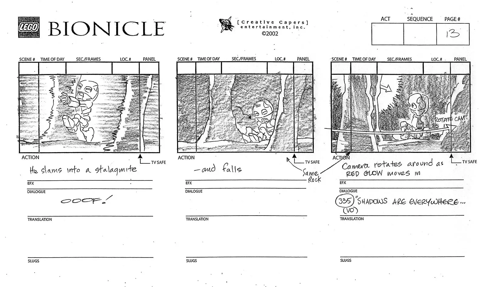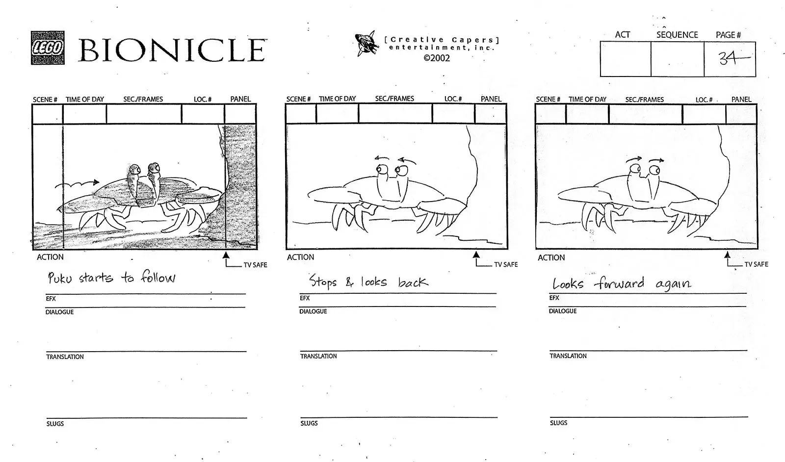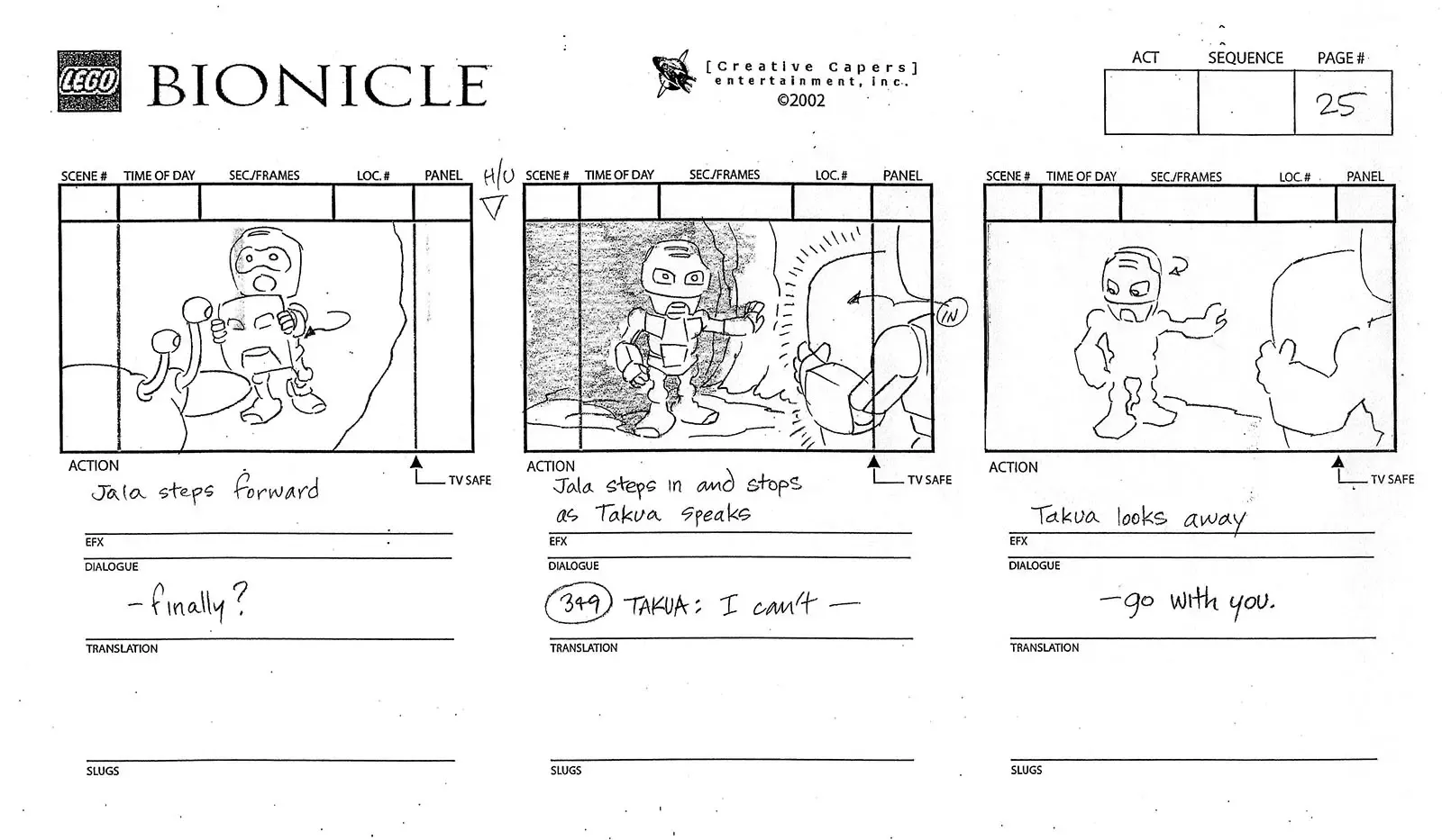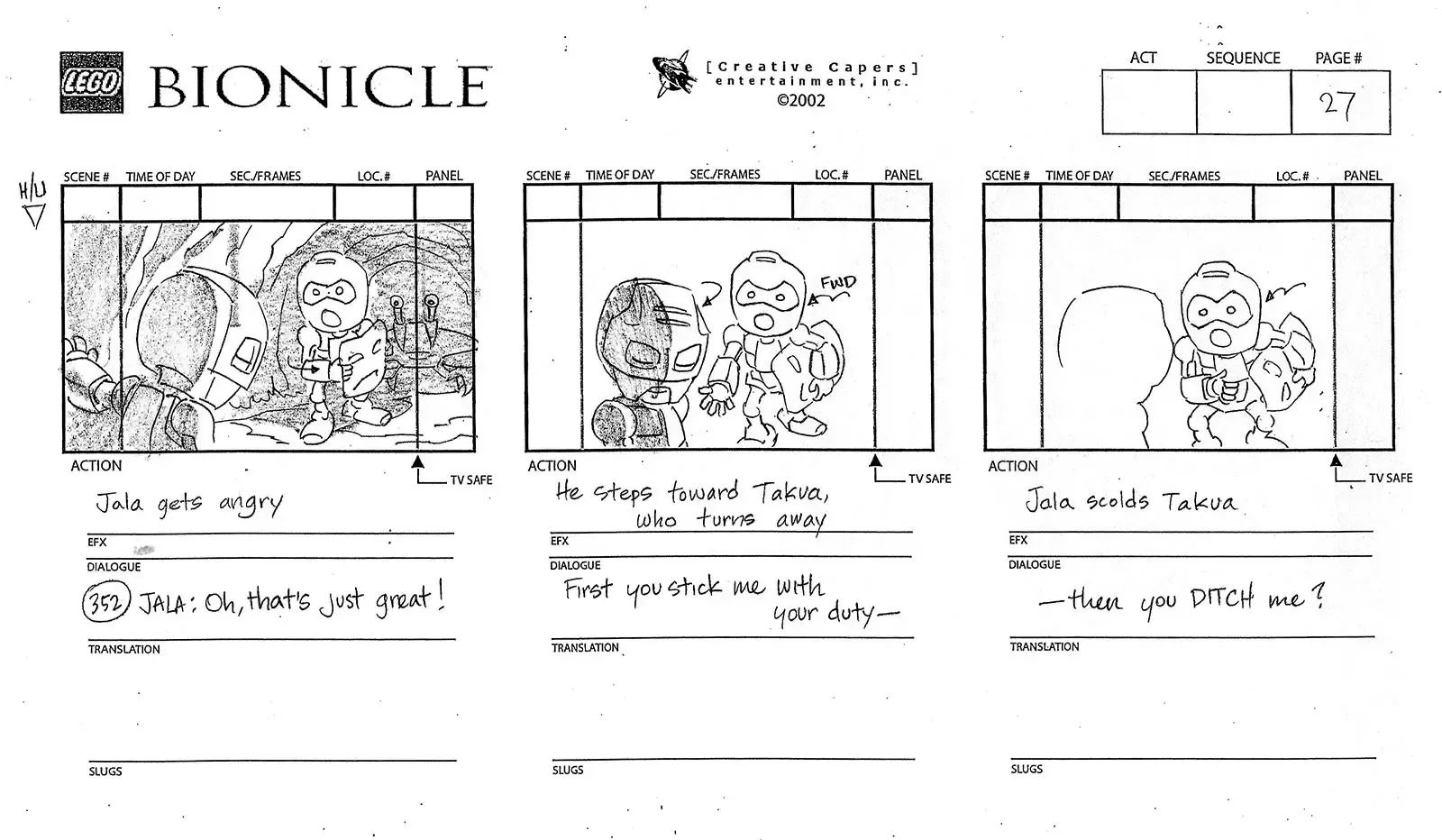 Last up for today, another Mask of Light production item sent in by TuragaHordika. Tim Eldred has shared a full sequence that he boarded – specifically, Takua and Jaller’s trip along the Onu-Koro Highway, and Makuta’s bargain with Takua. There is a fair bit here that was ultimately cut from the film! How many times does Takua hit his head on a rock?!