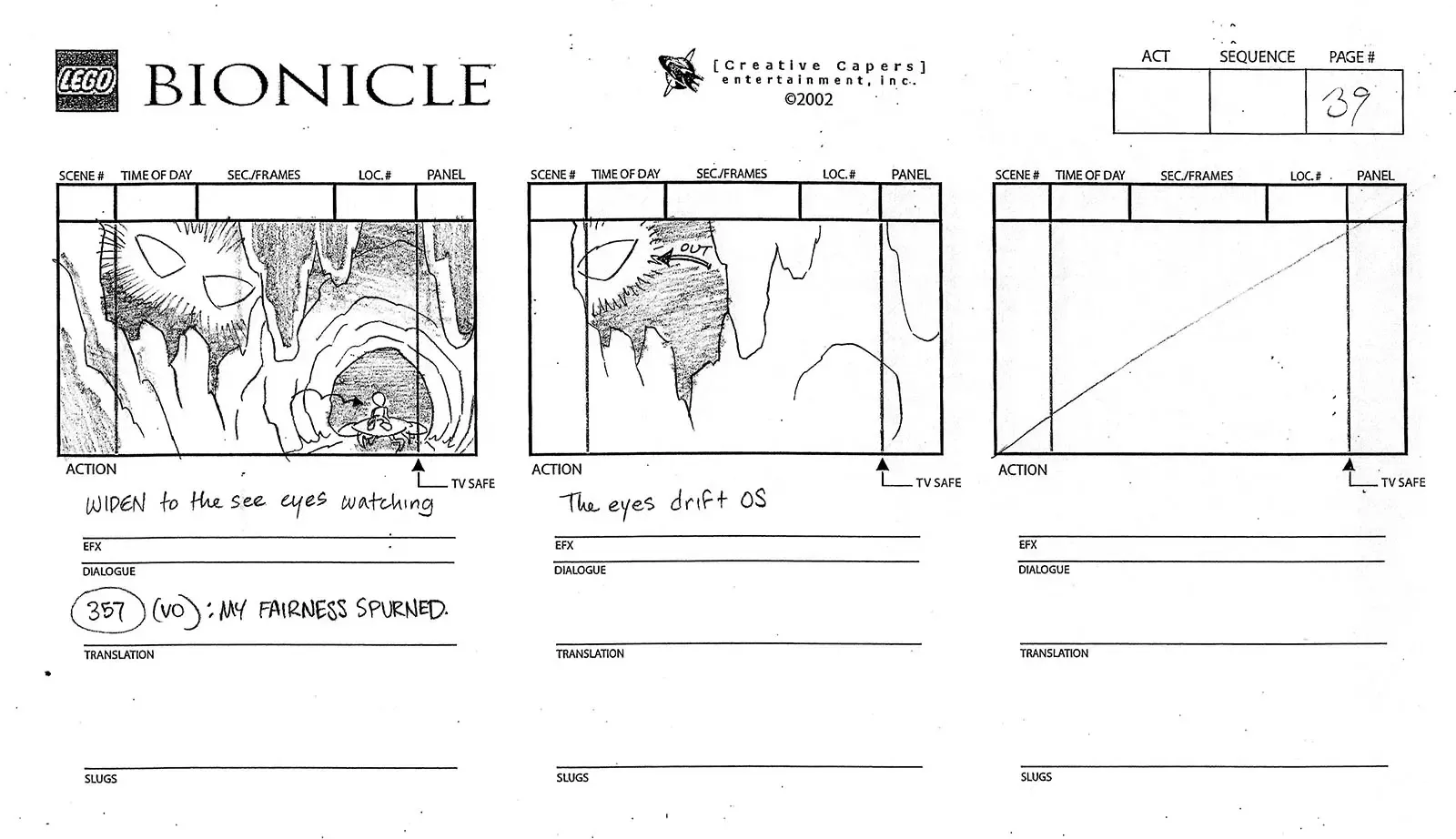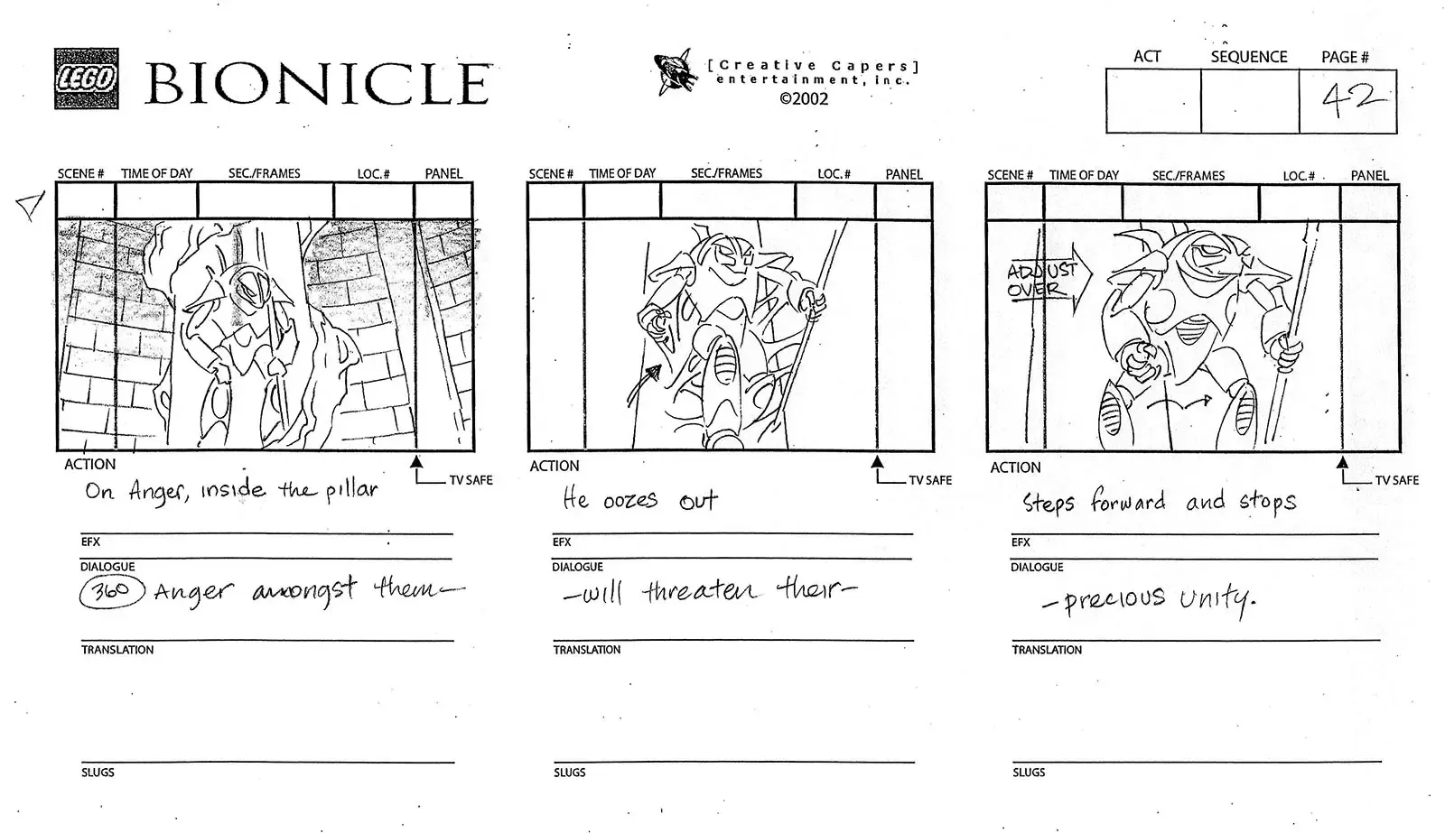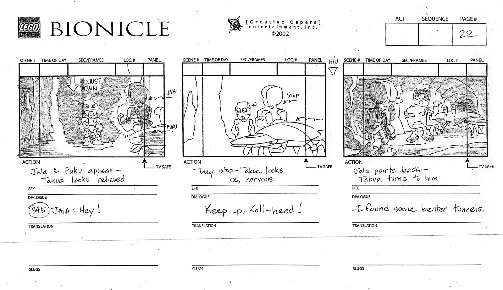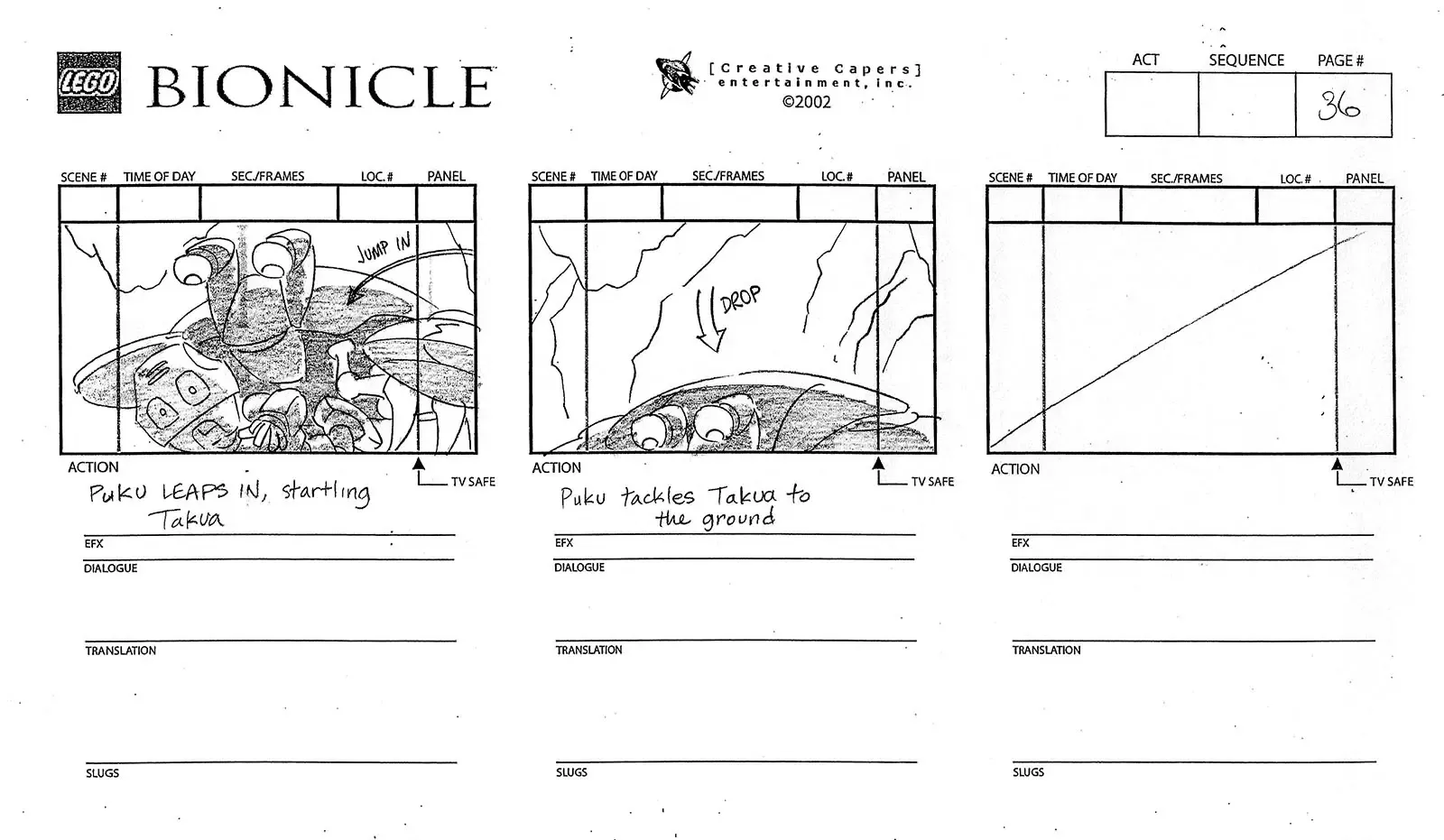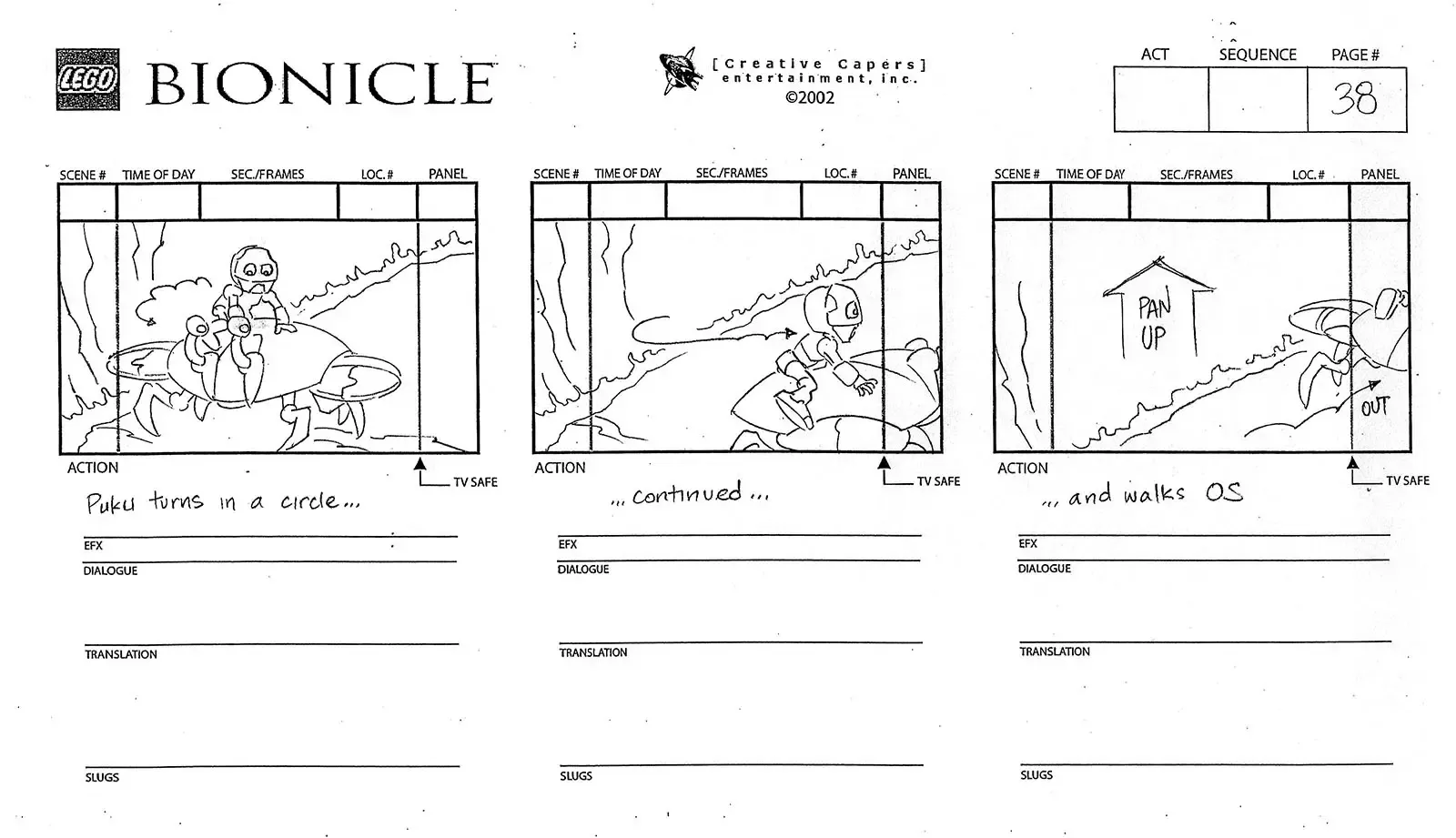Last up for today, another Mask of Light production item sent in by TuragaHordika. Tim Eldred has shared a full sequence that he boarded – specifically, Takua and Jaller’s trip along the Onu-Koro Highway, and Makuta’s bargain with Takua. There is a fair bit here that was ultimately cut from the film! How many times does Takua hit his head on a rock?!