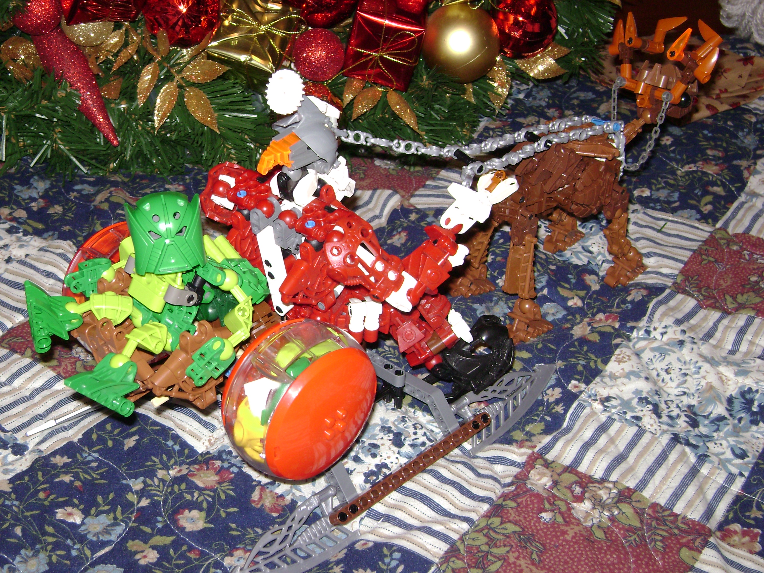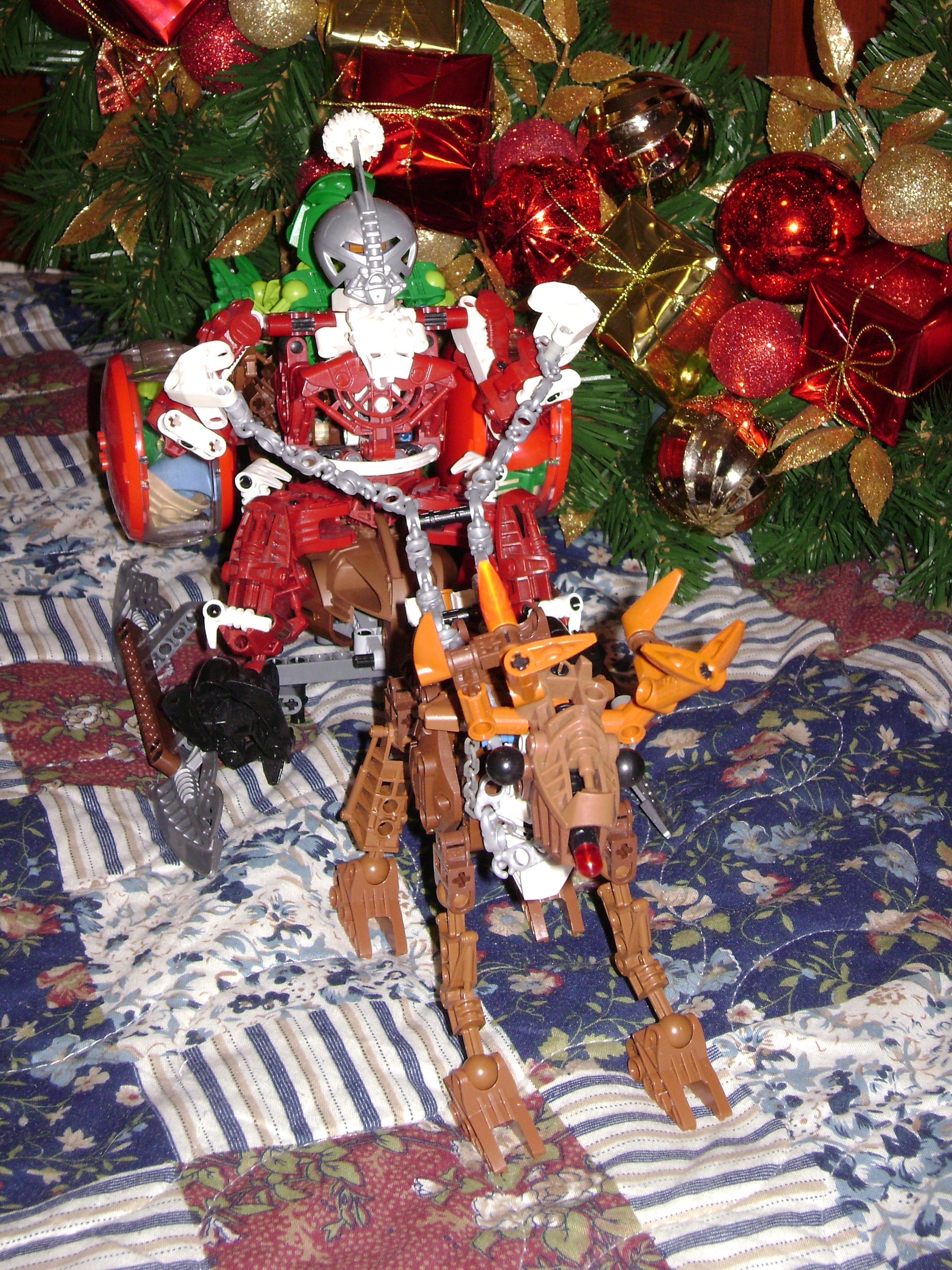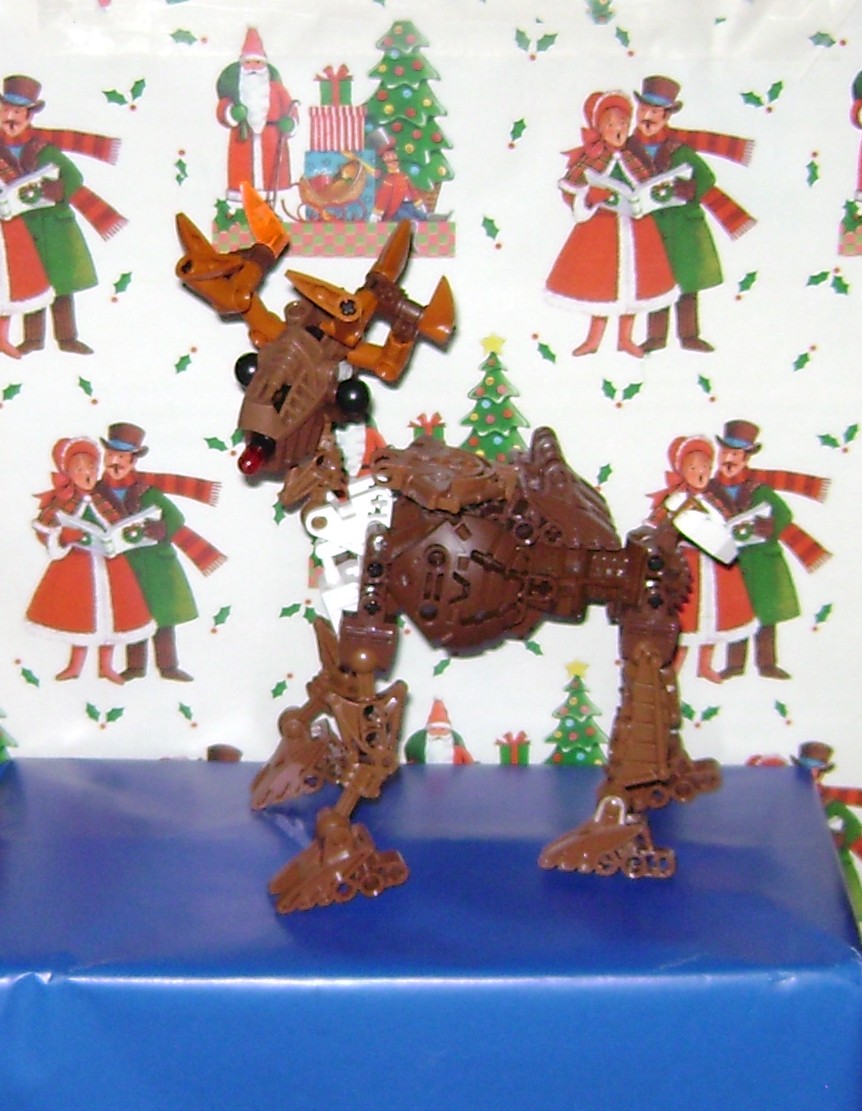 These are stock photos from the past couple years, the first Is Santoa. He may look fat, but he’s really just stronger than your average toa. Before he had his helpers, he would carry a huge bag of masks by foot each year. I don’t have anything special to say about the reindeer. he has a red nose and one odd colored antler. I cant seem to find that last solid colored sand brown piece to replace the transparent one.