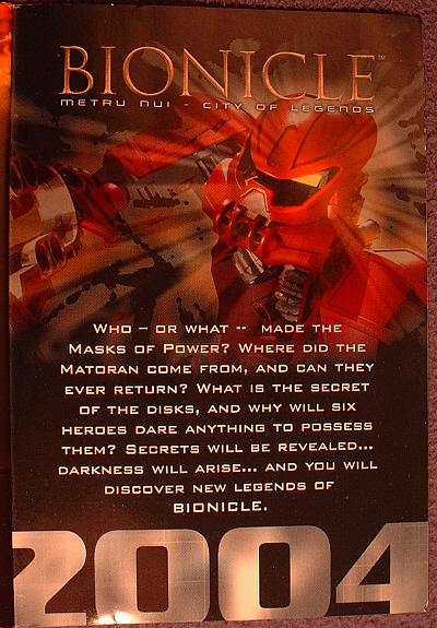 This image is from the inside of the last page of the brochure included in the MASK OF LIGHT DVD. We’re not sure what character this is, but there are a few things I was able to pick out from the little bit that we can see. The first thing I noticed was that this character appears to have articulated elbows. Unfortunately, it also appears to rely on the old bent-angle THROWBOT limb for the forearm. The unseen portion of the arm appears like it might be some sort of large functional grasper claw. The next thing that caught my eye was that the new KANOHI looks like it was inspired by the original KAUKAU, with the scuba-like look to the apparatus around the mouth area and the shape of the viewport, to the tapered ridge running up the middle of the forehead. Finally, the little bits of torso that we can see almost look like the old THROWBOT torso. The interior of them is only 2-wide, and there really isn’t a good way to incorporate the TOA-style attack mechanism, so my guess is these will either have less versatile construction in that regard, or they will only be designed to resemble the THROWBOT torsos.