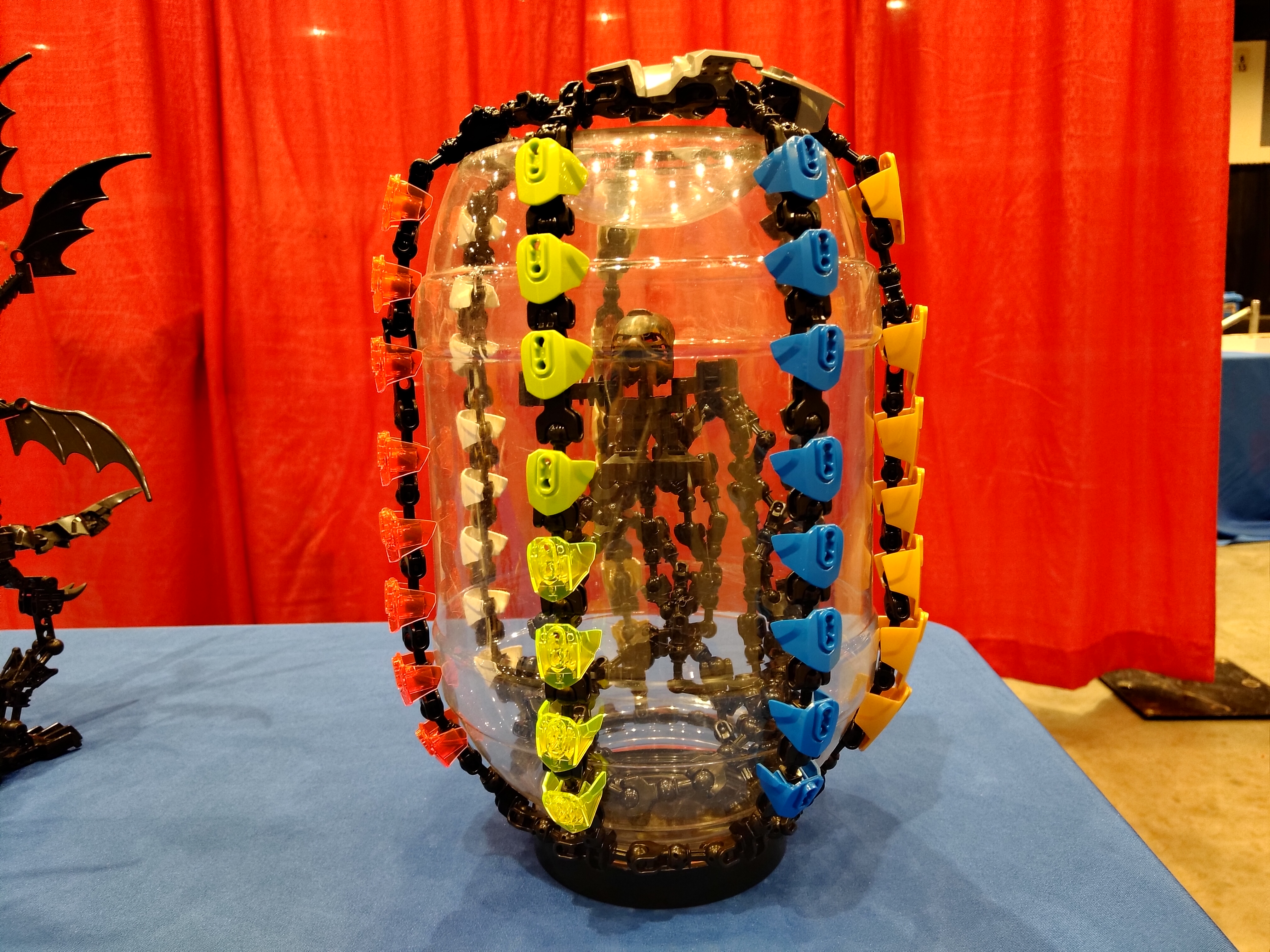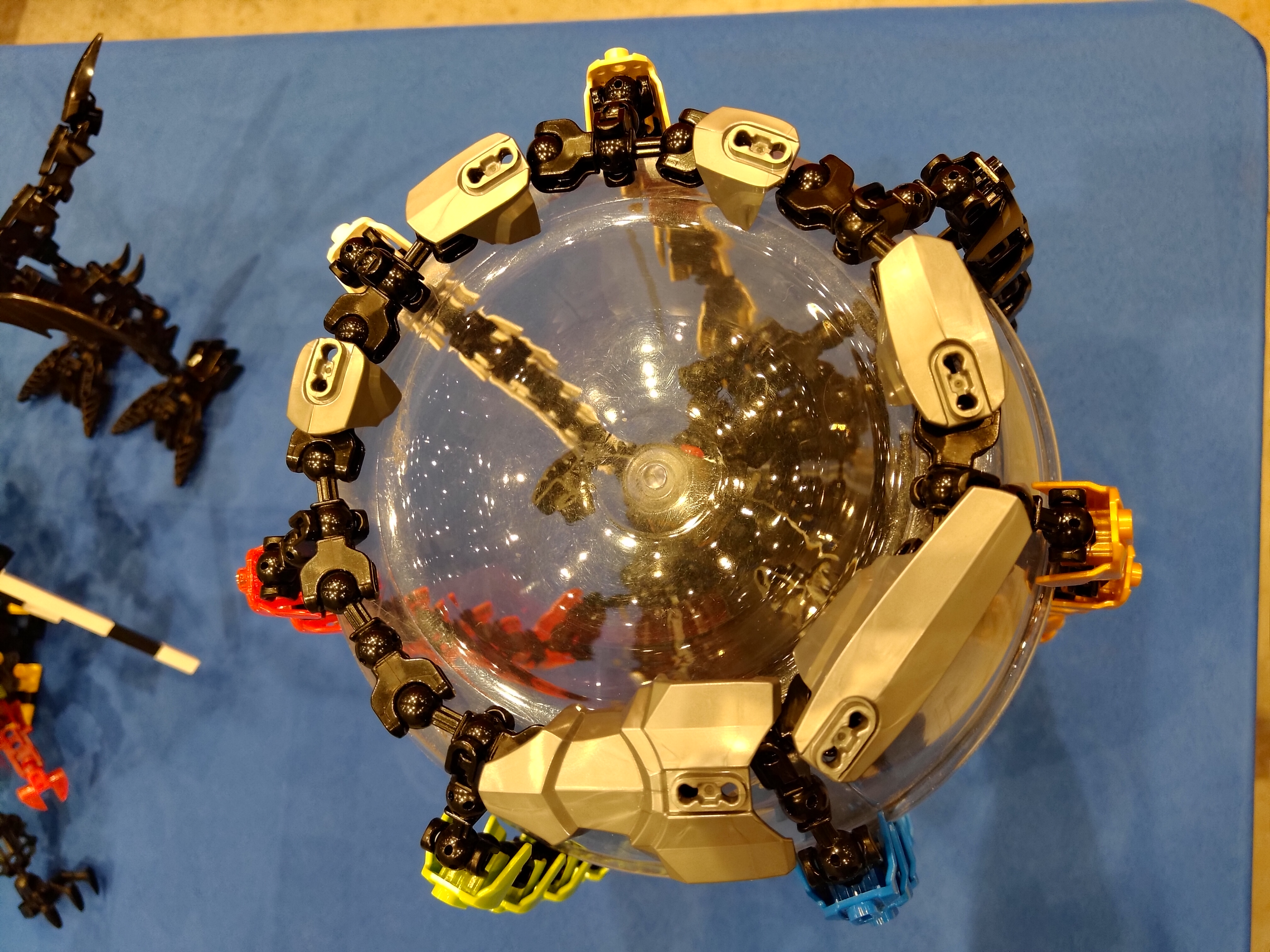 Following in the traditions of the product container being used as a building element, I wanted to make use of a BIONICLE Part Tub. I wanted to make a Makuta character trapped in a protodermis cell. I originally envisioned the container just sitting in a technic base with spikes reaching up to grab the sides of the container, but I realized the CCBS pieces could be used to convert the whole container into a fairly solid building platform for this and other ideas. I plan to make a more menacing Makuta to fit inside, but for now I’ve just stuffed my MNOGKuta inside. There’s not muck to say design wise, it’s two rings of 14 CCBS arms, with bars of CCBS arms every other arm on the two rings, forming 7 bars. I decided to capitalize on this to represent the 6 original toa plus takanuva’s colors on the “bars”. If some of the spots seem bare, I am currently short on some CCBS shells.