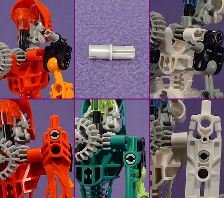 The first picture shows a system that only requires one piece for each TOA, and it will work for TAHU, LEWA, and KOPAKA. All you have to do is take a #2 plus-rod/pin combo and stick it in the back of the TOA’s shoulder joint. Stick the weapon on it, and you’re done. The big problem with this setup is that the weapon hangs straight down, whereas the videos show them angled from the right shoulder to the left hip. I mentioned this problem to Brent, and he came up with an idea for a sling that will combine with the pin mount to hold the weapon at just the right angle. If you stick a #2 plus-rod in the hole right underneath the gear system, you can attach a unit consisting of a #6 coupler, another #2 plus-rod, and a #5 coupler to it. The TOA’s weapon then hangs inside the resulting loop, and attaches to the shoulder pin. I found that this loop will work fine for LEWA, but to get it to work with KOPAKA, you’ll need to switch the #5 coupler at the bottom of the unit with a #4 coupler to fit the width of his sword-blade. Unfortunately the sling won’t work with TAHU unless you flip his shoulders to look like KOPAKA’s. Because his shoulder joints are flatter than those on KOPAKA or LEWA, his weapon won’t fit in the angled position. One way to get around that would be to replace the plus-rod/pin piece with a #3 plus-rod, which would stick out far enough to allow one of the holes on the sword to fit over it. It probably won’t hold it as securely as the pin-style mount, but combined with the sling it should suffice. You can always secure it with a half-bushing if it doesn’t.