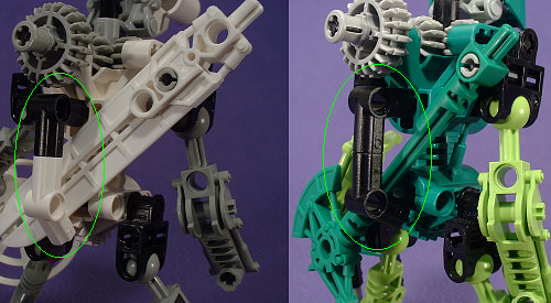 MoD reader Brent Bates submitted two different ideas for how to mount Toa weapons on their backs, similar to how they are shown in the video clips from the TOA mini-CD. Since he was unable to provide good images, I photographed the designs for him.