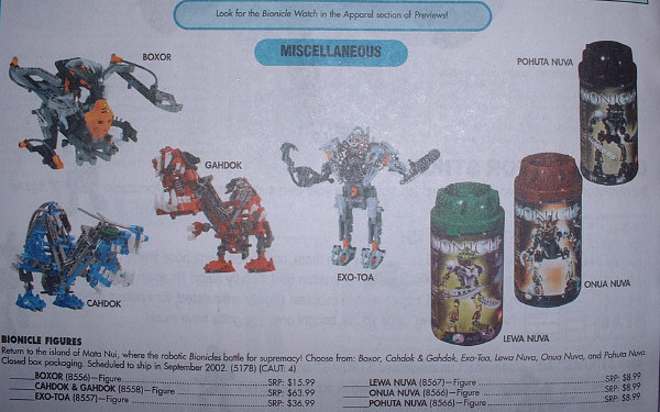 A couple days ago we told you that MoD reader Steve Ney found images of three TOA NUVA cans in the latest issue of Diamonds Preview catalog. Today I dropped by my local comic shop and took a few shots of the page where they are advertised. I’m not sure why they don’t list the other three flavors, but they mixed up the names for ONUA NUVA and POHATU NUVA. However, the BAHRAG appear to be named the same as in the #6 comic.