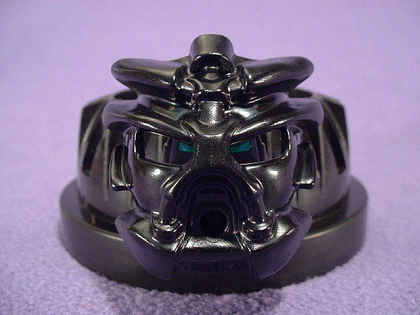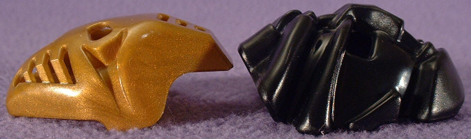 Here’s a closeup of ONUA NUVA’s MASK, and at the request of one of our readers, a pair of comparison shots. Unlike the PAKARI, which was my second favorite KANOHI shape, I’m not nearly as pleased with this KANOHI NUVA. I look at the eight KRANA shapes, and I can see how they all need to have a similar shape, so they can fit in the brainpans, but there’s still quite a bit of variety between them all. Here, the KANOHI NUVA worn by ONUA NUVA, POHATU NUVA, and LEWA NUVA all have a similar profile, with large folds running around the edges. They all look like variations on the same theme, while the other three KANOHI NUVA have vastly different designs. Anyways, on the comparison shots, you can see that the ONUA NUVA MASK is not significantly larger than ONUA’s PAKARI (as most of it can be hidden behind a PAKARI), but the folds create an illusion of extremely large size. The side profile is even closer in size to the PAKARI’s than the front profile. One thing to note, however, is that the walls of this KANOHI NUVA are considerably more rigid than those of the PAKARI, though they don’t actually appear to be significantly thicker.
