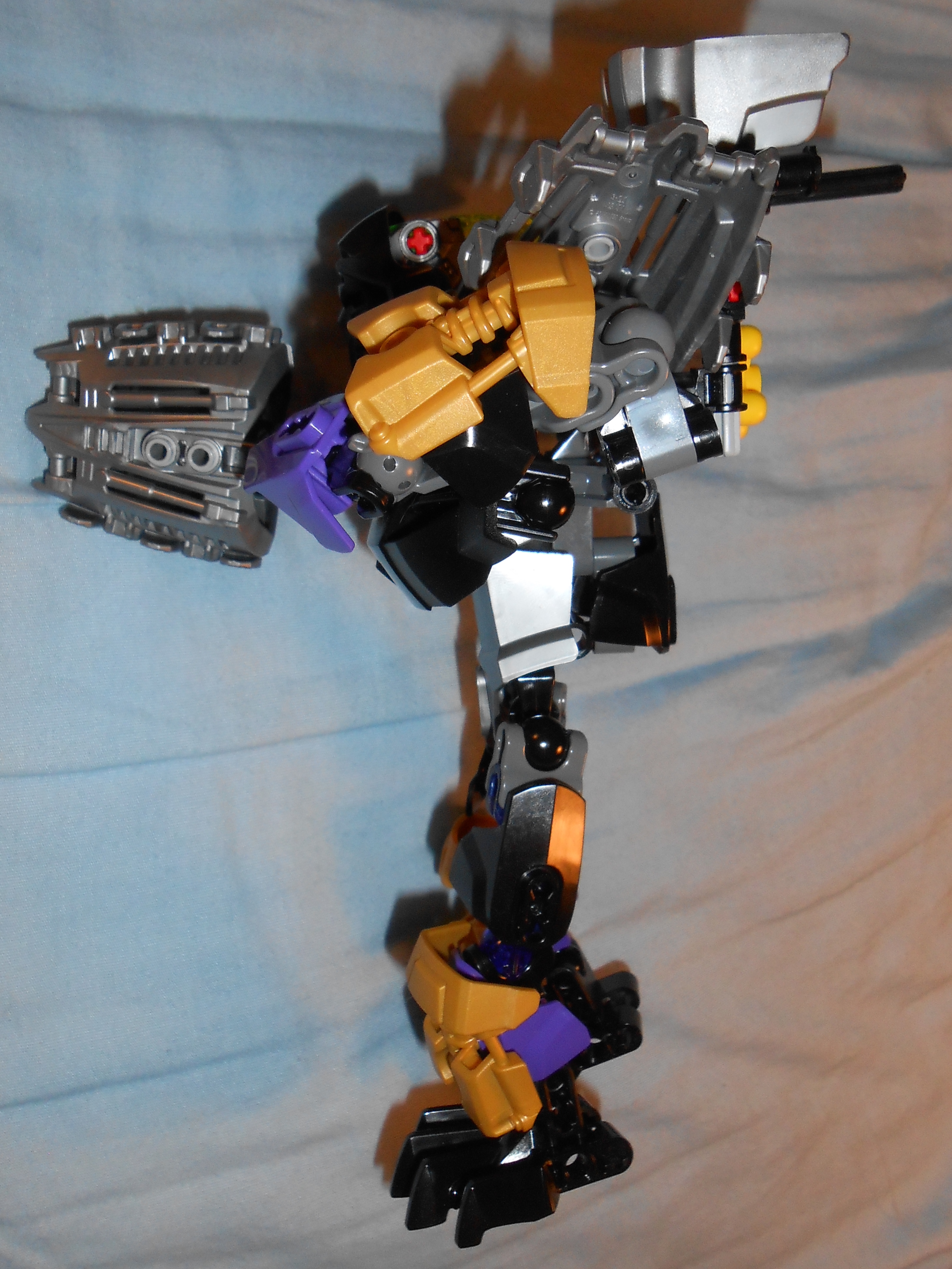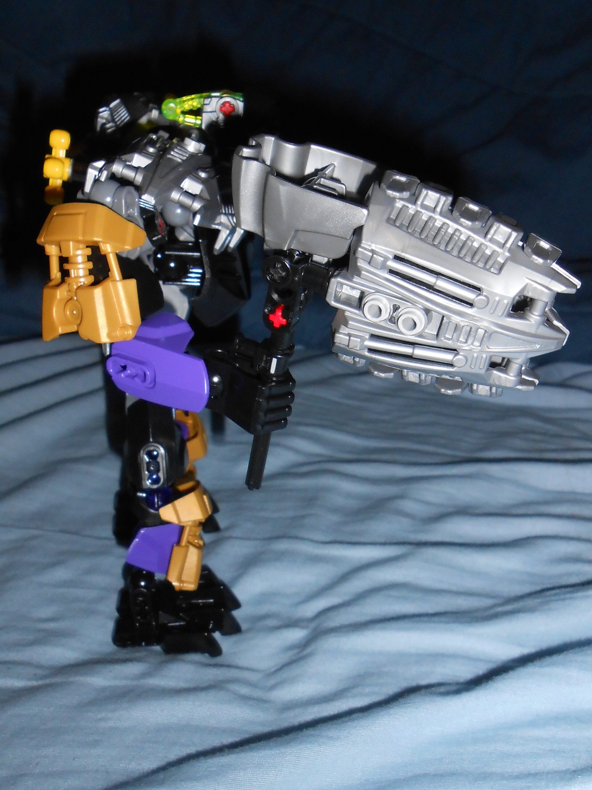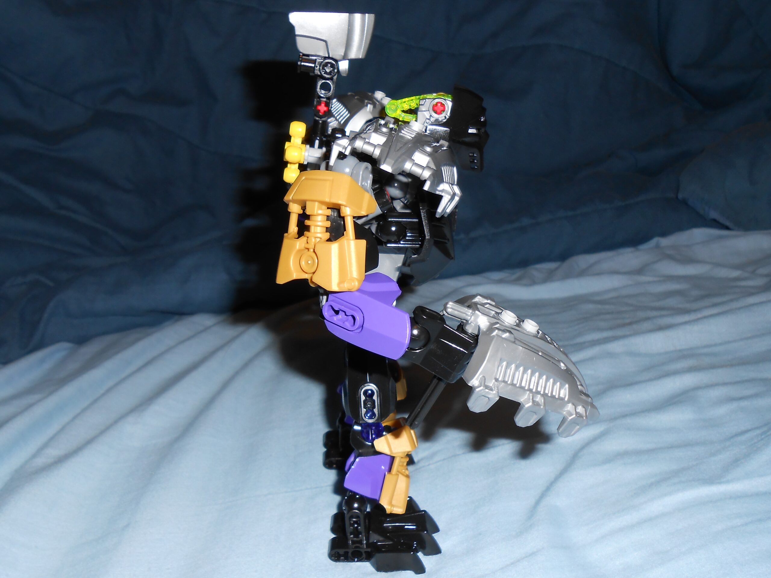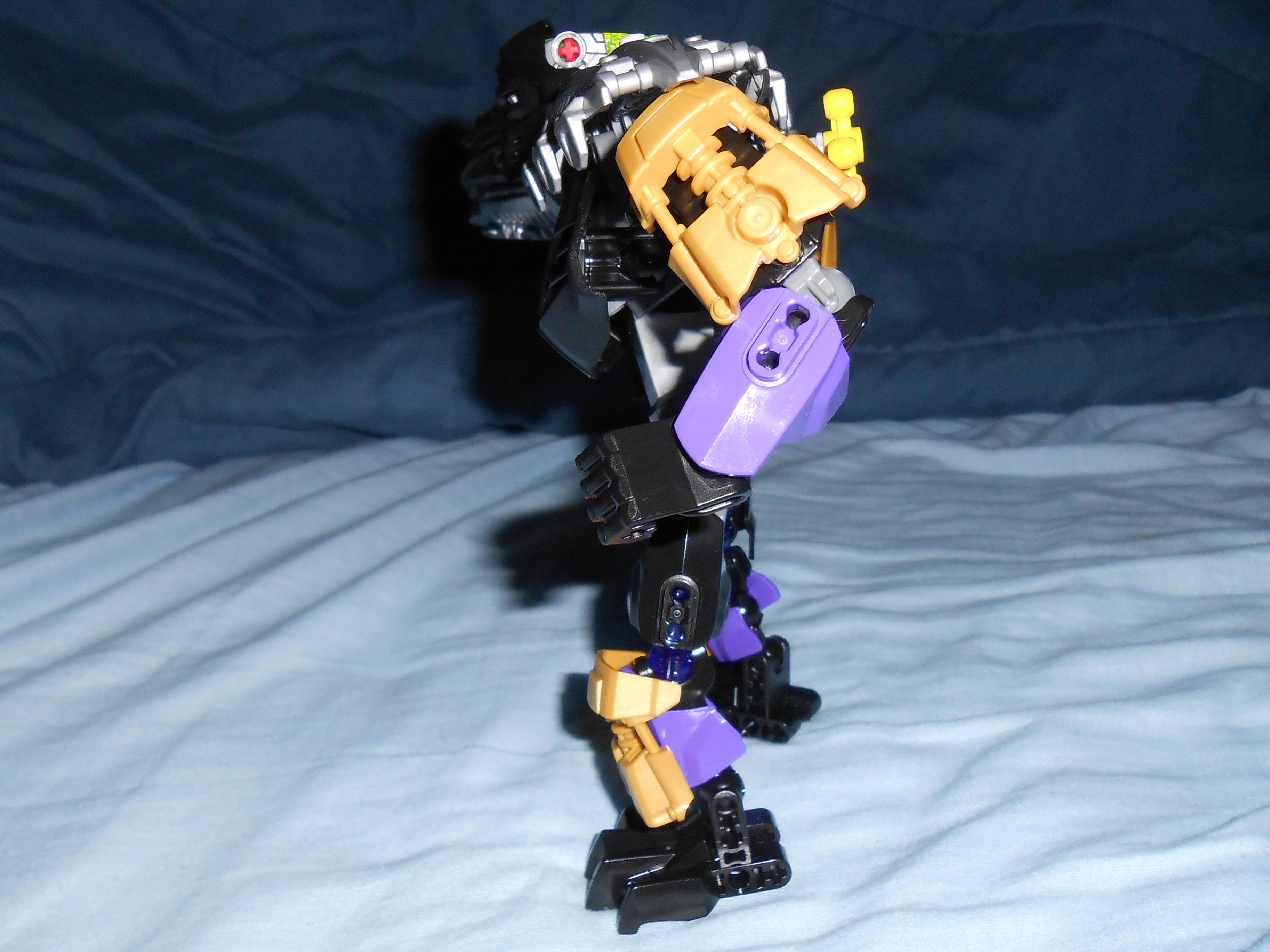 Focusing on his color scheme for a moment, the gold is there purely for blending in the color of his alternate mask, and I like the idea, but he’s almost got too many colors going on. At the very least, I would have swapped the gold and purple colored armor plates with each other’s color, and make all the skeleton parts that beautiful shade of transparent purple seen in his upper leg.