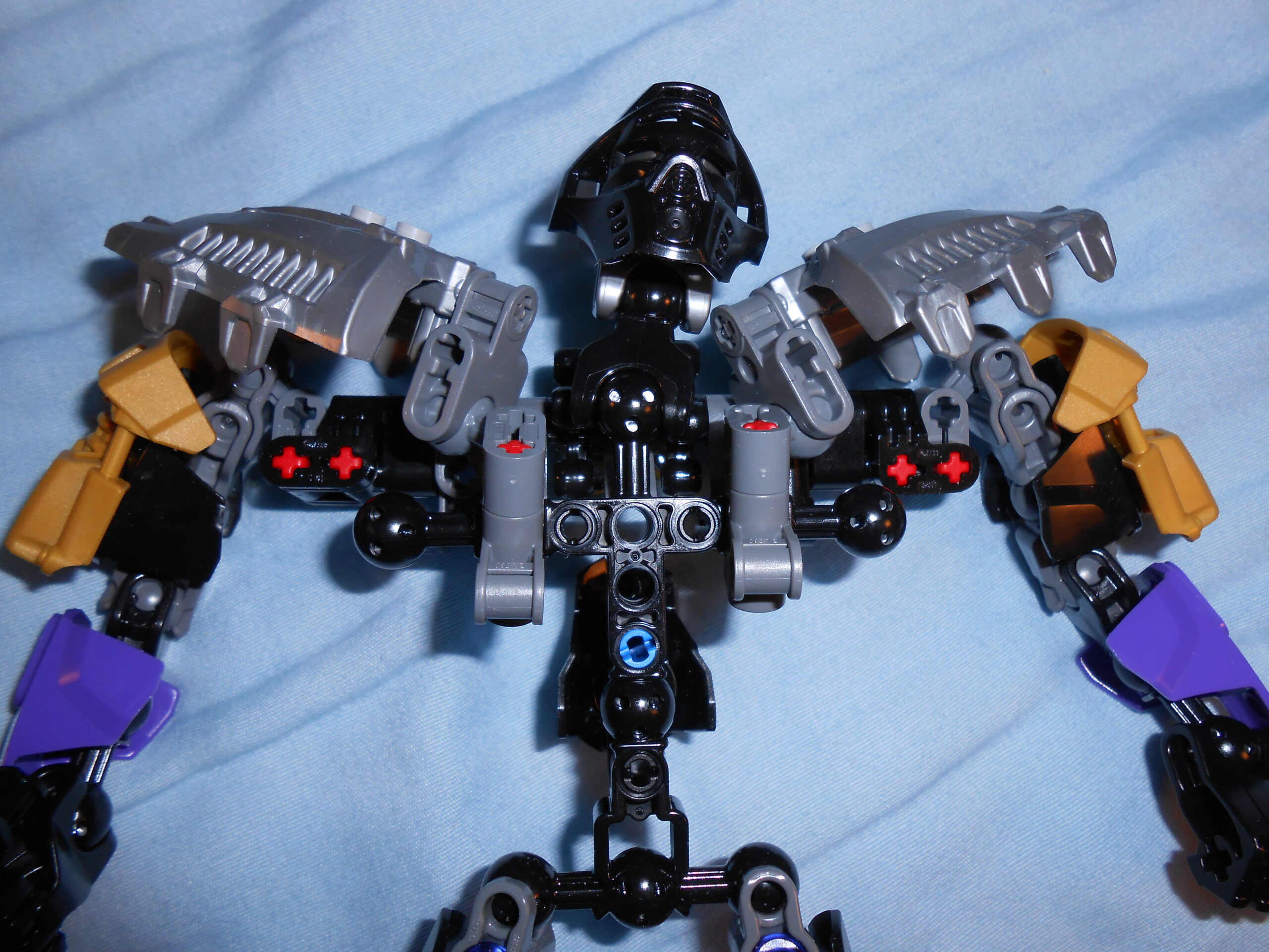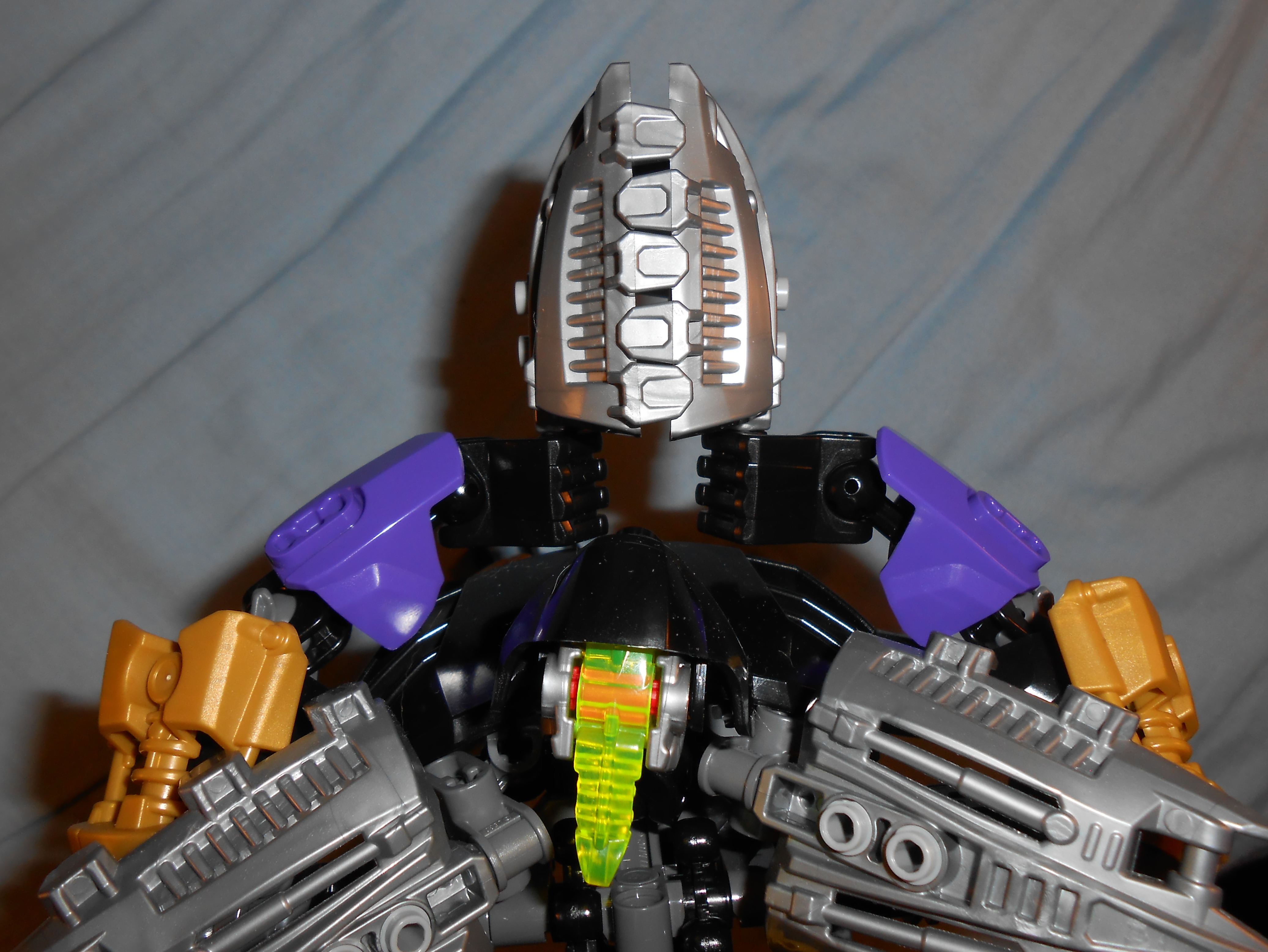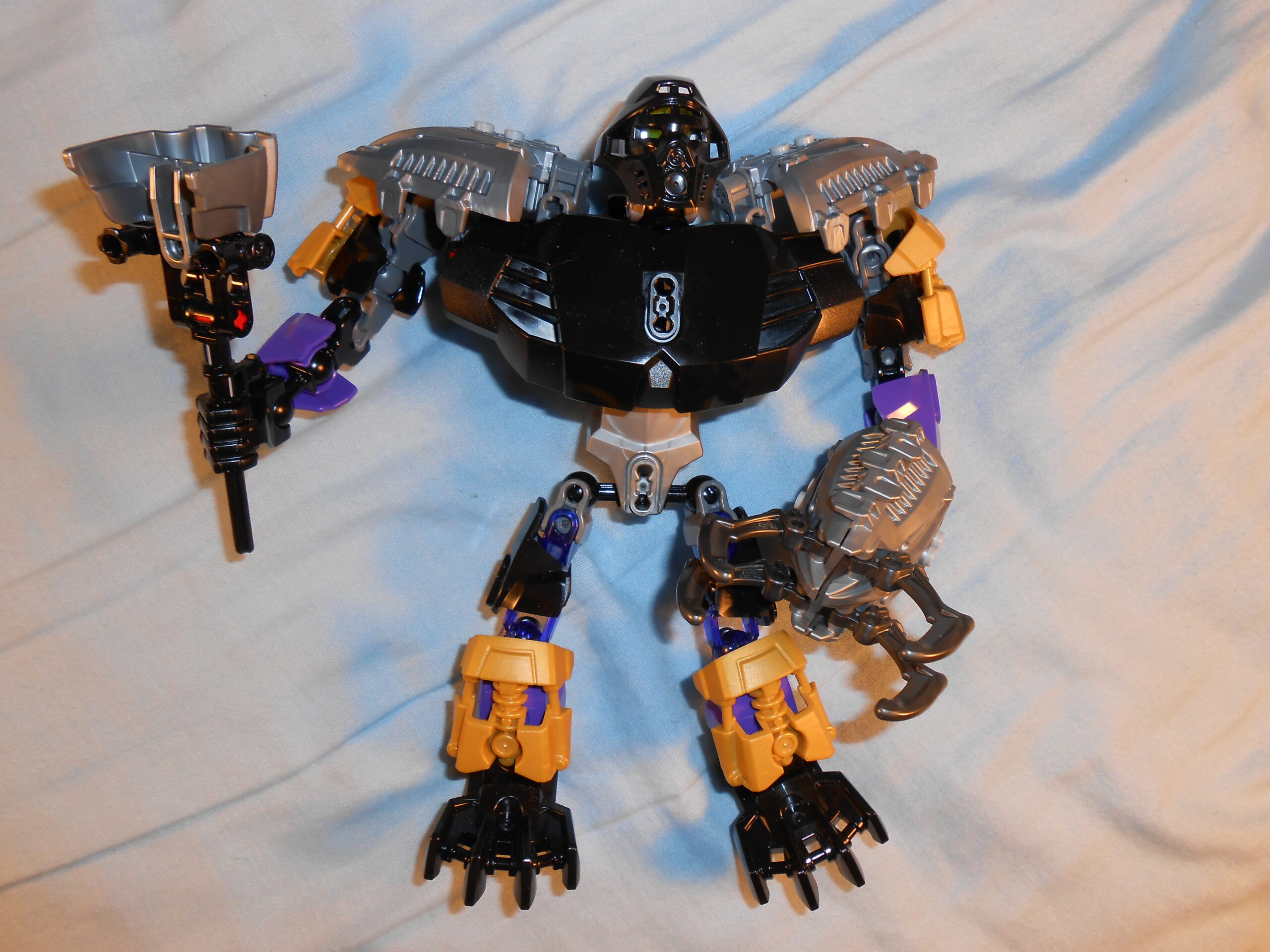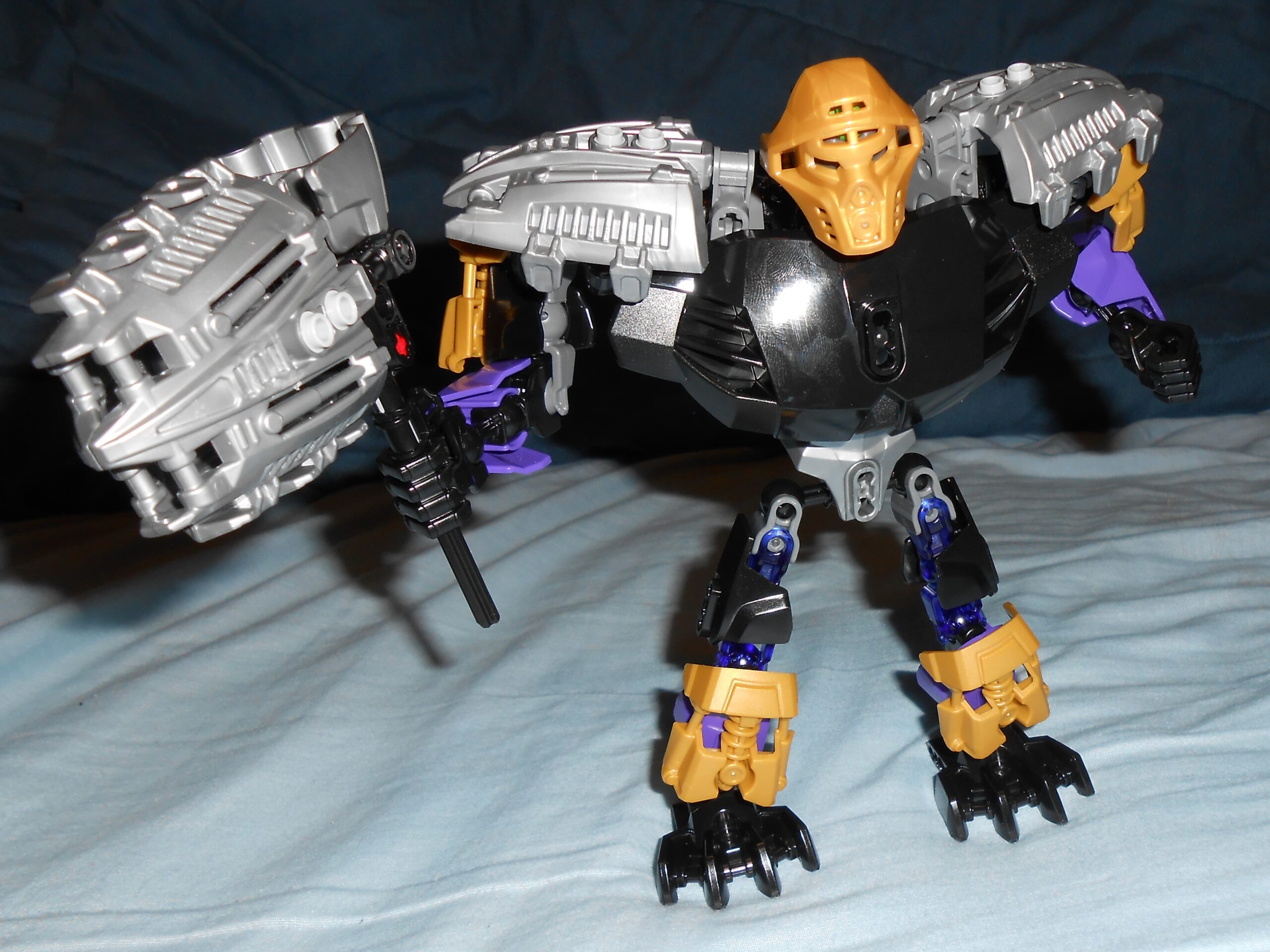 Focusing on his color scheme for a moment, the gold is there purely for blending in the color of his alternate mask, and I like the idea, but he’s almost got too many colors going on. At the very least, I would have swapped the gold and purple colored armor plates with each other’s color, and make all the skeleton parts that beautiful shade of transparent purple seen in his upper leg.