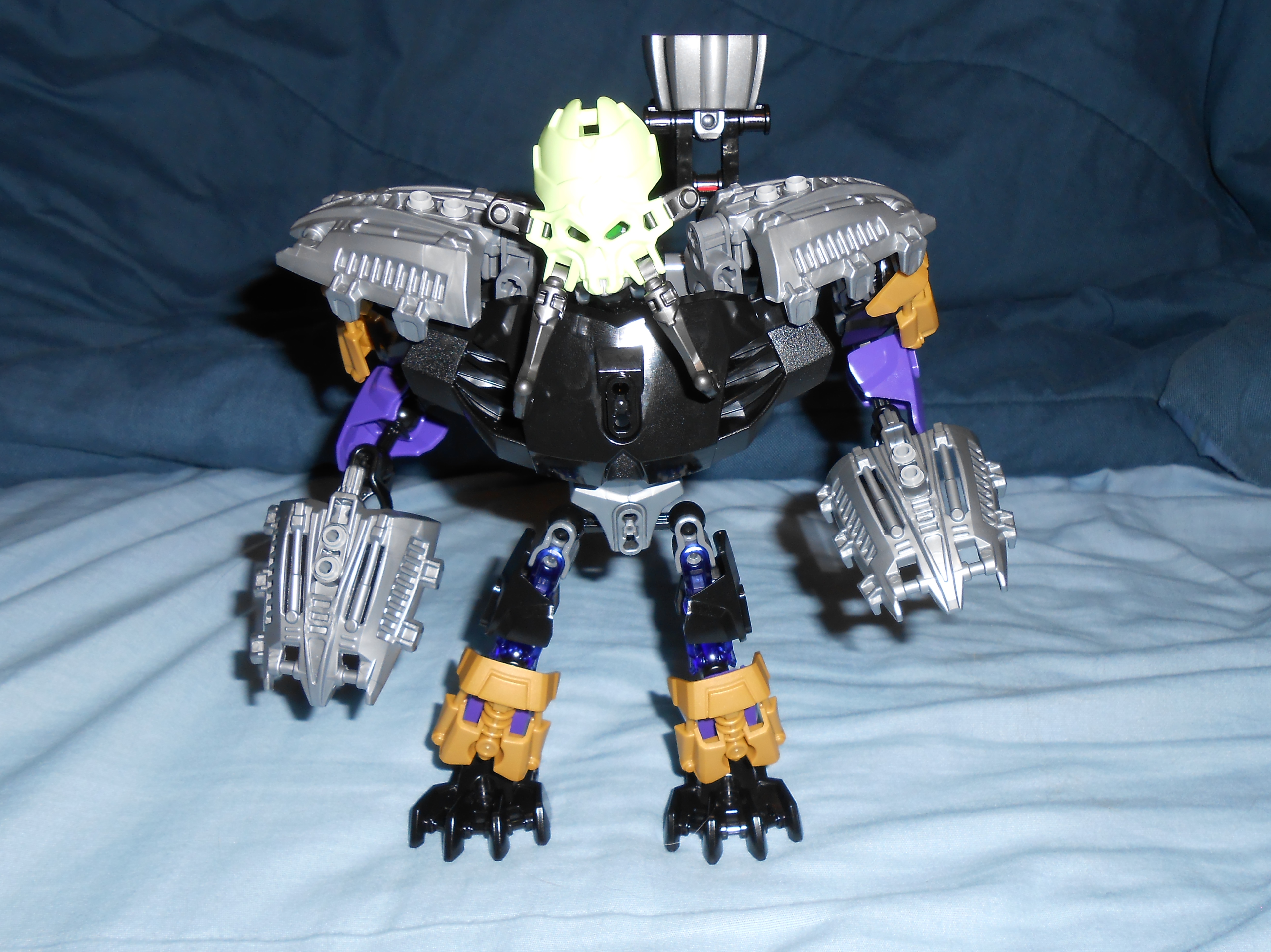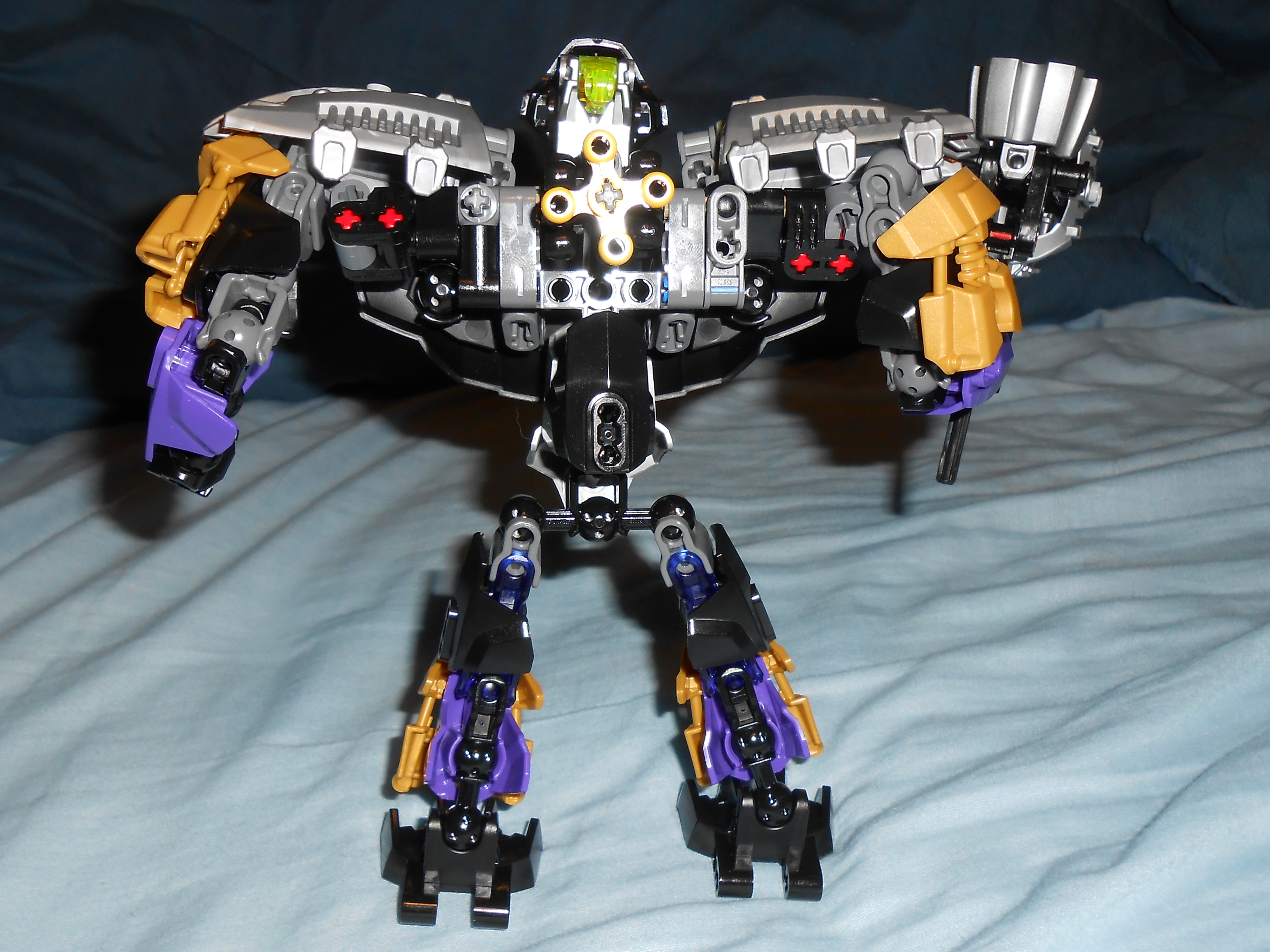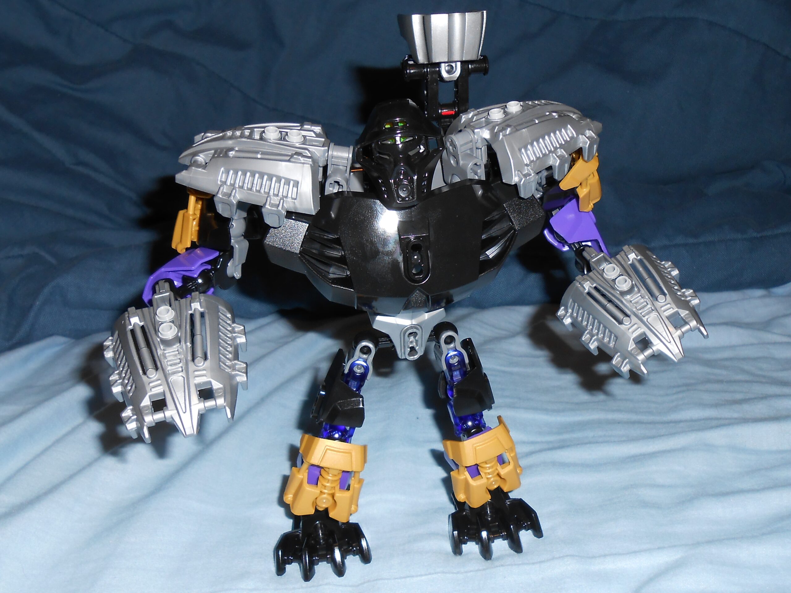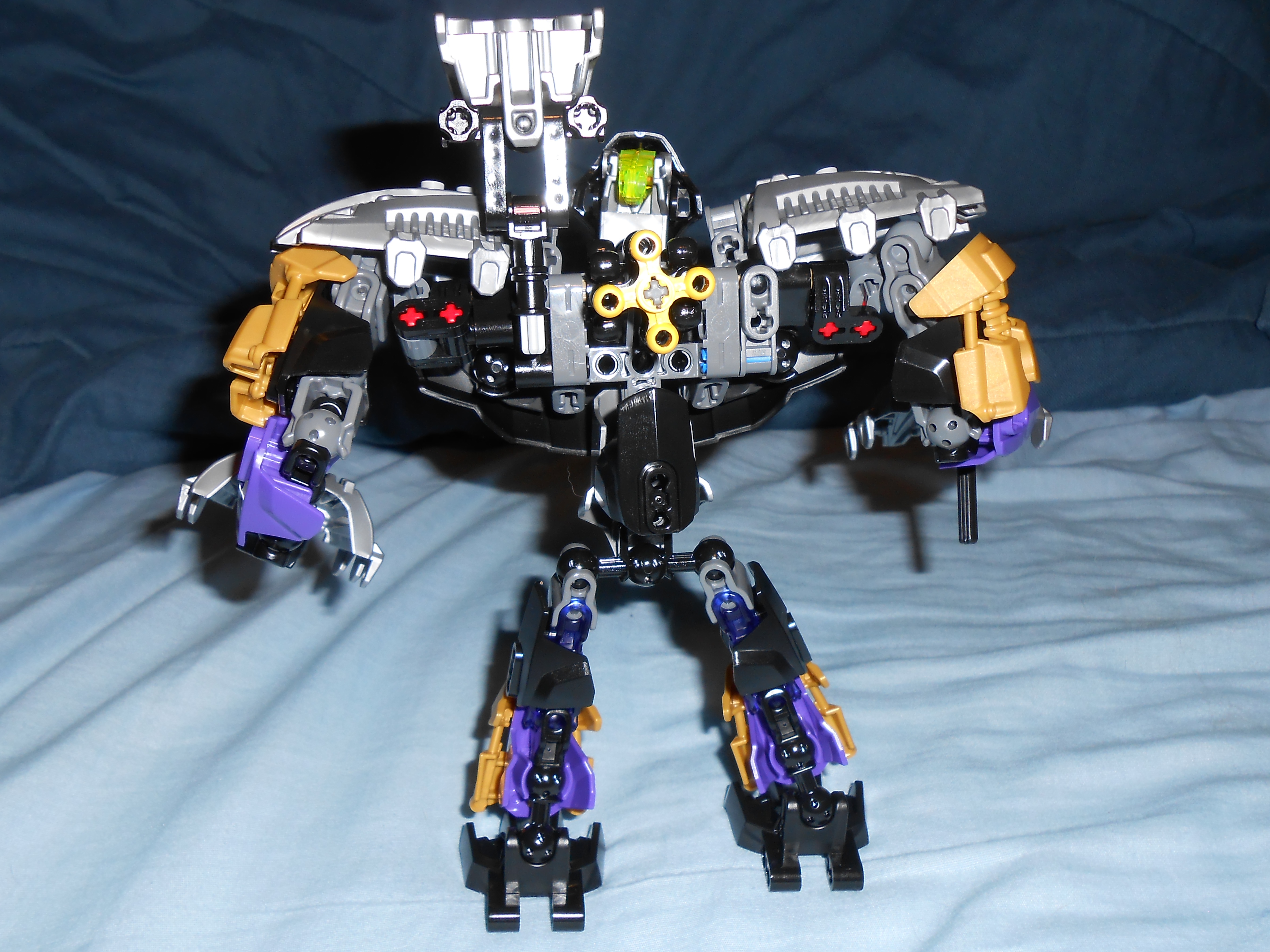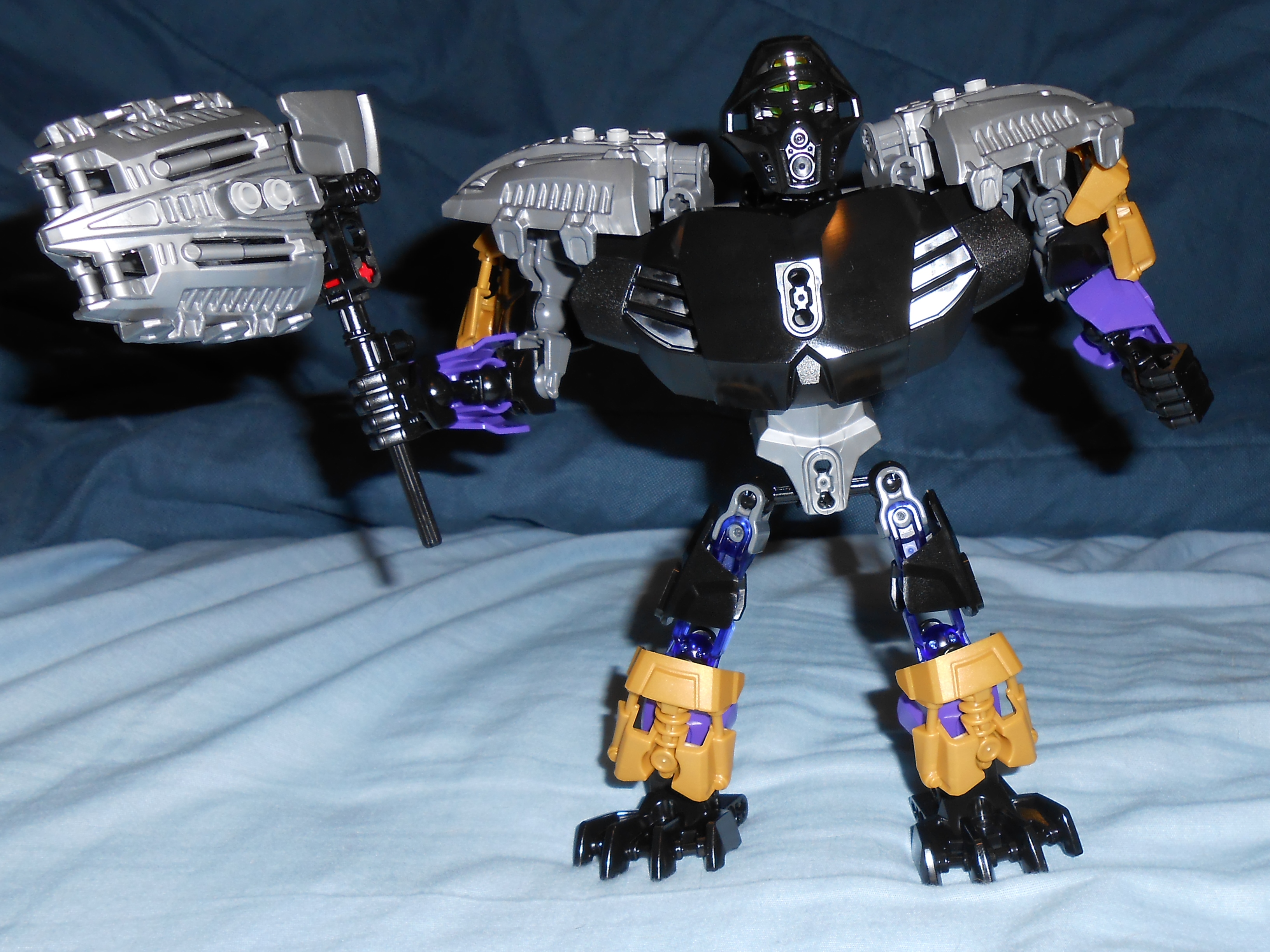 Focusing on his color scheme for a moment, the gold is there purely for blending in the color of his alternate mask, and I like the idea, but he’s almost got too many colors going on. At the very least, I would have swapped the gold and purple colored armor plates with each other’s color, and make all the skeleton parts that beautiful shade of transparent purple seen in his upper leg.