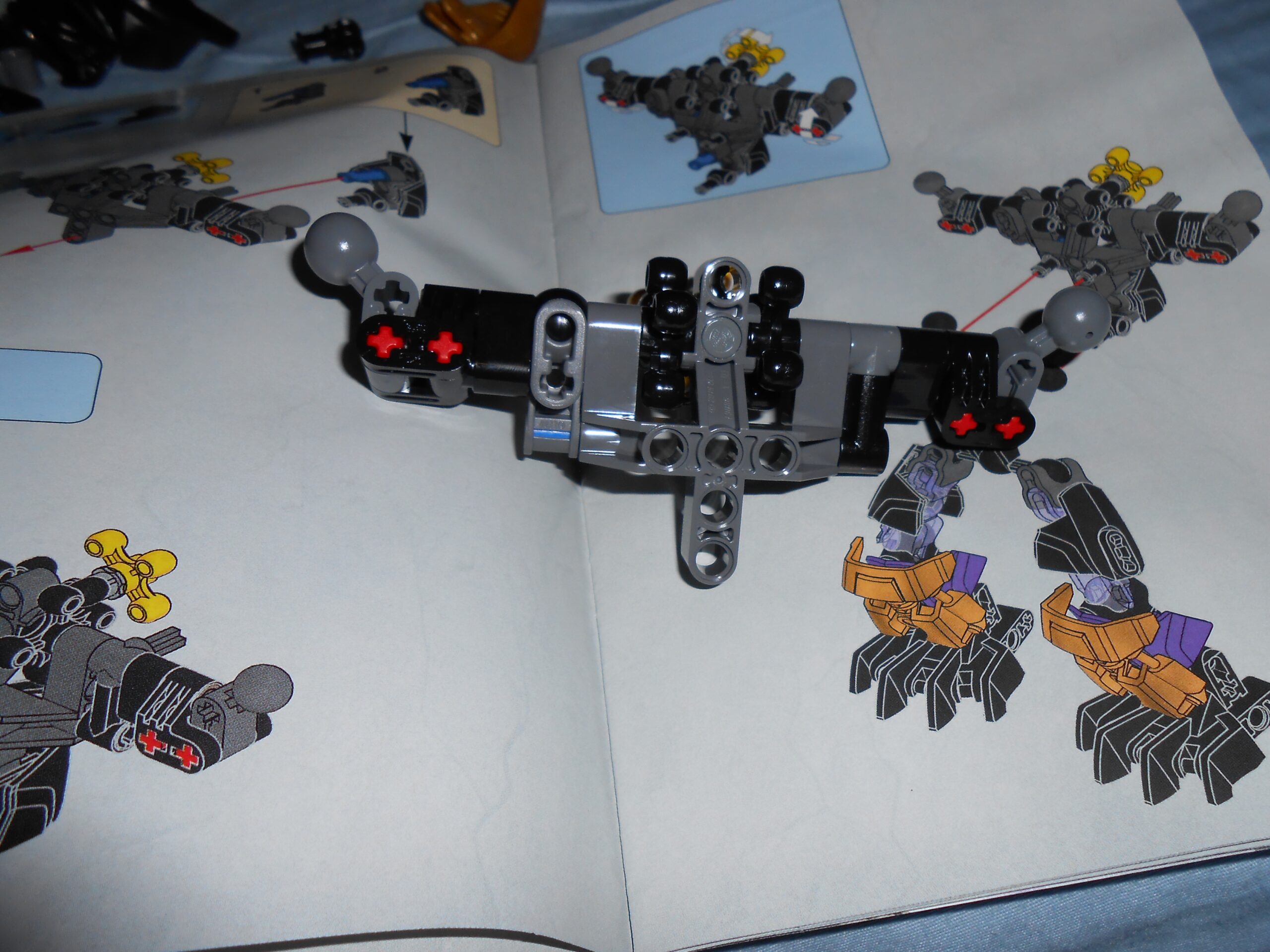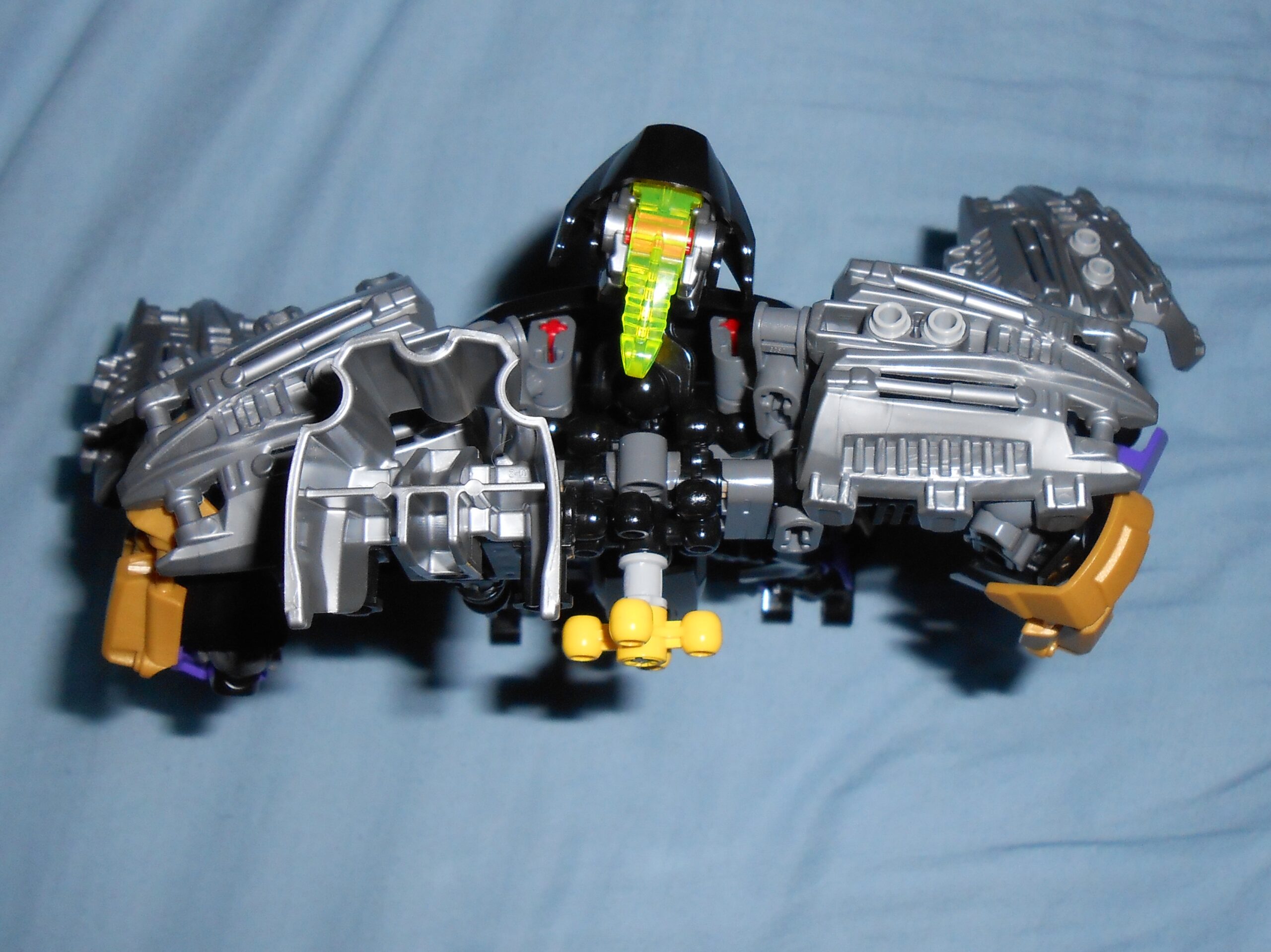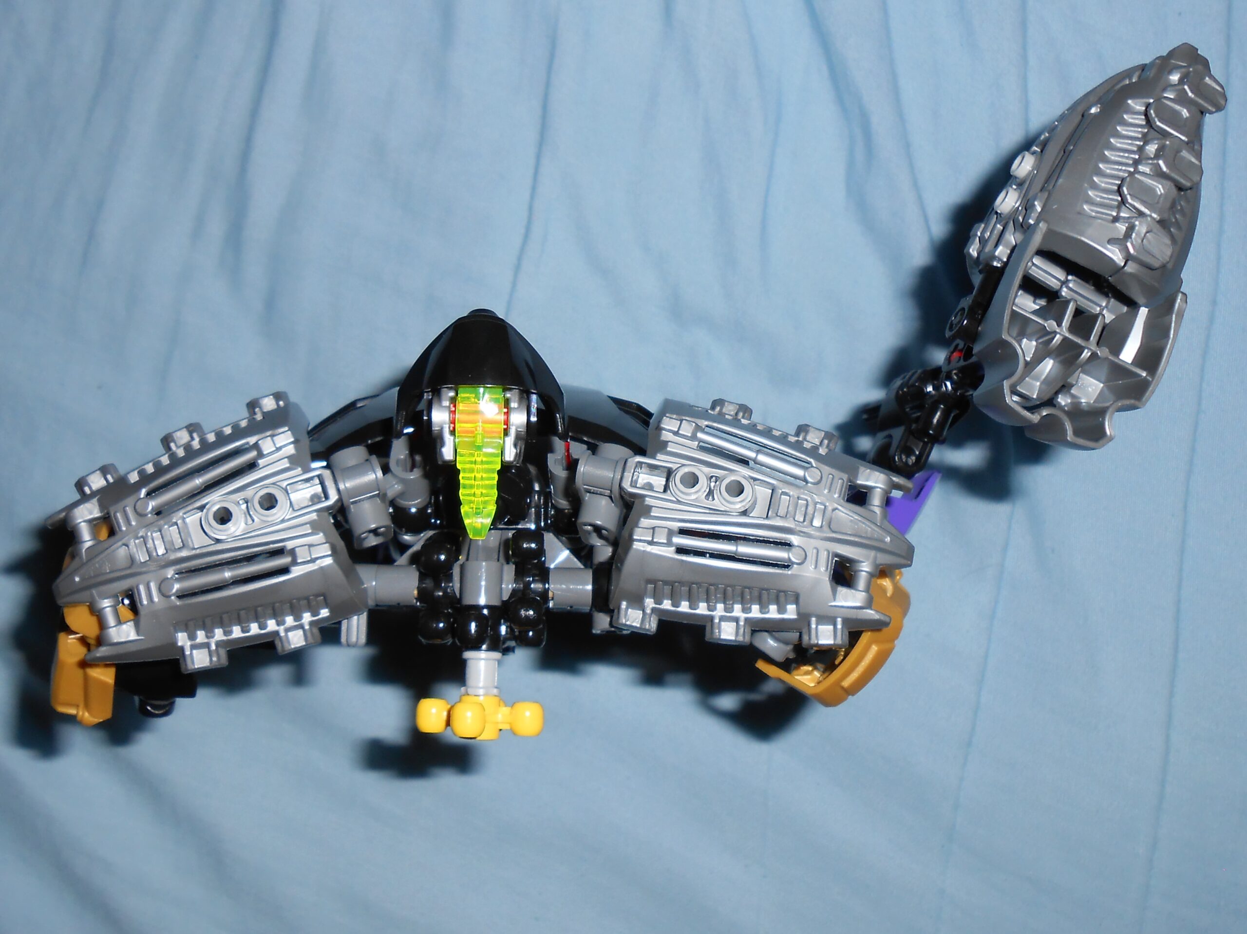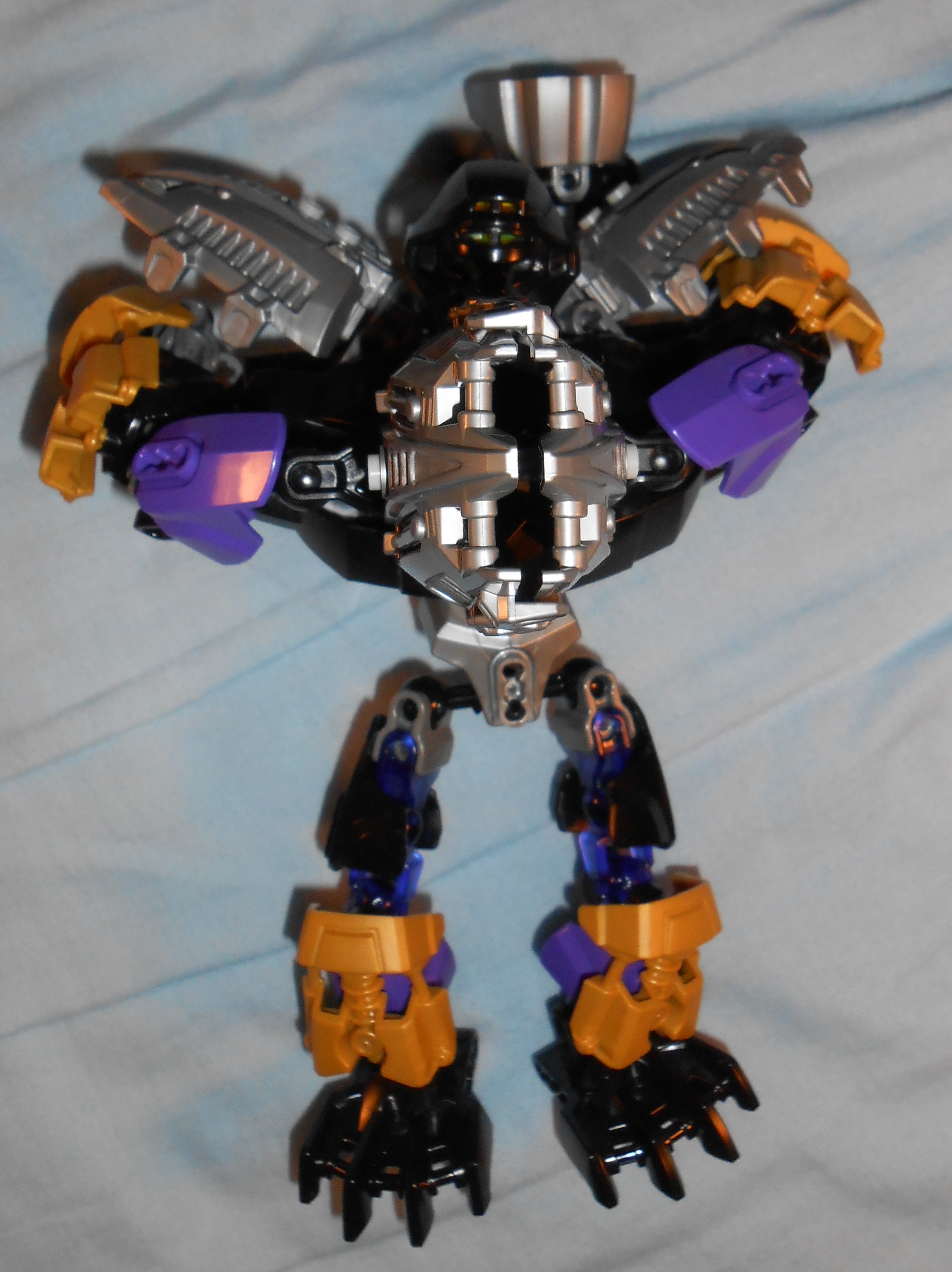 Focusing on his color scheme for a moment, the gold is there purely for blending in the color of his alternate mask, and I like the idea, but he’s almost got too many colors going on. At the very least, I would have swapped the gold and purple colored armor plates with each other’s color, and make all the skeleton parts that beautiful shade of transparent purple seen in his upper leg.