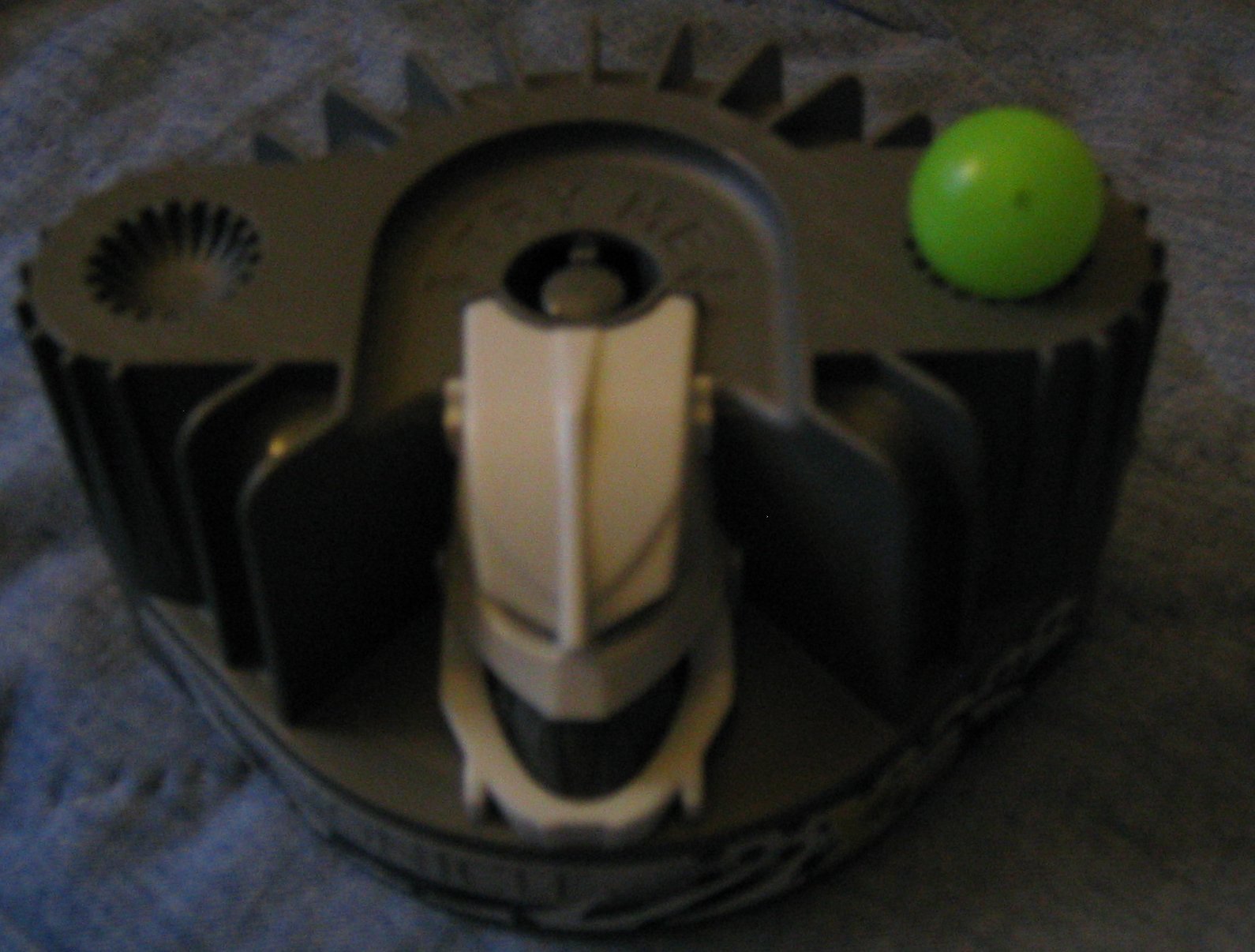 Each PIRAKA comes with a ZAMOR gun that matches the color of their torso and tool, and in some cases their toes too, so you get more than just that shade of silver and you need not worry about expansion packs to get other colors (as the ZAMOR packs do not include a launcher anyway), the downside being only the three colors, silver, gunmetal, and yellowish gold, which don’t necessarily match your custom toa. The gun itself is T shaped, with the bottom of the T having three prongs that hold the ZAMOR in place, though it’s more of an open topped box, so once loaded you can turn it upside down to dump out the ZAMOR. The “bottom of the box” just holds it in place while the sides are what the ammo pushes against to build energy for launch. This open topped design leaves much potential, as it wouldn’t be too hard to make a gravity loading ammo clip for firing lots of ZAMORS, it even has a plus slot that makes a perfect spot to attach such a design. The top of the T has three plus holes, one of which, the middle one, does not apply friction to the plus rods so the rods can push trough and shove the ZAMOR through the energy building clips. The plus holes to the left and right are for a rubber rod with a (1) size axel to hold the pushing plus rod in place, and it also doubles to spring the rod back out and prepare to fire again, which plays well to the rapid fire ammo clip I mentioned, should you make one and be carefree enough to lob them around the house and be able to find them again. The rubber rod isn’t as stiff as the ones the ‘04 models included, and can be applied to certain tasks they previously could not. Anyone worried about breaking the gun will be happy to know it is actually quite sturdy, the prongs especially. They are more sturdy than I thought the looked, and I think LEGO made them to be a little dense than other launchers, as even the flimsy looking parts wouldn’t bend very much as I applied some force to them. I haven’t thoroughly tested the firing power, but they do get some good distance. The ZAMOR spheres themselves are just hallow marbles, they don’t feel easily broken and are very light. Each PIRAKA comes with four greenish ZAMORS. It’s a downfall that you cant see any sort of symbol on them, except for an occasional of color swirl, other than that the ones in the packaging are all the same. Each one has a small hole on the underside, but it appears that this hole is too small for most LEGO elements, so you will have a rather difficult time making a display rack for these orbs. On the plus side, you at least get two slots on the canister’s lid for displaying two ZAMOR spheres, but considering four come in a can and you only have two slots on the lid, well you’ll likely wind up making a sort of mini bowling ball rack to hold them…Now that I think about it that’s a simple solution to your display rack problem