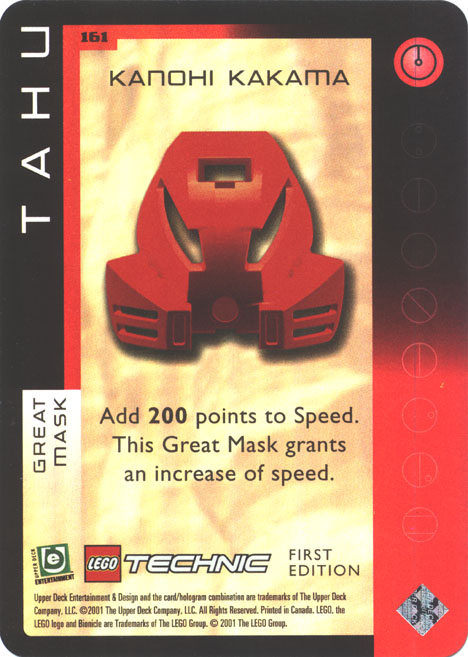 After some time off for our Toy Fair coverage (which will also continue soon), we return to our ongoing look at the Quest for the Masks Collectible Card Game cards. This is card 161, the first of the “Ultra-Rare” foil cards: TAHU’s KANOHI KAKAMA.