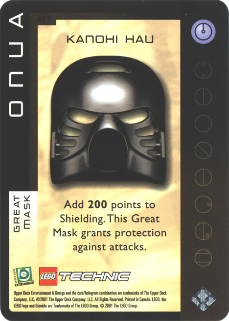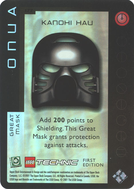 The Quest for the Masks Collectible Card Game cards contain one notable misprint: an unfoiled card 177. Supposed to be another “Ultra-Rare” foil card, it is neither. Instead, it is often found in the same places where card 66 should be. Card 66 is exactly the same as the misprint card 177 except that it adds only 100 points to Shielding instead of the 200 points added by card 177.