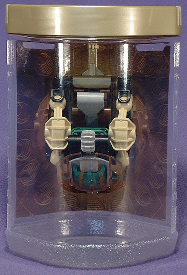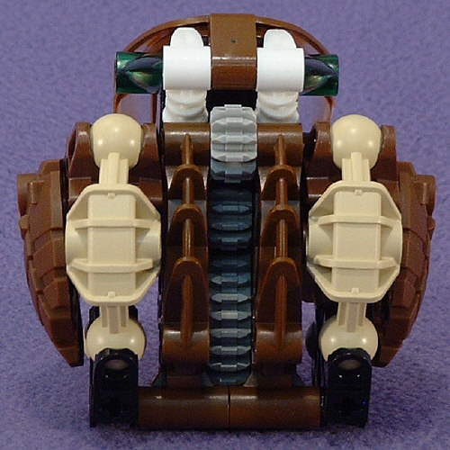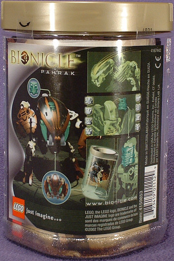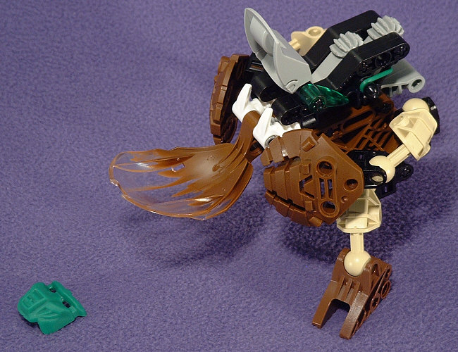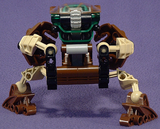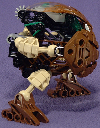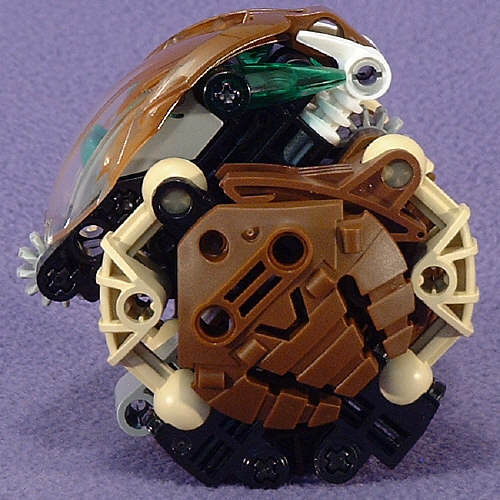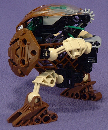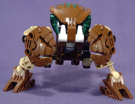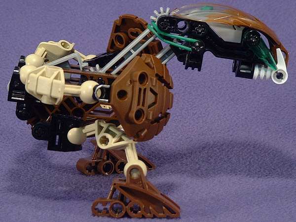 Above we have shots of PAHRAK from the front, left, back, and right. Something about the look of this guy almost demands that he be posed very low to the ground. I’m not sure if this was the intent, but the hand-shields seem to be designed to look like some sort of harmonic wave generator, which would fit with his attack forms in the Desktop BOHROK program. I’m not really fond of the green accents with the brown body, but at least the rubber band matches the KRANA.