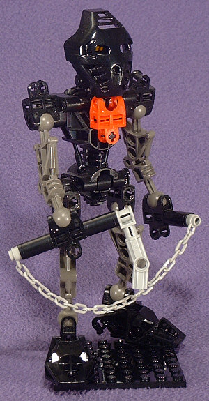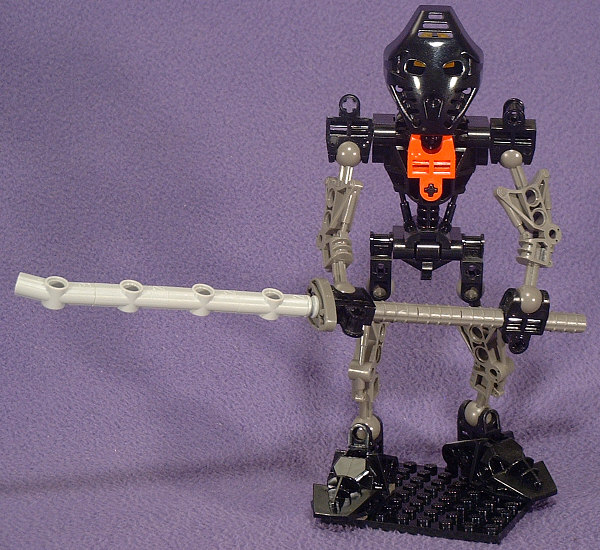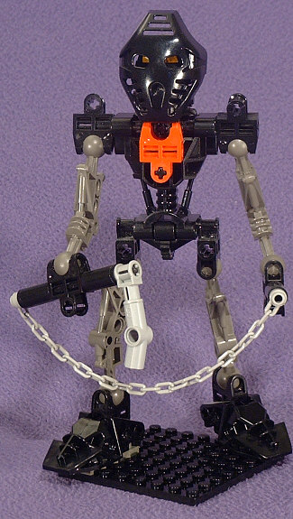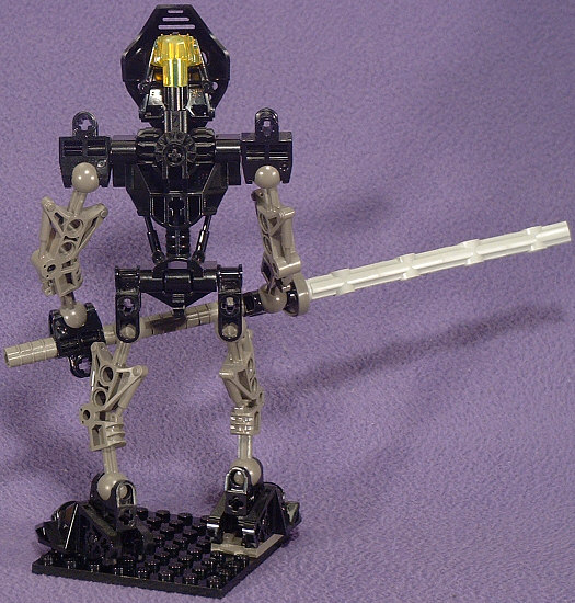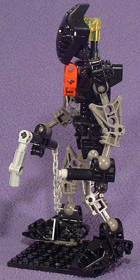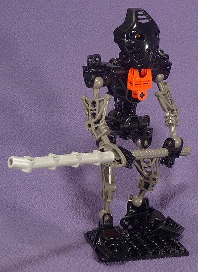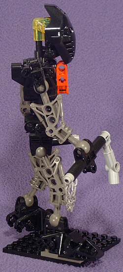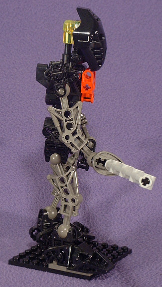 The animated Foot Ninja have dark-grey torsos, boots, and gloves with black sleeves and leggings. Unfortunately, we never got a dark-grey TOA torso (and now it’s too late), so I reversed those colors. The head stayed black with gold eyes, and a red hip-joint mounted GALI-style serves to represent the Foot symbol on the chest.