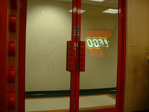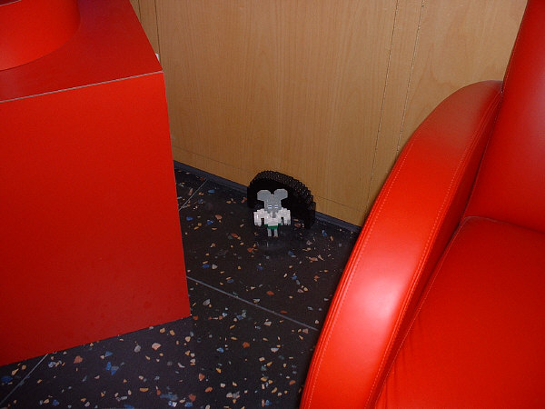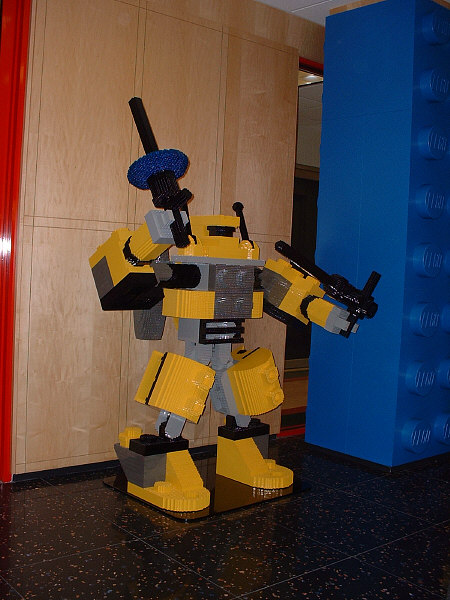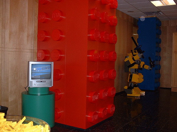 It’s pretty hard to miss the LEGO® showroom, as the doors to the reception area are decorated with handles that are shaped like bricks, and the walls inside are fitted with giant bricks that dwarf any puny little human who walks by. Hidden right inside is a rather impressive brick sculpture of one of the models from the Mini Robots set (last year they had life-sized sculptures of Darth Vader and Harry Potter).