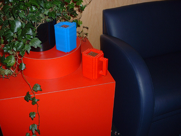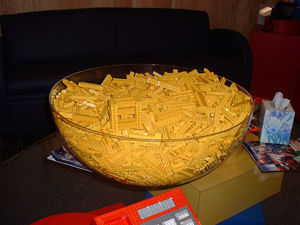 In the center of the waiting area is a large table holding a giant punch-bowl full of yellow bricks, which visitors are free to play with (notice that at least one construction is sitting near the front edge of the bowl), and a red speakerphone sculpture. Sitting on the familiarly shaped end-tables around the room are sculptures of hot cocoa mugs (I know it’s cocoa and not coffee because at least one of them has “marshmallows” in it).