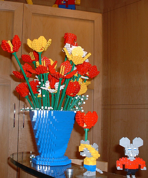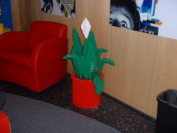 Up above the receptionist’s desk is a very strange looking clock that does actually work (pay special attention to the ceiling panels immediately above it), while over against a nearby wall is a brick-sculpted flower. Sitting on the receptionist’s desk is an intricately designed floral arrangment (Donna prefers if people refrain from touching it, as pieces usually get knocked off as a result), with a few problem “visitors” just standing around nearby. Speaking of which, observant visitors who look behind some of the furniture in the way back corner, you can see where they must have come from (yes, it’s all built with bricks).