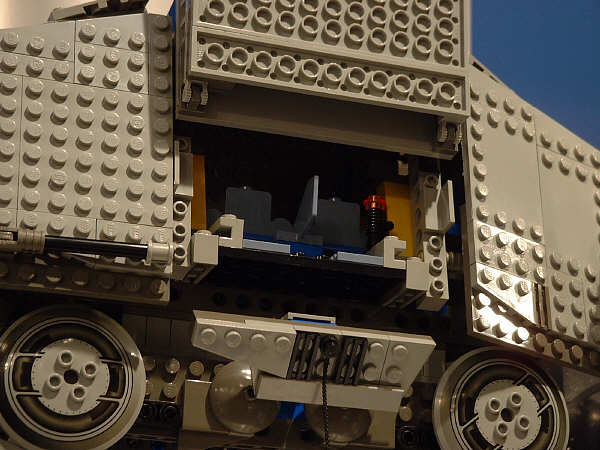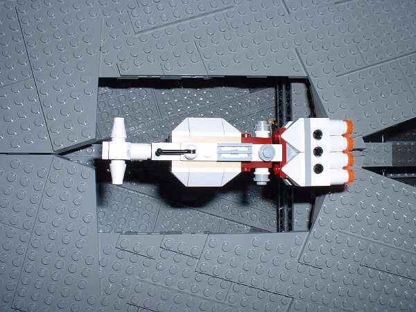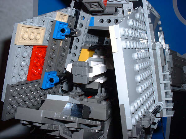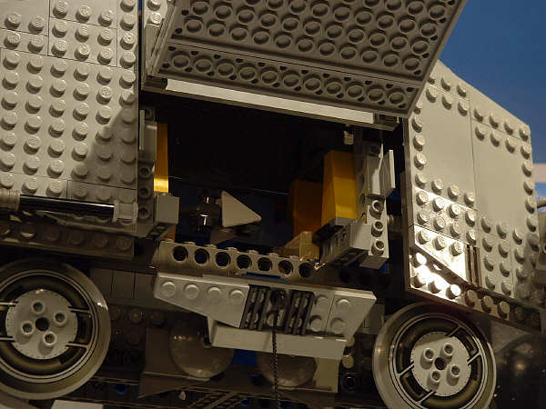 Next is the pilot’s cockpit. Shrunken down to an affordable price-point, the cockpit is too small to fit more than one mini-fig, but for one guy it’s a pretty posh setup. The top flips straight up, the front viewport flips down flat, and the sides straighten out both vertically and horizontally (note that in the right photo the starboard cockpit hull plate is pulled out as far as it will go, which isn’t much).