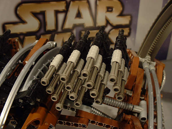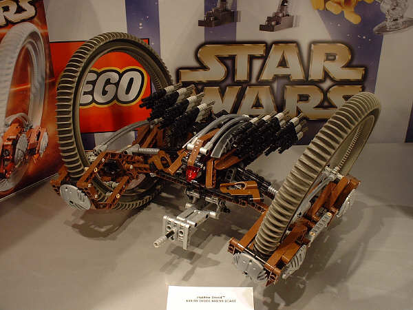 The second most drool-inducing as-yet-unreleased SW set is the Hailfire Droid. Built more in the TECHNIC® style, it still looks as if it’s designed to fit in nicely with the mini-fig line. One odd little detail that was probably overlooked on this model is that the belly gun can be extended a bit, as shown between the two images on the left above. This model does a fair job of balancing itself on two gigantic hubs, though it does rock back and forth a bit when you disturb its rest.