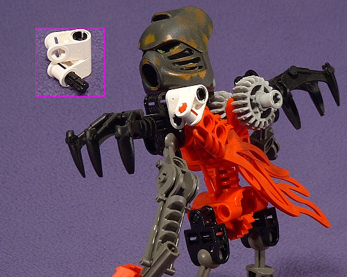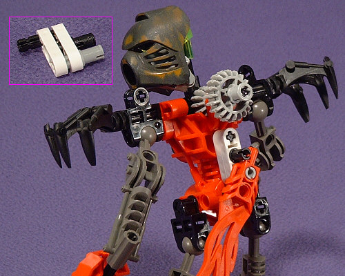 Next, submitted by MoD reader Andrew Bulthaupt, this weapon mount is a bit unusual in that it attaches to the left shoulder. When I asked about this, I was told that since the weapon mount interferes with the gear-driven attack feature, Andrew decided it would be better to put it on the left shoulder. Of course, if you choose to use this yourself, you could always put it on the right shoulder and remove it when the weapon is ‘unsheathed’. The design of this one uses four pieces, consisting of a #2 plus-rod, a #2 black double-pin, and two of those weird little perpendicular joints, such as the one used between WHENUA’s shoulders where the necks are mounted on the other five TURAGA. This unit plug’s into the plus-hole immediately behind the shoulder-joint.