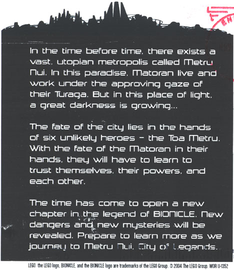 The time has come to open a new chapter in the legend of BIONICLE. New dangers and new mysteries will be revealed. Prepare to learn more as we journey to Metru Nui, City of Legends.