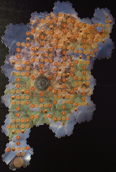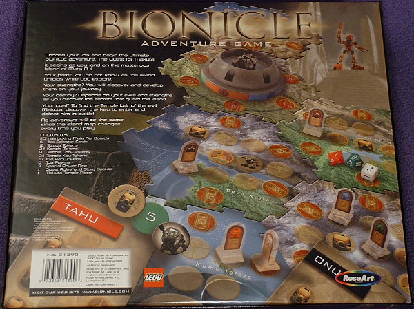 This is not your standard board game. This one has an added element of randomness to throw at you, since you build the game-board as you play, using twenty hexagonal plates about 6 1/2″ across. If you want to build them into the true MATA NUI map, after I figured mine out, I did notice that each connection portal pair is labeled with a different character from the BIONICLE™ alphabet, or one of the number characters. The letters ‘A’, ‘B’, ‘C’, ‘D’, and ‘I’ are each used twice, and the letter ‘L’ isn’t used at all (hence the extra pair of ‘I’s). Anyways, I would highly suggest playing with random map-plates since not knowing where the final goal is will seriously affect game-play.